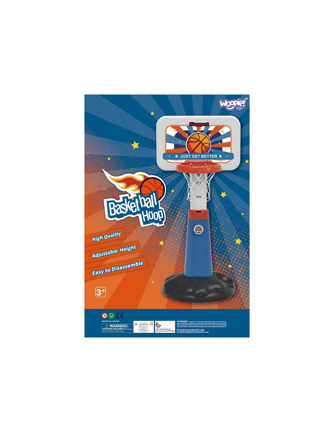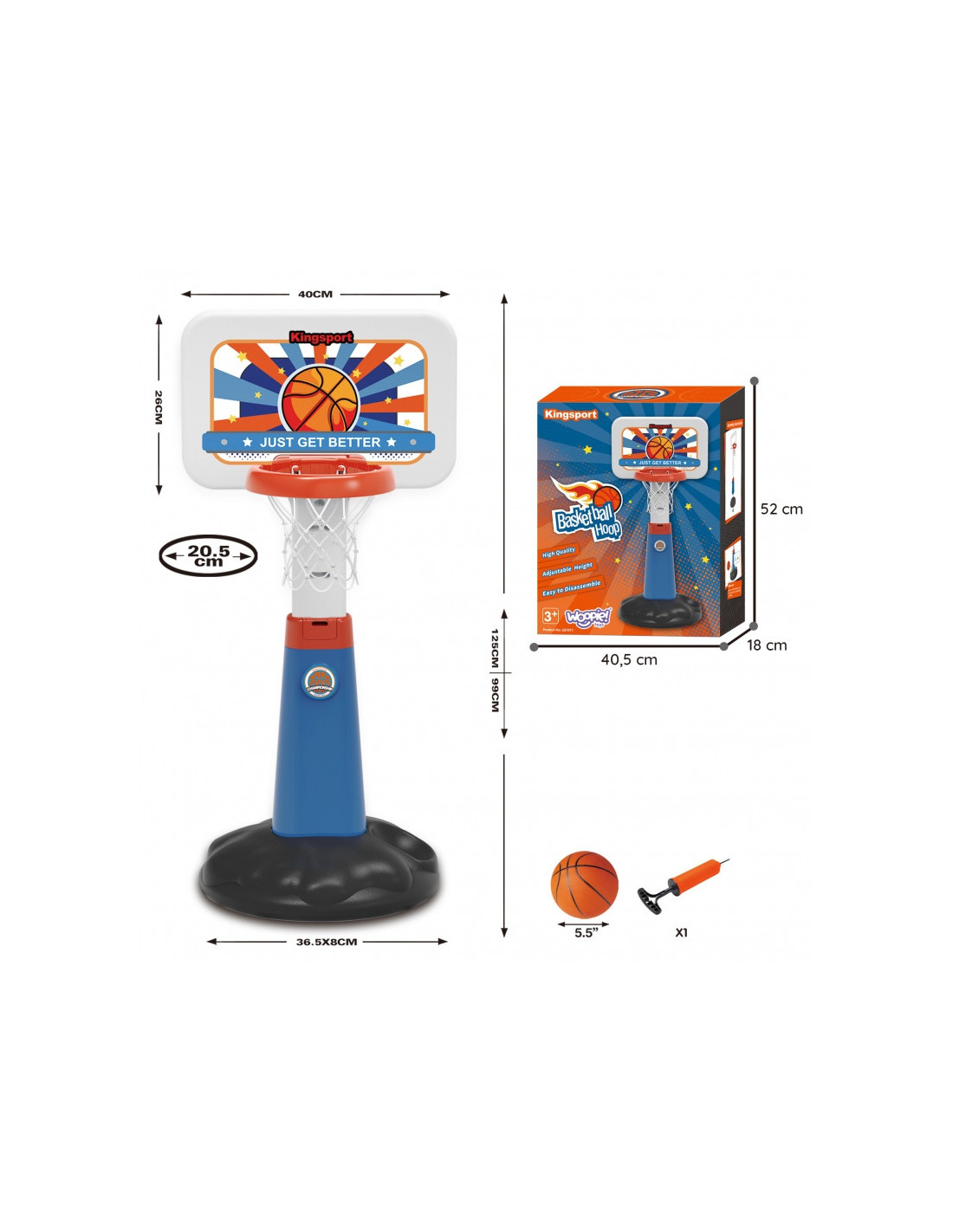 Šis puikus Woopie krepšinio rinkinys su kamuoliu ir pompa yra tobulas sportinis rinkinys jūsų vaikui! Šis rinkinys paskatins jūsų vaiką žaisti sportą. Krepšinio žaidimas padės jūsų vaikui lavinti stambiąją motoriką , kuri idealiai tinka tinkamam vystymuisi. Krepšinio kamuolys auga kartu su jūsų vaiku ir turi reguliuojamą aukštį. Didelis privalumas yra tai, kad jį galima naudoti tiek viduje , tiek lauke – jūsų vaikas galės žaisti bet kokiu oru. Krepšinio kamuolys yra pakankamai didelis ( aukštis: 125 cm ), kad jūsų vaikas galėtų žaisti profesionalius žaidimus su draugais. Po žaidimo kamuolį galite padėti į jam skirtą vietą (šalia pagrindo).