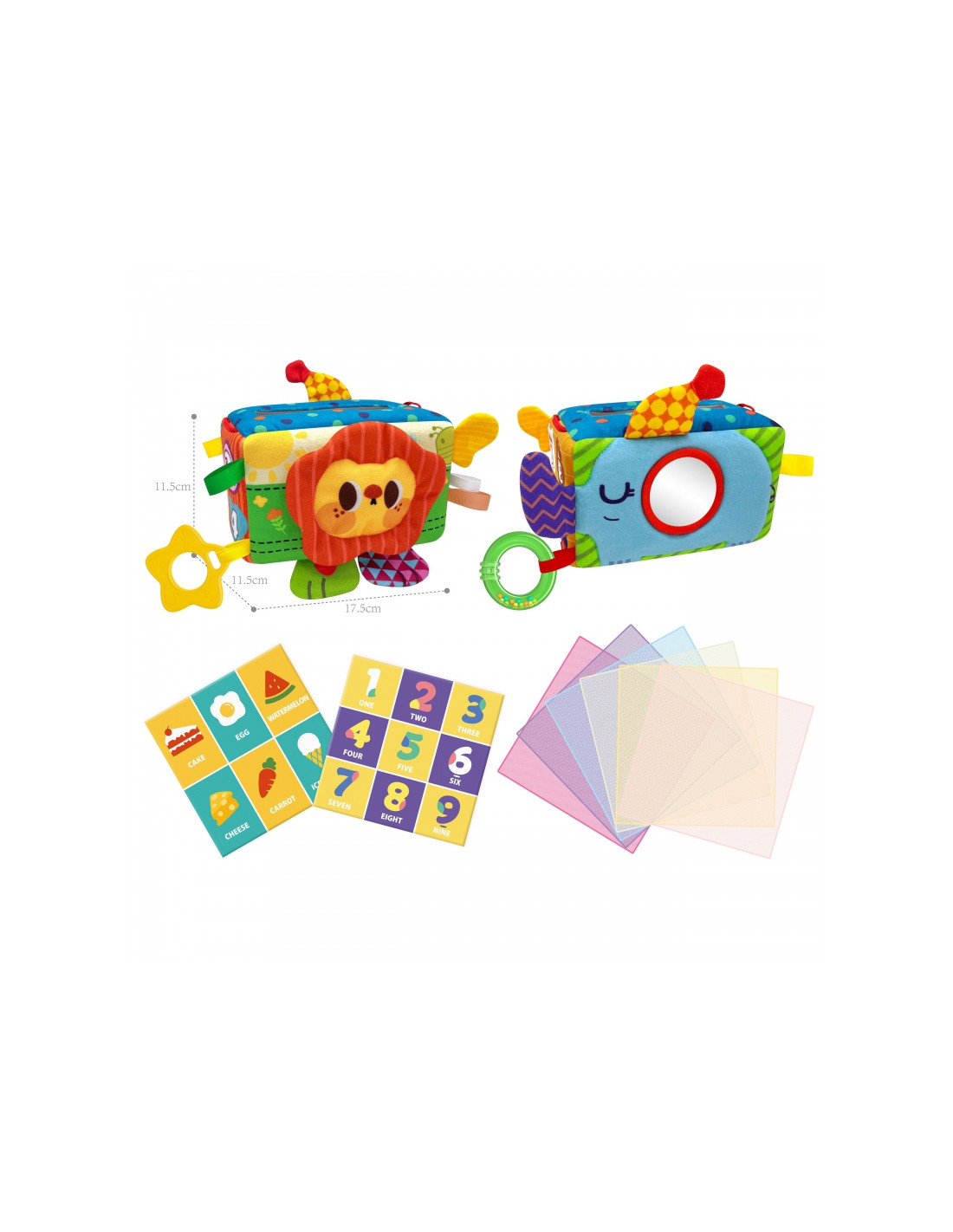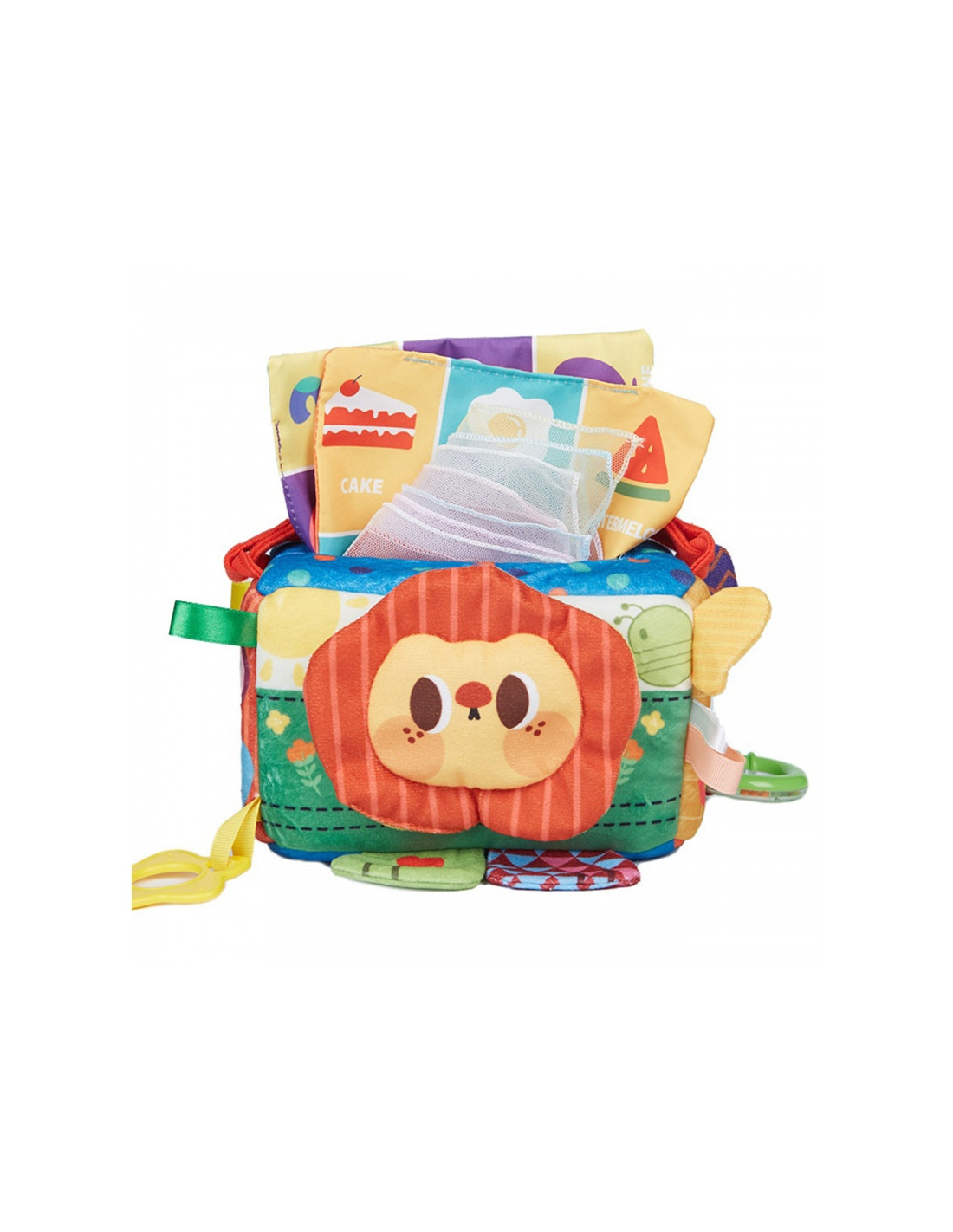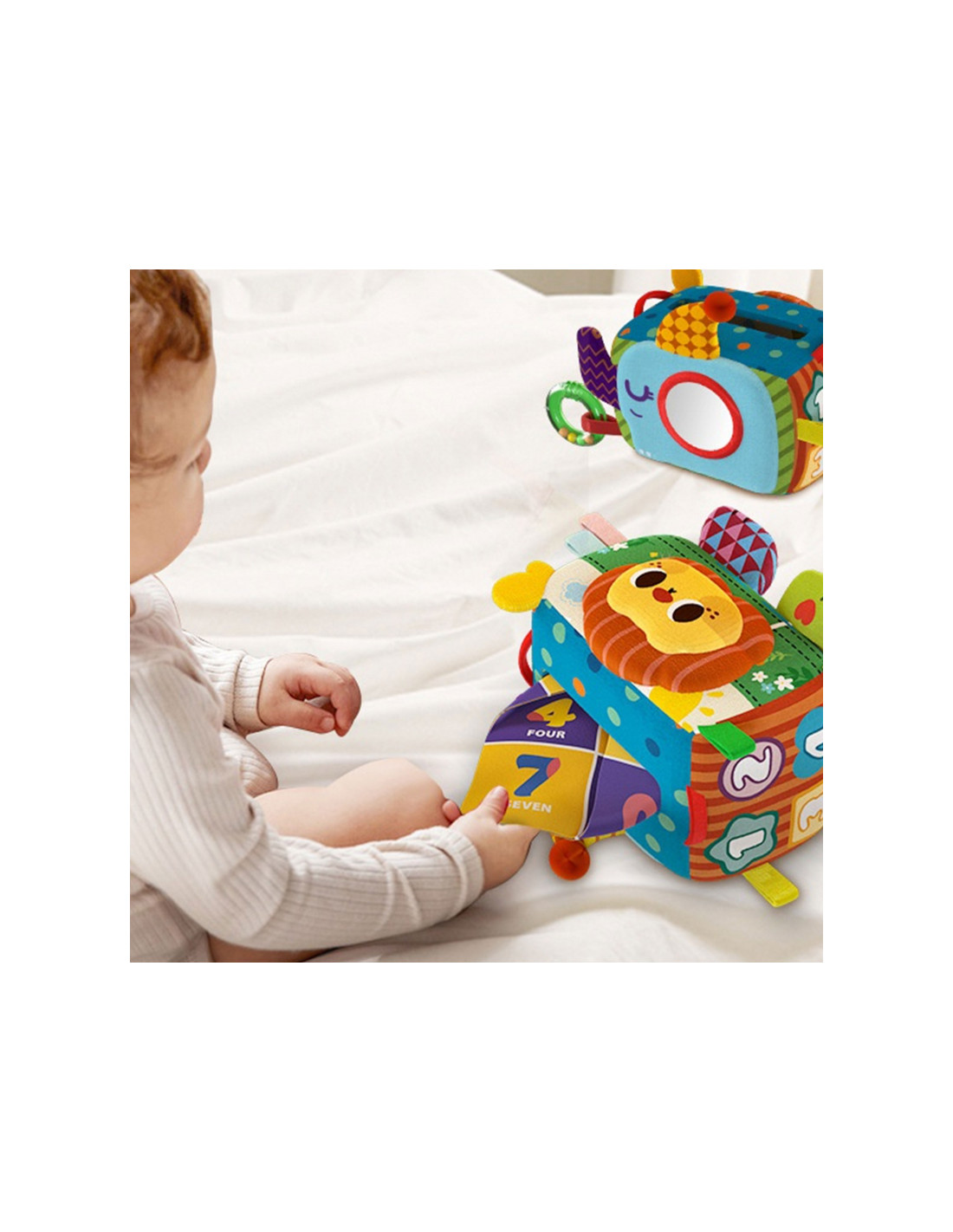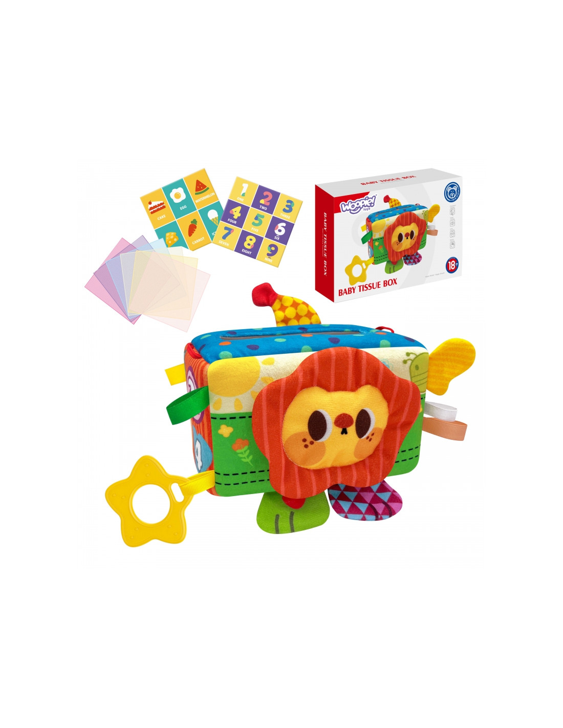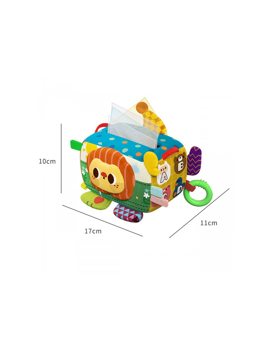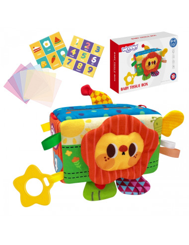 Edukacinių žaislų servetėlių dėžutė „WOOPIE“ prekės ženklo rinkinį sudaro žaislinė pliušinė dėžutė, kurioje paslėptos lavinamosios ir sensorinės audinių servetėlės. Paslaptis, ką gali talpinti kita spalvinga nosinė, veiksmingai sudominti vaikus. Rankšluostis, vaizduojantis gyvūnus ar kitus supančio pasaulio elementai . Už jų ribų edukacinės servetėlės taip pat yra spalvingų spalvų jutimo tinklai , kurie stimuliuoti lytėjimo pojūtį vaikas. Pliušinė dėžutė traukia savo spalvų gausa, be to, yra geltona kramtukas žvaigždės formos ir apvalios žalios spalvos barškutis . Ant minkštos dėžutės taip pat rasite veidrodis. Visas komplektas pagamintas iš minkštos, vaikams saugios medžiagos ir gali būti lengvai skalbiamas.