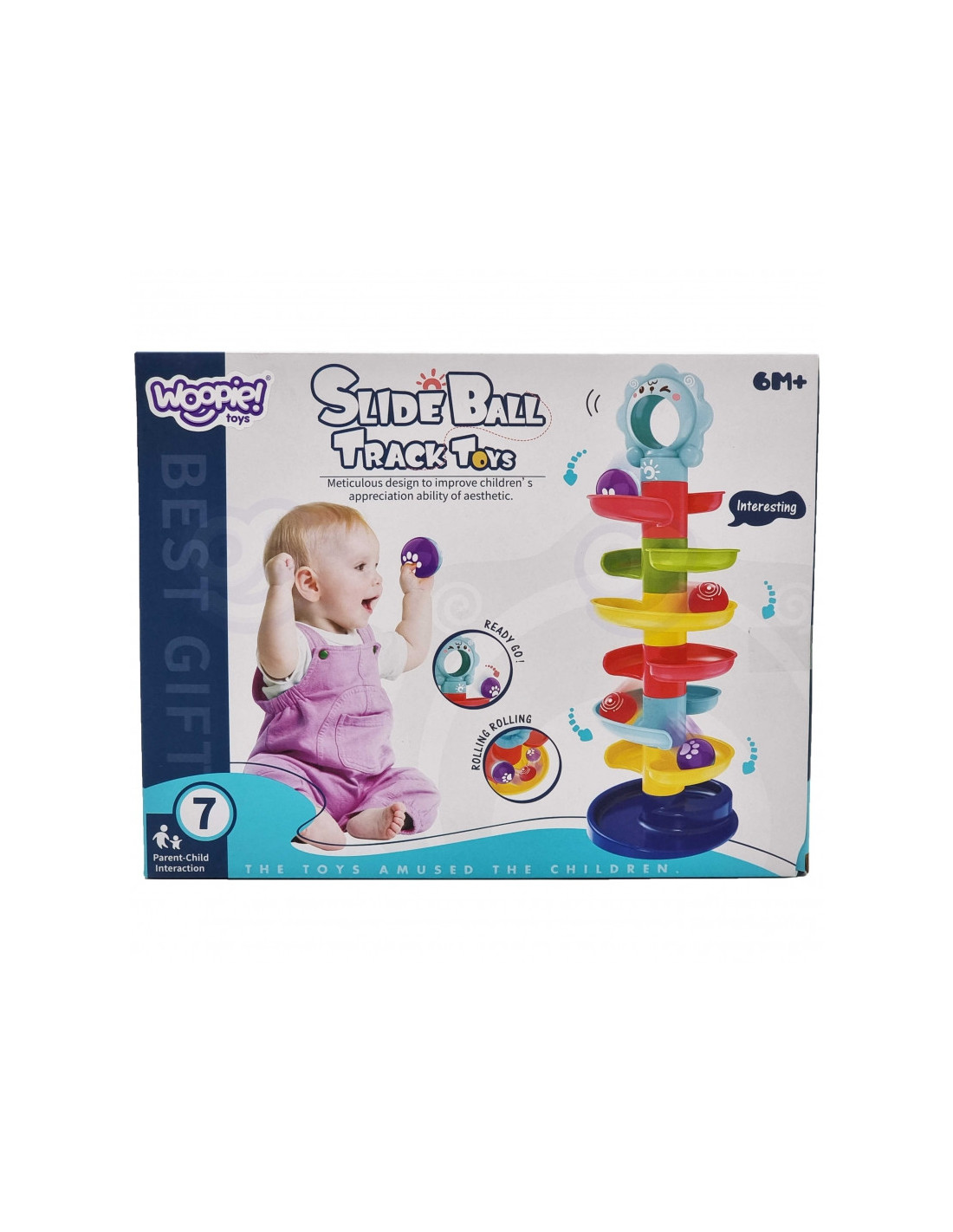WOOPIE "Ballodrome" - tai spiralinis bokštas nesibaigiančioms linksmybėms. Šį rinkinį sudaro 8 spalvingos detalės, kurias mažyliai gali lengvai sudėti vieną ant kitos. Paleiskite kamuoliukus vieną po kito iš viršutinio lygio ir stebėkite, kaip jie rieda vienas po kito. Kamuoliukų duobėje yra 2 lengvi ir lengvai suimami skirtingų spalvų kamuoliukai, kurie judėdami skleidžia garsą. Dydis tinka mažoms rankoms ir padeda lavinti akies ir rankos koordinaciją.