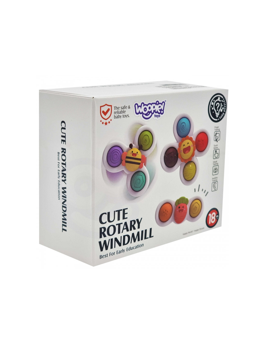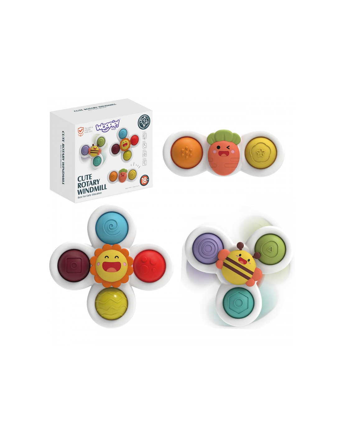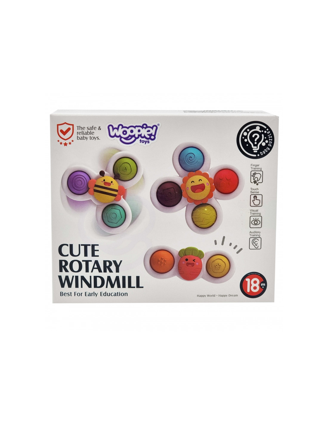 Šis „WOOPIE“ prekės ženklo suktukų rinkinys paliks didelį įspūdį jūsų vaikui. Rinkinį sudaro trys suktukai: morka, bitė ir saulė. Suktukus galima pasiimti bet kur ir pritvirtinti guminių siurbtukų dėka. Suktuką galite pritvirtinti prie lango keliaujant arba prie vonios maudydamiesi maudydamiesi (žaislas gali būti šlapias). Suktukų guoliai garantuoja ilgalaikius sukimus . Žaislai turi guminius prispaudimo elementus, kurie lavins jūsų vaiko pojūčius ir sumažins stresą . Žaidimas su vienerių metų vaiku lavina vikrumą ir gerina rankų bei akių koordinaciją .