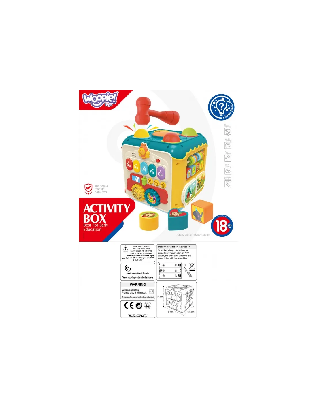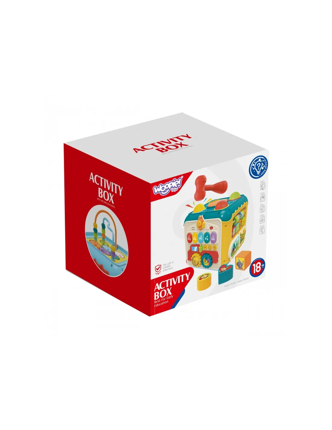 „WOOPIE“ 6 viename veiklos dėžutė – tai žaislas, siūlantis vaikams daugybę įdomių užsiėmimų. Kiekviena dėžutės pusė atlieka skirtingą funkciją, todėl ji universali ir pritaikoma skirtingiems pomėgiams bei raidos etapams . Dėžutėje yra pianinas, kuriuo vaikai gali žaisti su klavišais, skleidžiančiais draugiškus garsus, ir plaktukas, kuriuo vaikai gali mušti spalvingus kamuoliukus į dėžutę – komplekte yra ir plaktukas, ir kamuoliukai. Kiekviena veikla yra kruopščiai sukurta taip, kad lavintų įvairius įgūdžius, tokius kaip akių ir rankų koordinacija, formų ir spalvų atpažinimas, klausos raida ir kūrybiškumas . Dėl mažo dydžio veiklos dėžutė yra lengvai nešiojama , tačiau kupina begalinių pramogų mažiesiems tyrinėtojams, norintiems mokytis žaisdami.