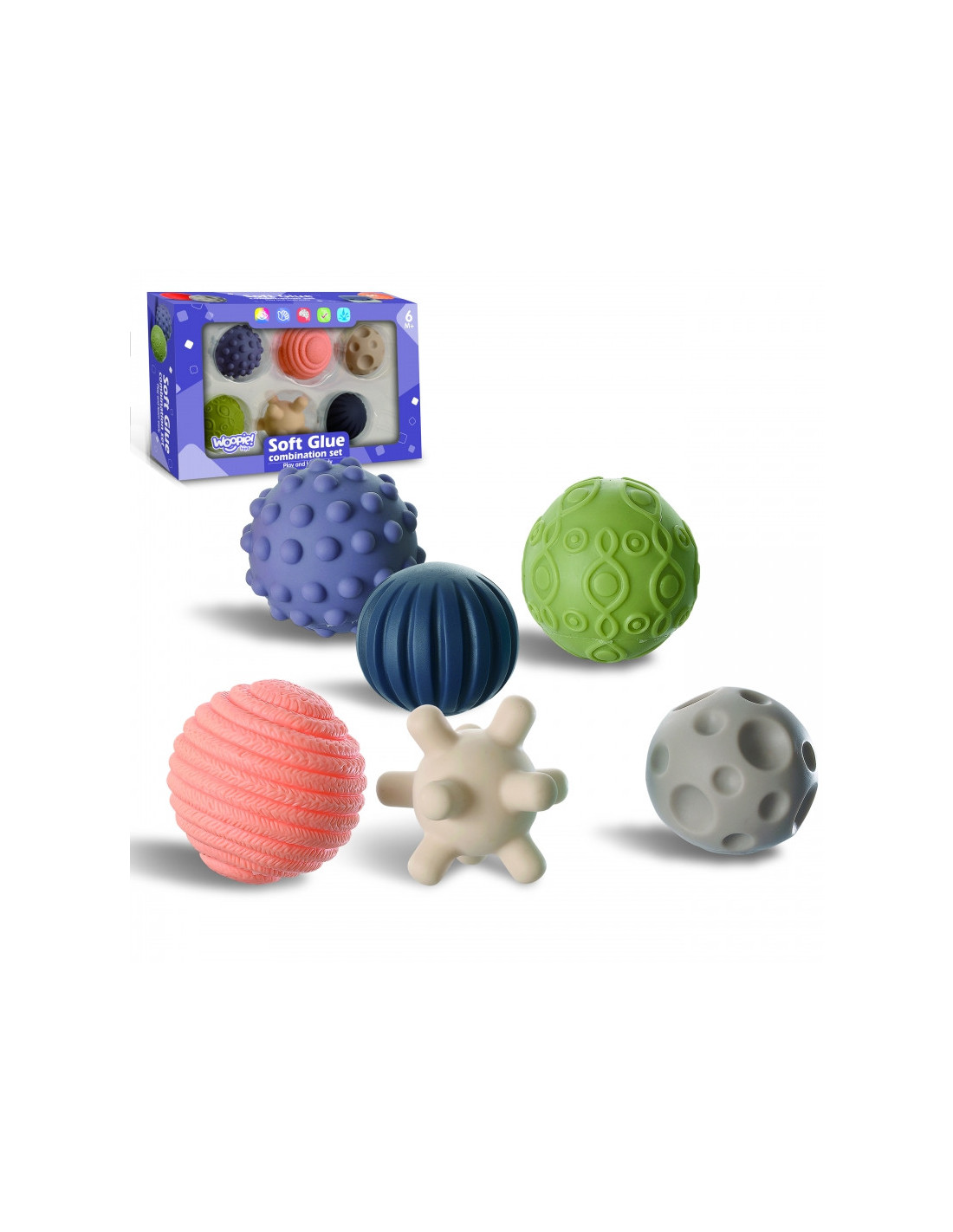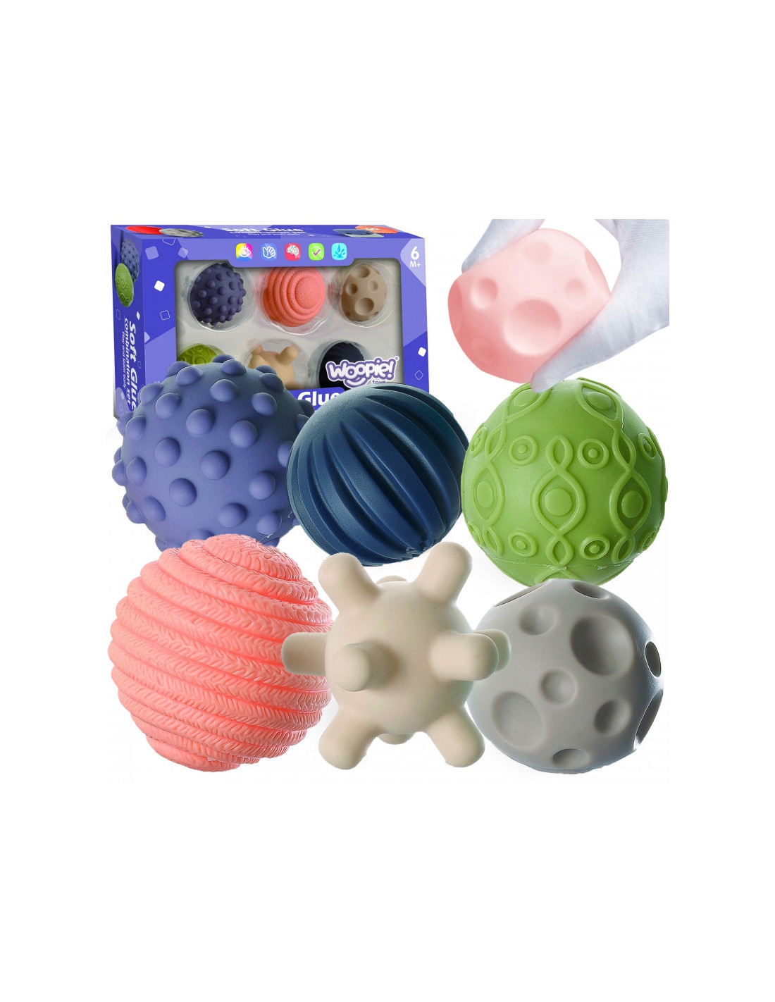 WOOPIE sensoriniai blokai pradžiugins kiekvieną mažylį. Dėl įdomių formų, spalvų ir galimybės išspausti garsus juos spaudžiant, jie puikiai stimuliuoja vaiko regos ir klausos koordinaciją, motoriką ir lytėjimo pojūtį. Blokeliai yra išgaubtų formų, skirtingų tekstūrų / raštų ir formų. Blokeliai yra minkšti ir malonūs liesti. Dėl savo struktūros jie puikiai tinka ir kaip kramtukai. Gražių prislopintų spalvų gaminys tinka vaikams nuo 6 mėnesių amžiaus.