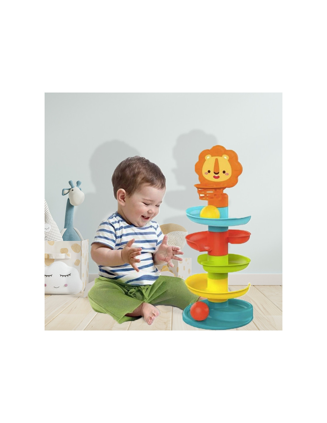 Prekės ženklo WOOPIE penkių lygių nusileidimotakelis su kairiuoju krepšeliu yra puiki dovana jūsų vaikui! Žaisdamas mažylis sužinos, kaip rutulinės figūros veikia ant nuožulnių paviršių. Rutuliukų viduje yra mažyčių elementų, kurie riedėdami skleidžia garsus ir taip suteikia papildomų pojūčių. Kalnelyje yra penki spalvingi lygiai, kuriuos turi įveikti vaiko padėtas rutuliukas. Viršuje yra draugiškas liūtas su krepšiu, į kurį vaikas bandys pataikyti, taip lavindamas rankų įgūdžius, koordinaciją ir tikslumą. Žaislas pagamintas iš saugaus ir sertifikuoto plastiko. Puikus būdas mokytis žaidžiant!