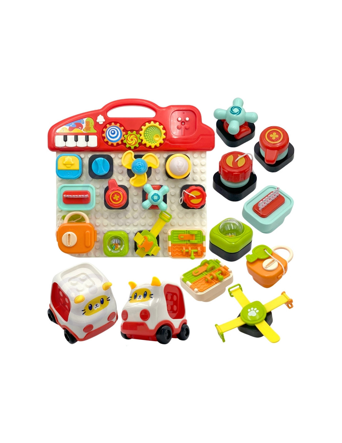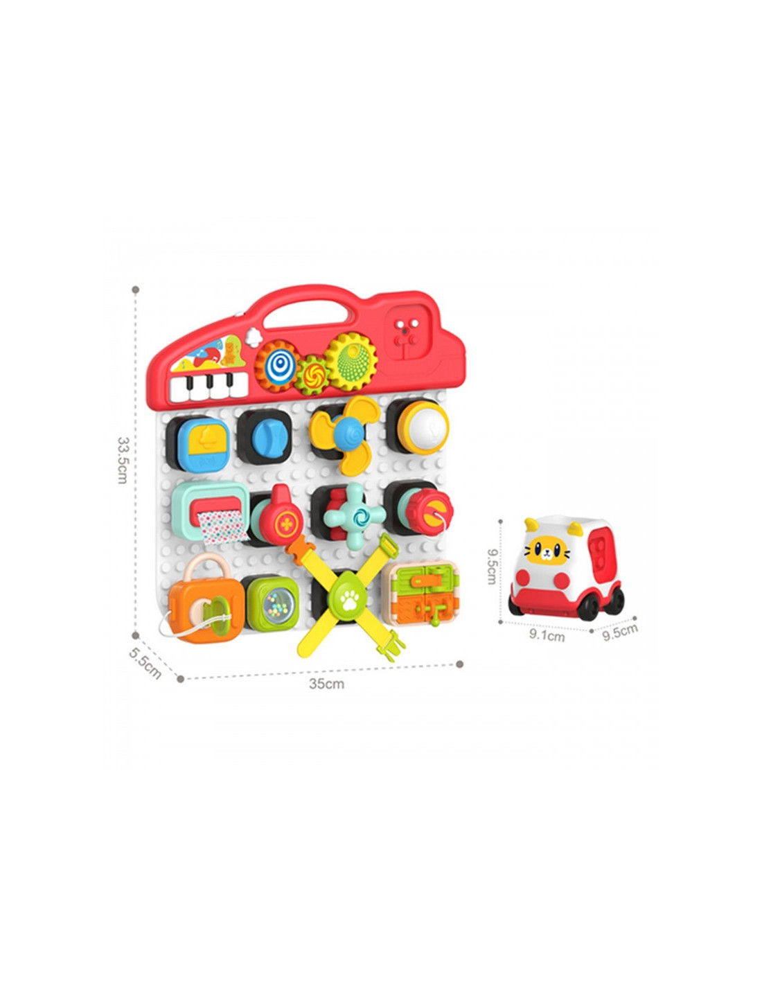 - - į komplektą įeina lenta, manipuliacinės kaladėlės ir kačiuko automobilis