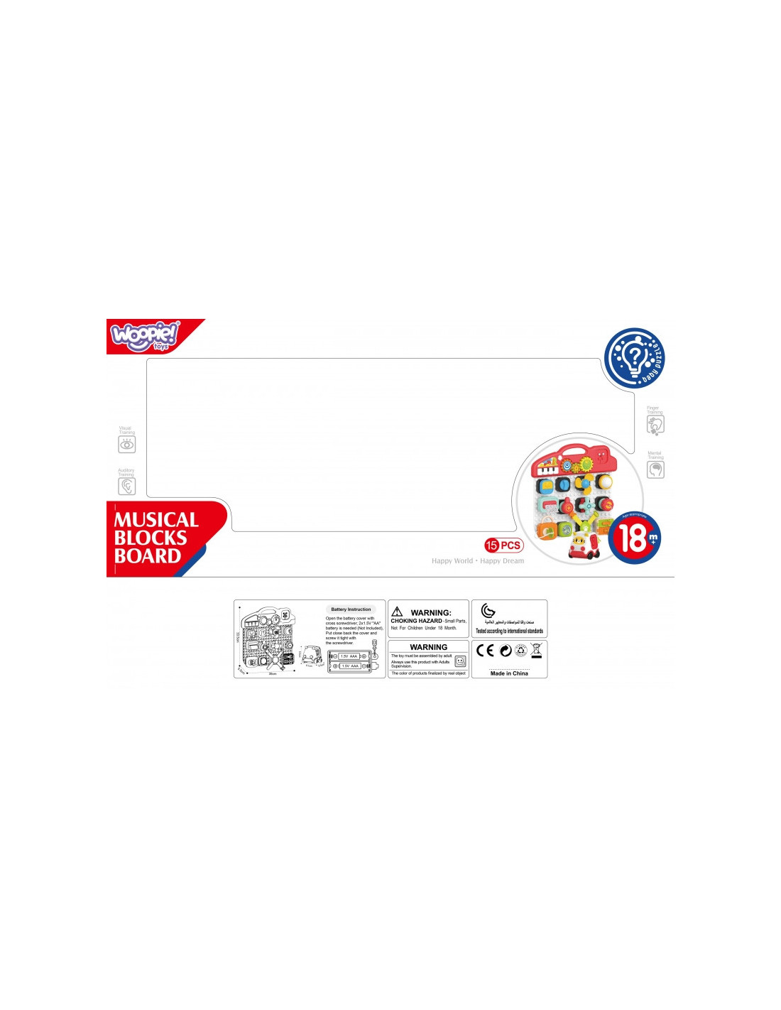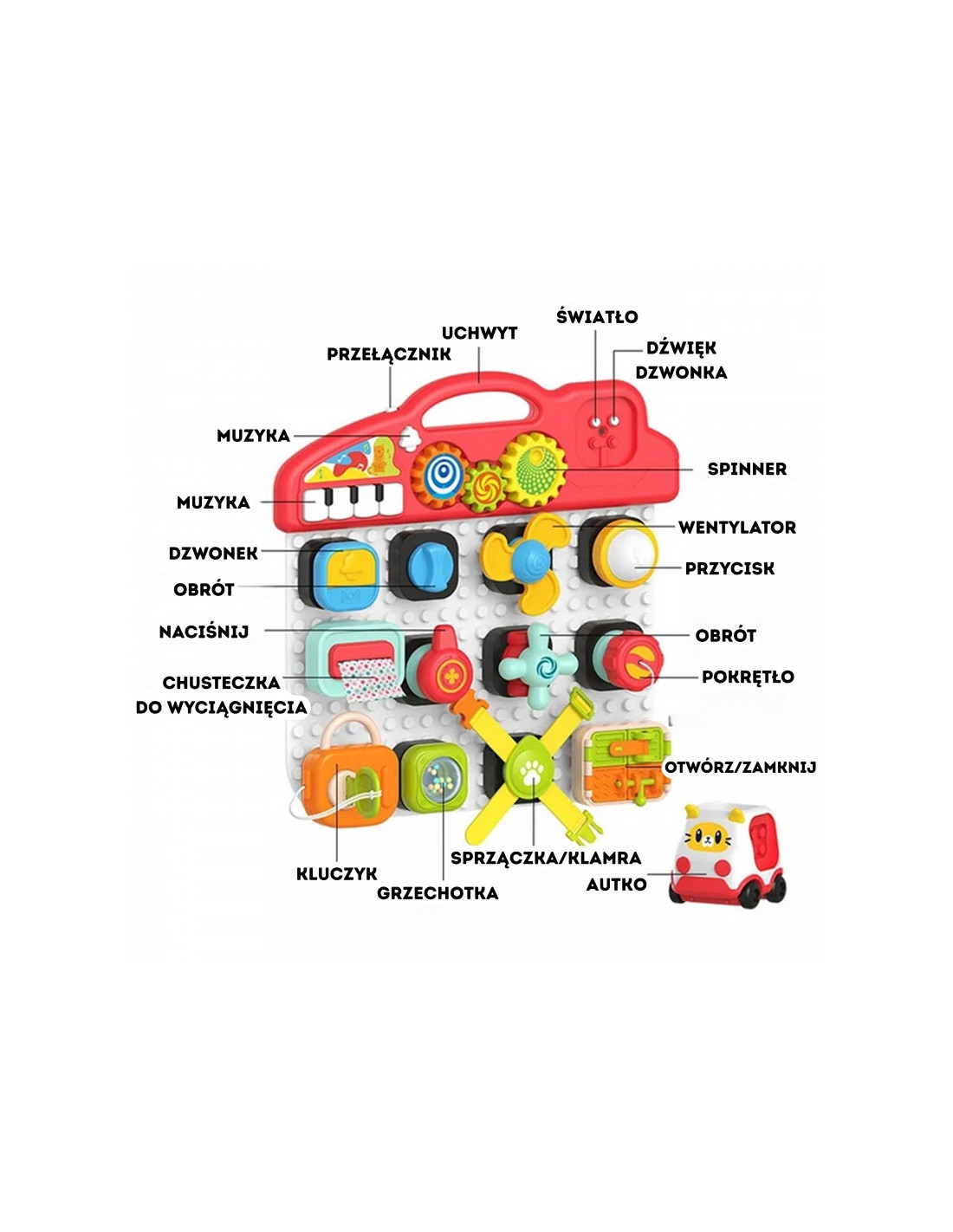 Spalvingas prekės ženklo veiklos skydelis Woopie yra įdomus vystymo žaislas, skirtas vaikų sensoriniam ir motoriniam vystymuisi skatinti. Skydą sudaro įvairūs interaktyvūs elementai, kuriuos, kaip ir kaladėles, galima pritvirtinti ir nuimti savo nuožiūra. Rinkinyje taip pat yra katės formos automobilis, prie kurio galima pritvirtinti skydelio elementus.