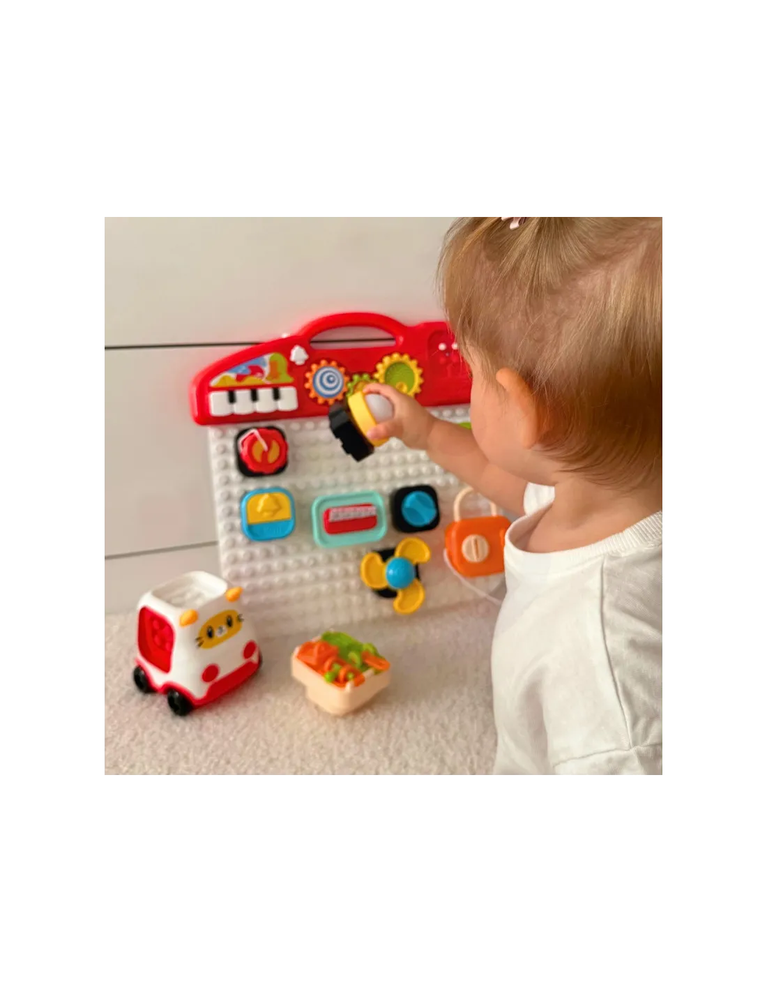 Spalvingas prekės ženklo veiklos skydelis Woopie yra įdomus vystymo žaislas, skirtas vaikų sensoriniam ir motoriniam vystymuisi skatinti. Skydą sudaro įvairūs interaktyvūs elementai, kuriuos, kaip ir kaladėles, galima pritvirtinti ir nuimti savo nuožiūra. Rinkinyje taip pat yra katės formos automobilis, prie kurio galima pritvirtinti skydelio elementus.