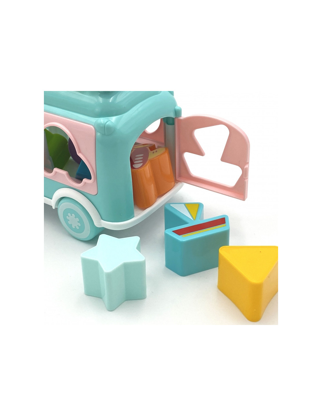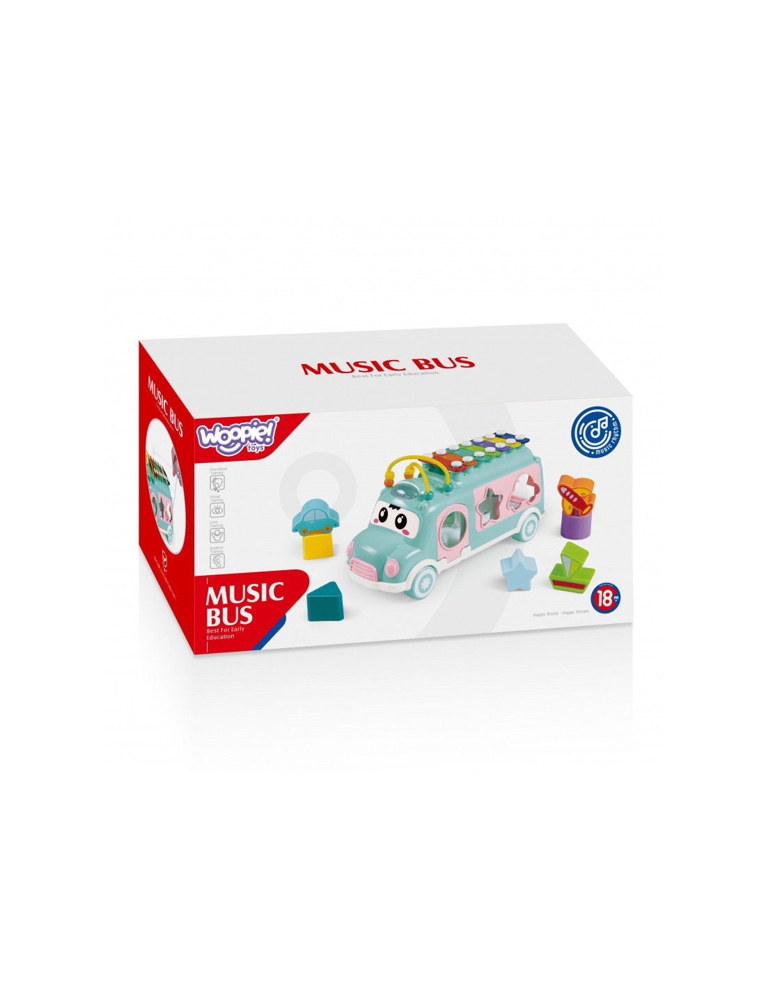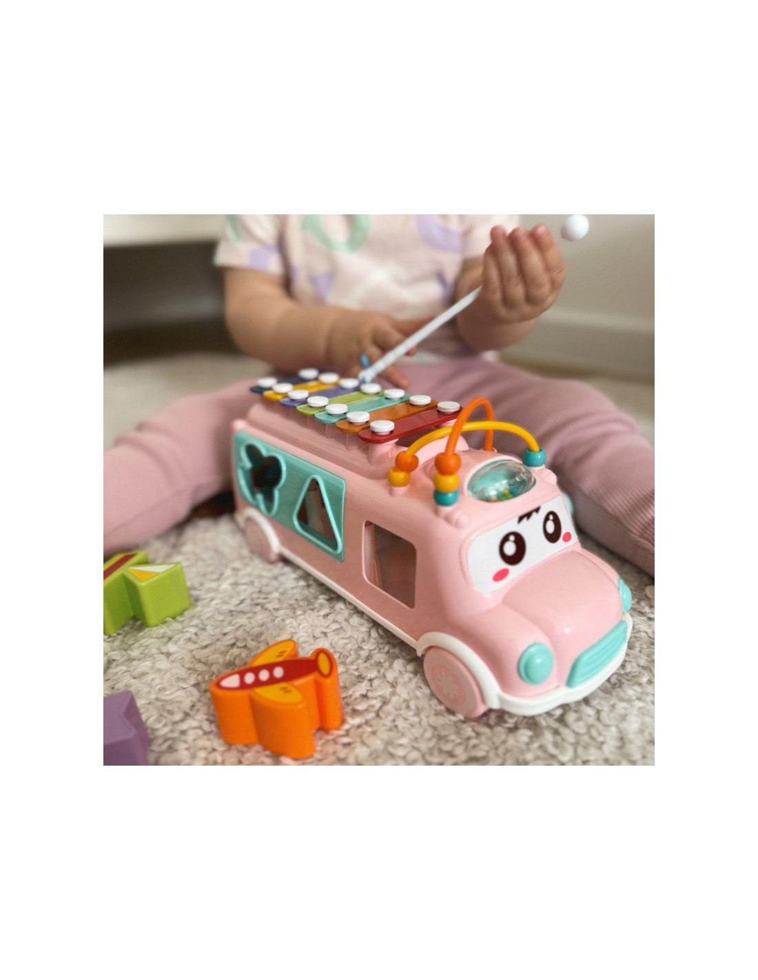 Muzikinis automobilis su cimbolais rožinės spalvos iš prekės ženklo Woopie yra žavus pastelinių spalvų žaislinis automobilis, kuris pradžiugins kiekvieną mažylį. Jis suteikia daugybę galimybių bendrauti ir stimuliuoti pojūčius, taip pat lavinti kūdikio motorinius ir loginius įgūdžius . Žaisliniame automobilyje yra daug elementų, kuriais galima manipuliuoti ir tyrinėti. Pridėtu plaktuku kūdikis gali groti ant automobilio stogo esančiais spalvingais cimbolais. Automobilio šonuose yra įvairių formų skylės, o žaisle yra spalvotų kaladėlių, kurios telpa į šias skyles. Vaikas gali žaisti derindamas kaladėles prie tinkamų formų, taip lavindamas akies ir rankos koordinaciją ir spalvų atpažinimą. Ant stogo esantys karoliukai, kuriuos vaikas gali judinti, lavina vaiko vikrumą ir koncentraciją.