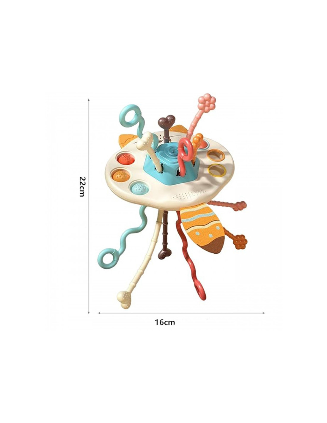 - - Sensorinis žaislas turi 3 minkštus spalvotus mygtukus ir 6 skirtingų tekstūrų ir spalvų virveles.
