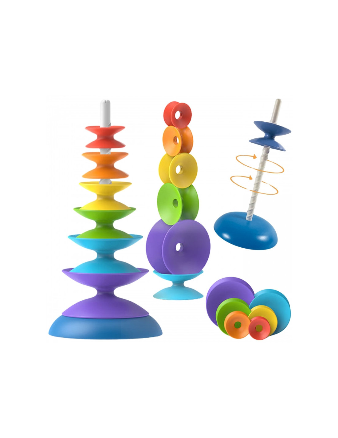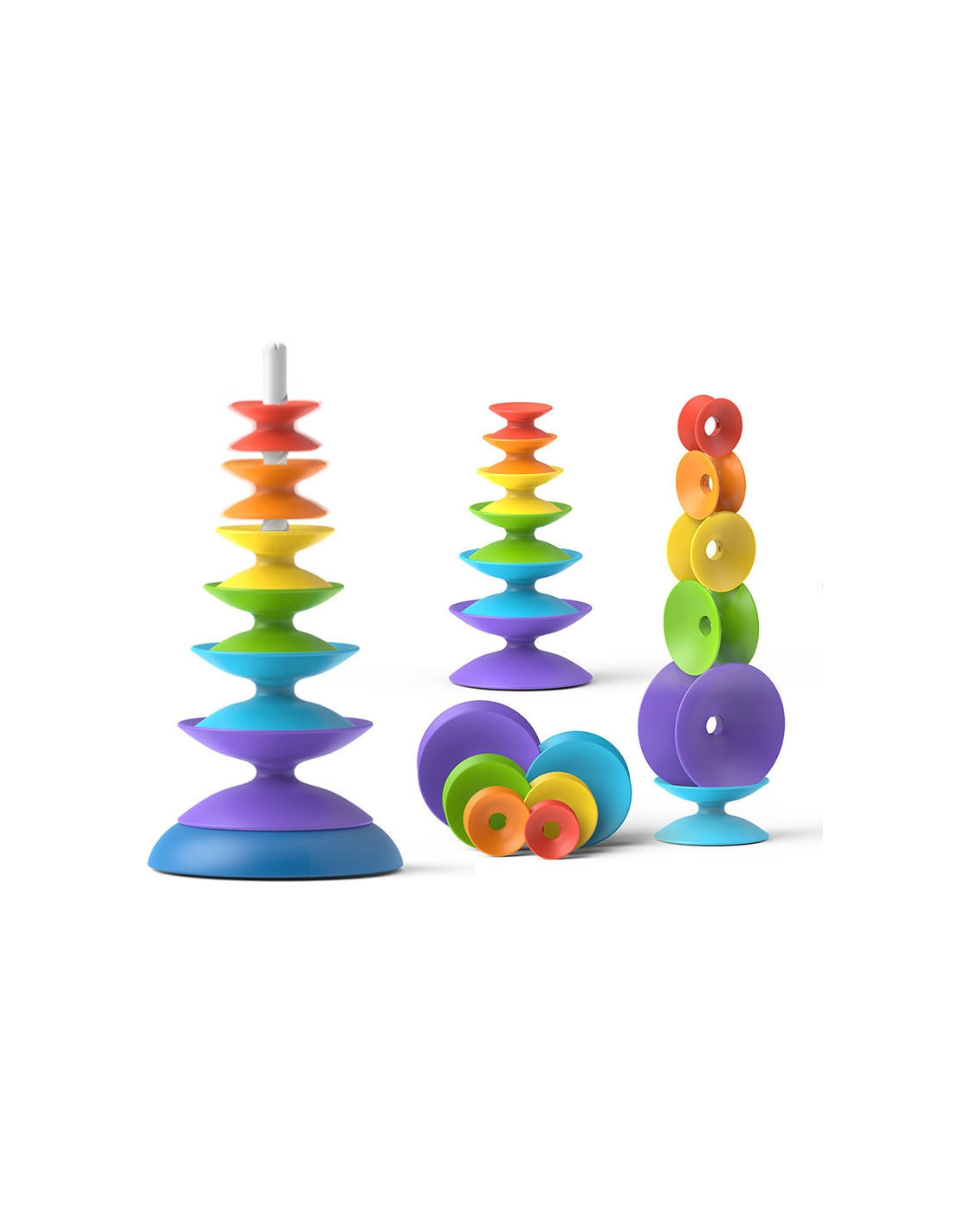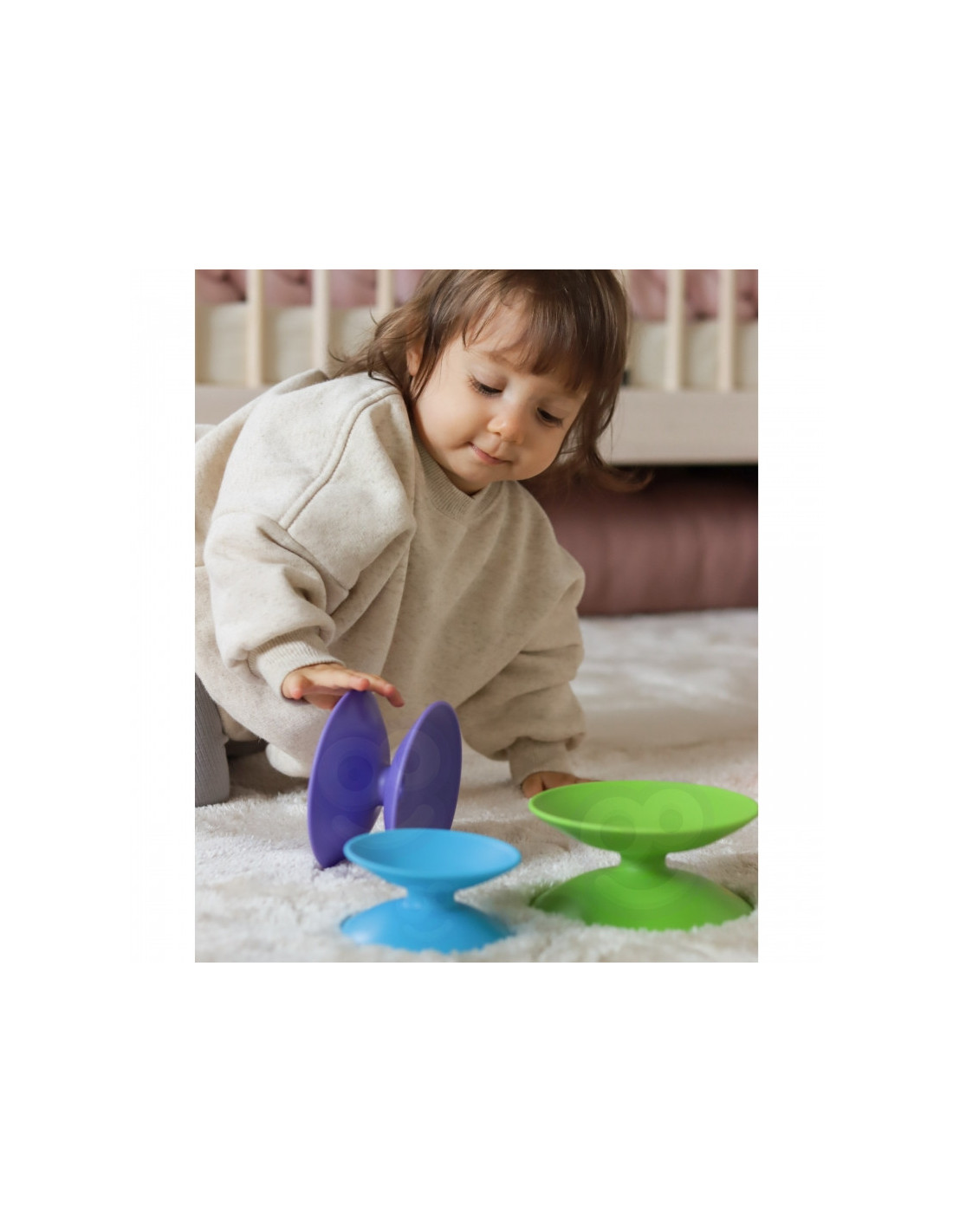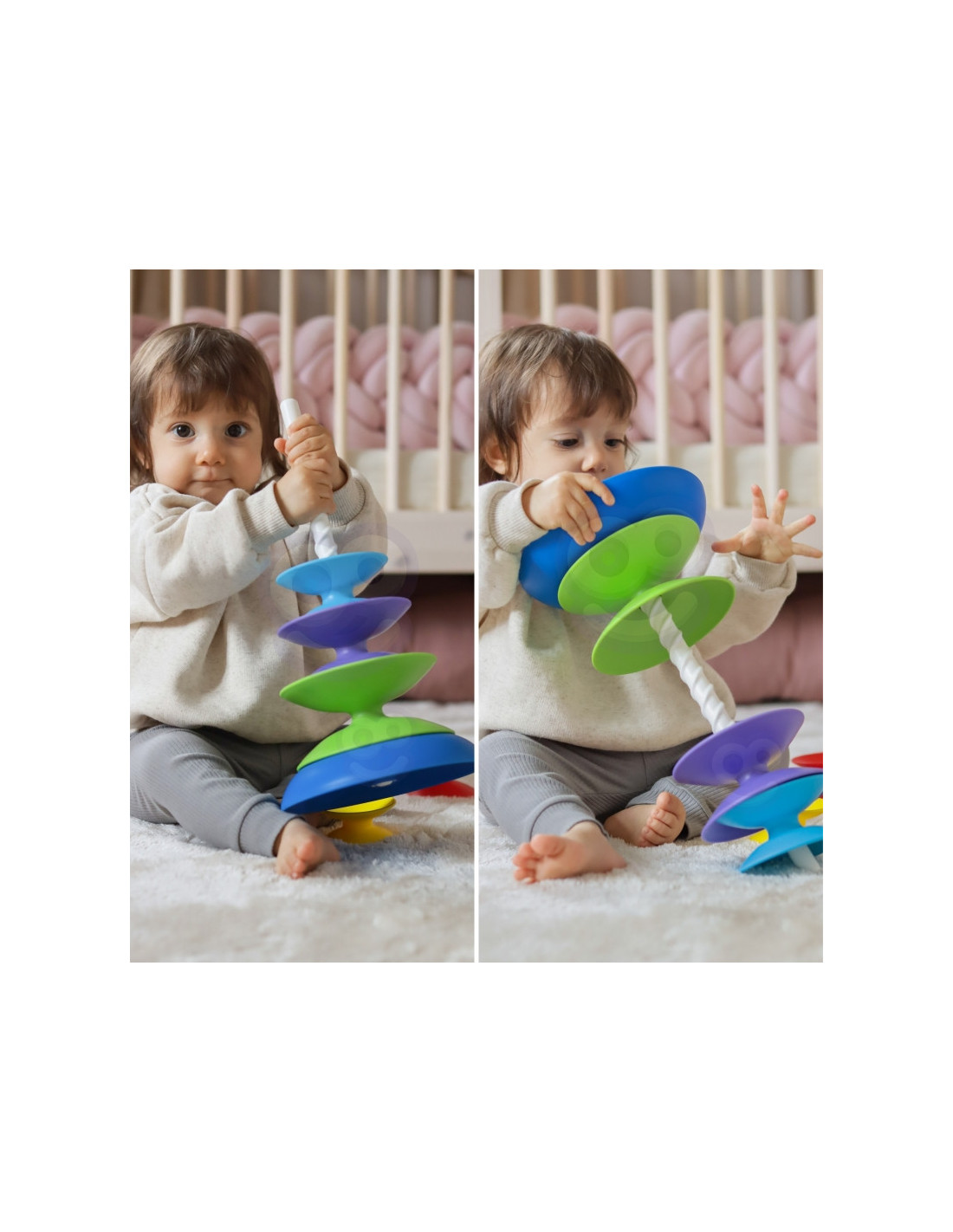 Kiekvienas iš 7 ritinėlių skiriasi dydžiu ir spalva, skatindamas mažylį tyrinėti, lyginti ir dėlioti