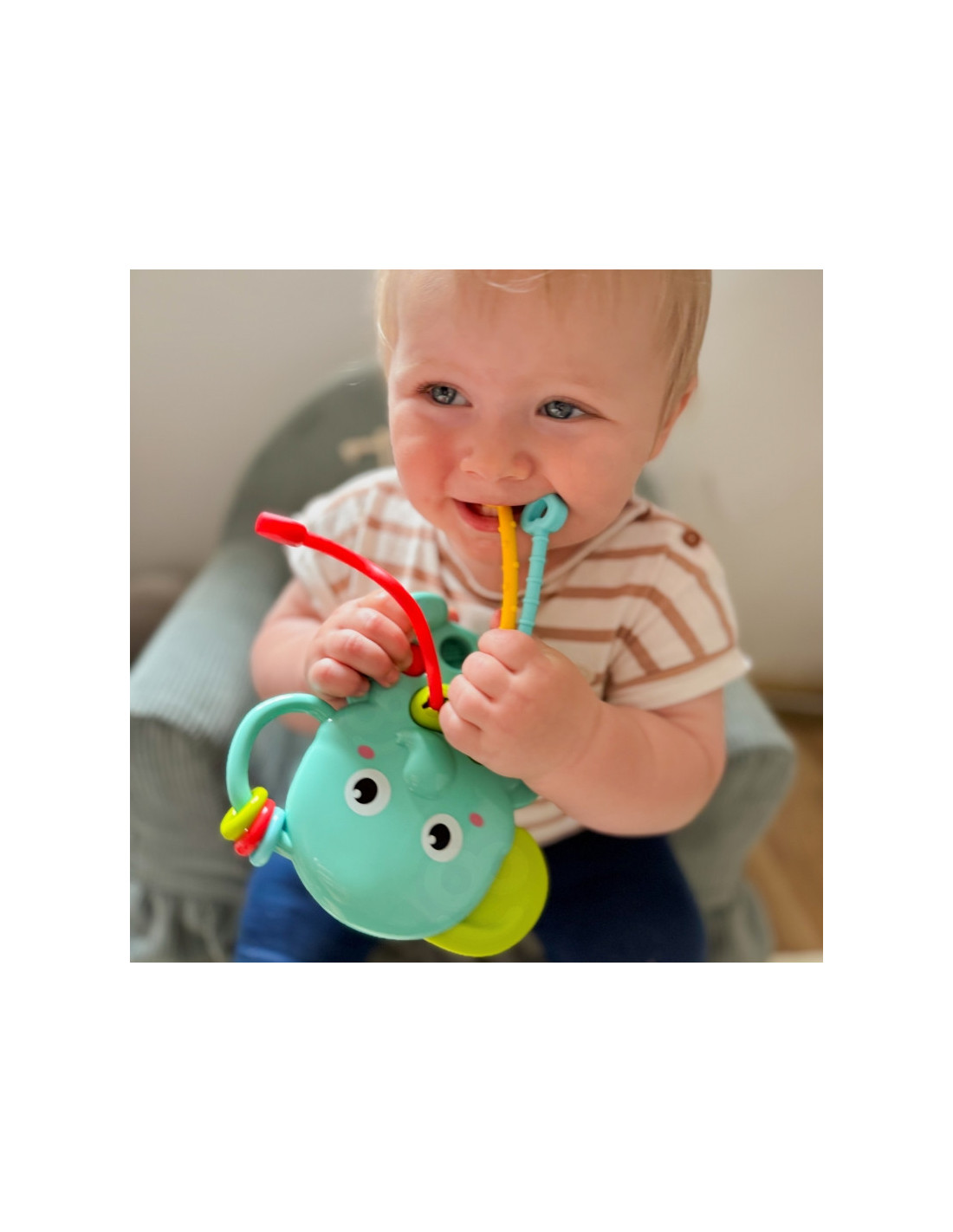 - Draugiška dramblio forma ir ryškios spalvos patraukia kūdikio dėmesį