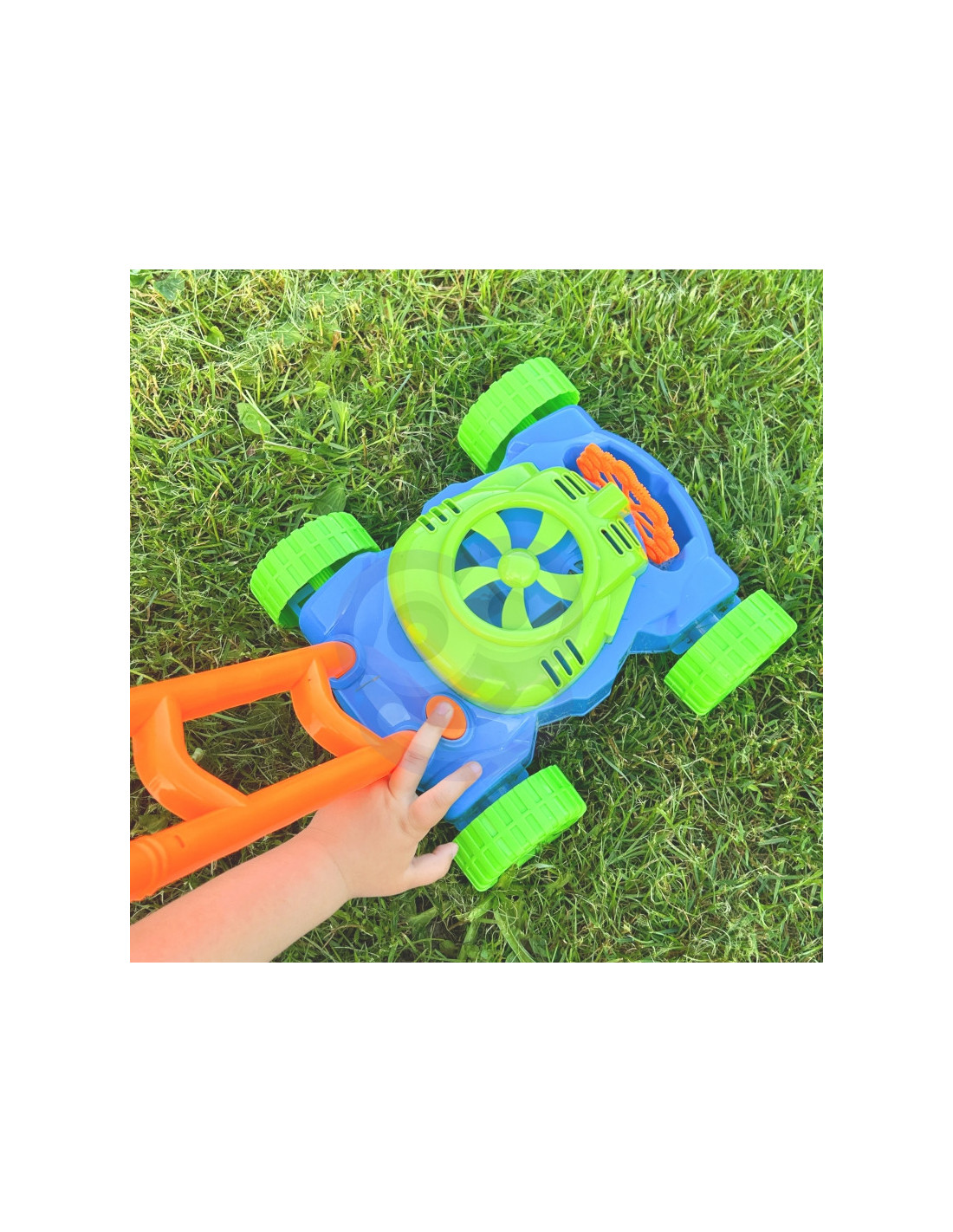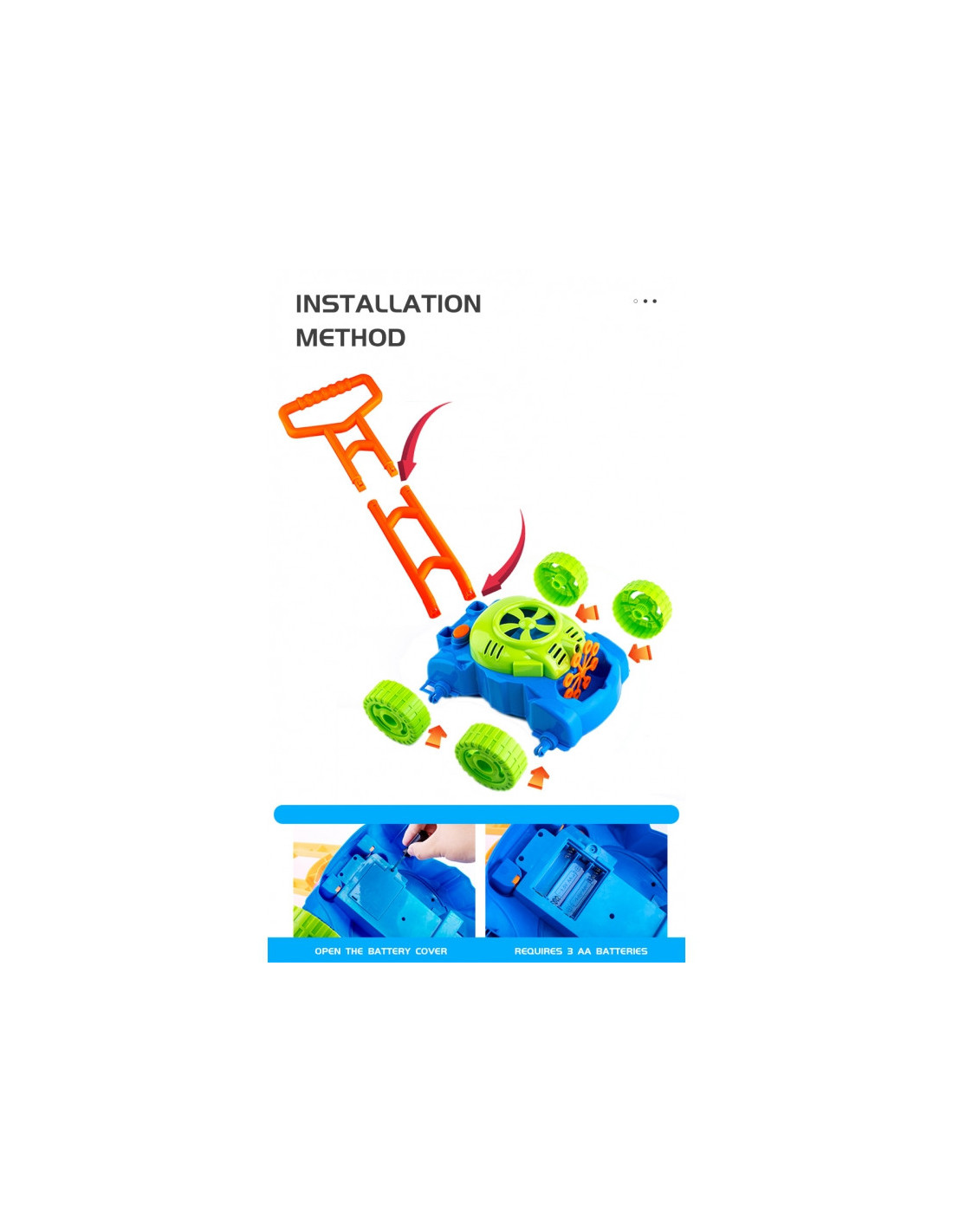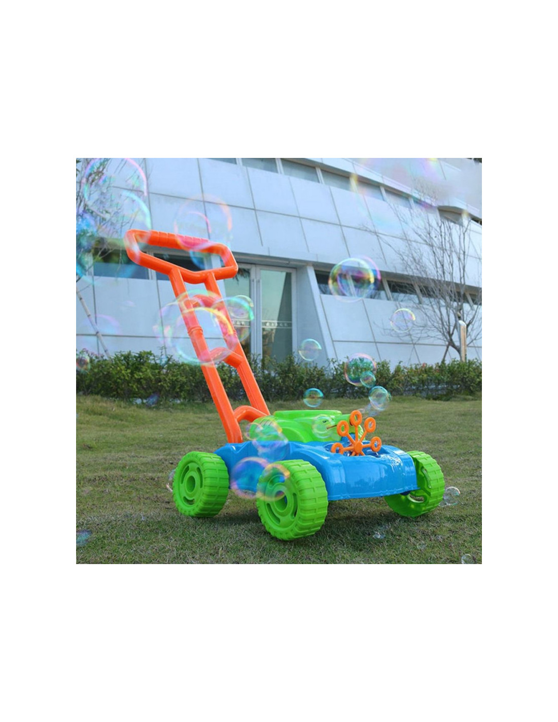 Burbulai pučiami automatiškai . Mažas ventiliatorius, esantis ant vejapjovės variklio korpuso, sukuria oro srovę , kuri nukreipiama į aštuonis besisukančius žiedus. Šie žiedai panardinami į burbulus gaminančio skysčio indą ir po vieną praleidžiami po mažu antgaliu. Tokiu būdu burbulai pučiami nuolat. Dėl aštuonių žiedų žaislas vienu metu sukuria daug burbulų. Papildomas vejapjovės privalumas – jos skleidžiami garsai . Girdėti garsai yra muilo burbulai ir animacinio filmuko melodija. Ant galinių ratų yra plastikiniai skirtukai , kurie barška važiuojant , imituodami tikros mašinos garsą. Ši pasakiškai spalvinga vejapjovė siūlo begalę pramogų, skatina kūrybiškumą ir lavina rankų miklumą . Galite būti tikri , kad jūsų mažylis neturės laiko nuobodžiauti.