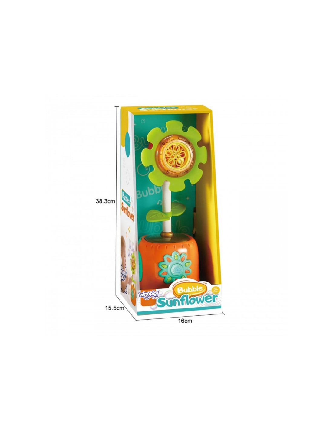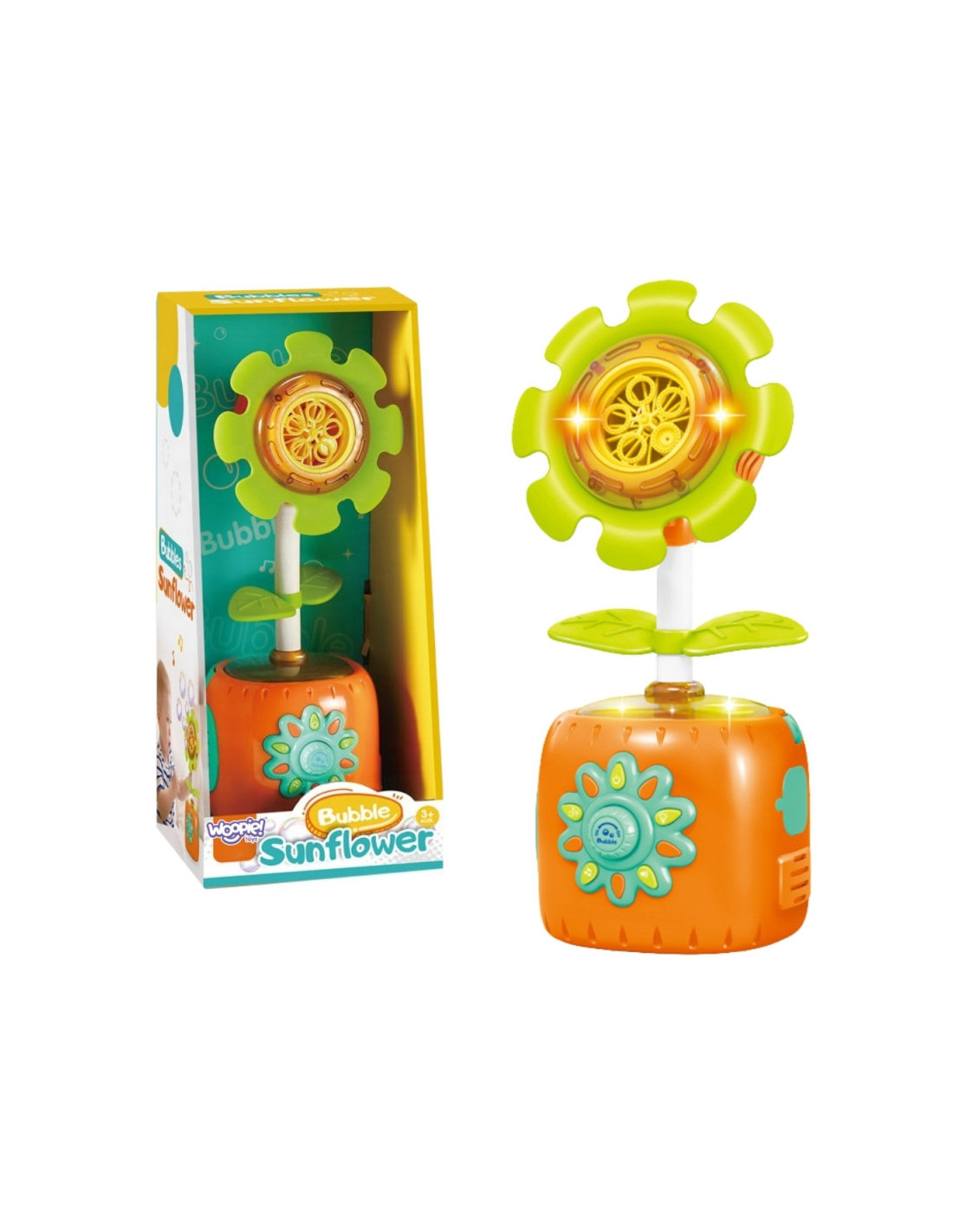 Pakelkite vaikų pramogas į kitą lygį su unikalia Woopie saulėgrąžų burbulų mašina! Šis neįtikėtinai spalvingas ir patrauklus saulėgrąžos formos žaislas traukia akį iš pirmo žvilgsnio. Vos vieno mygtuko paspaudimo ir iš spalvingos saulėgrąžos sprogs dešimtys mirgančių burbulų, džiuginančių kiekvieną vaiką. Lankstus saulėgrąžos stiebas leidžia išleisti burbulus iš bet kurios padėties. Papildomi šviesos efektai ir linksma muzika paverčia žaidimą tikru spektakliu, kuris įtraukia visus pojūčius ir garantuoja nepamirštamas akimirkas tiek viduje, tiek lauke.