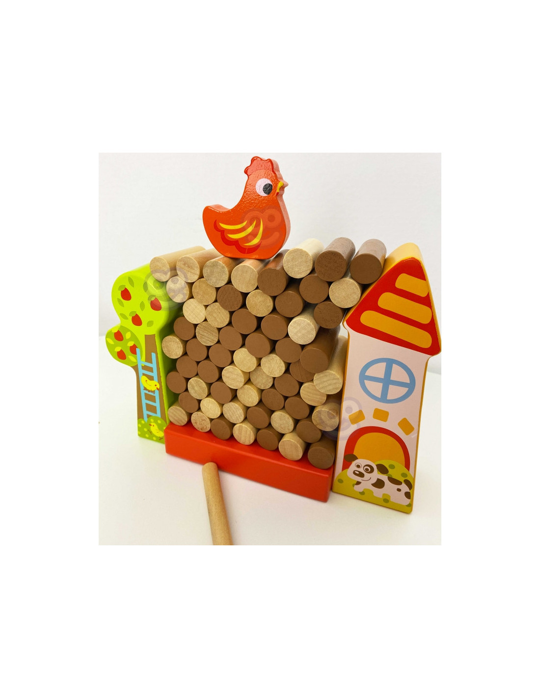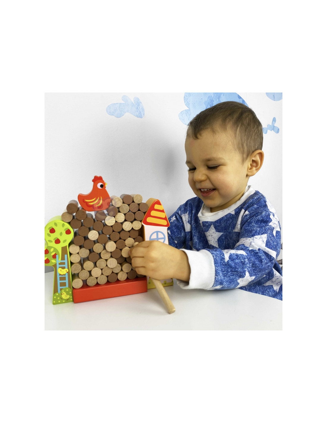 Ar jūsų vaikas pasiruošęs nepamirštamam nuotykiui ūkyje, kuris lavina ne tik jo vaizduotę, bet ir vertingus įgūdžius ateičiai? TOOKY TOY medinis ūkio žaidimas yra smagus mažiesiems. Tai ne tik pramoga, bet ir vertingų įgūdžių, kurie pravers ateityje, pamoka. Estetiškas apdirbimas ir spalvos patrauks ne vieno mažylio akį. Pastatykite sieną ir pačiame viršuje pastatykite viščiuką, tada nuimkite po vieną lazdelę. Kas priverčia sieną sugriūti, tas pralaimi! Žaisdamas mažylis mokysis susikaupimo, strategijos ir problemų sprendimo, tobulins rankų ir akių koordinaciją. - tai įtraukianti pramoga.