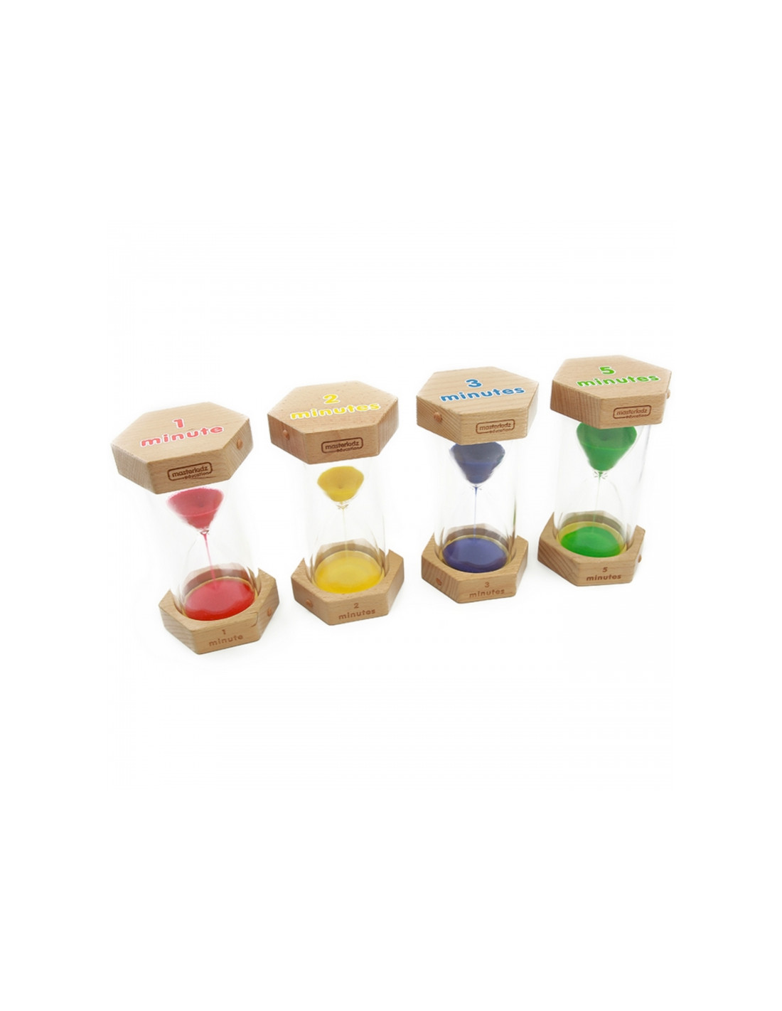 Rinkinį sudaro 4 smėlio laikrodžiai. Kiekvienas iš jų turi skirtingos spalvos smėlį ir skaičiuoja skirtingą atstumą laike.