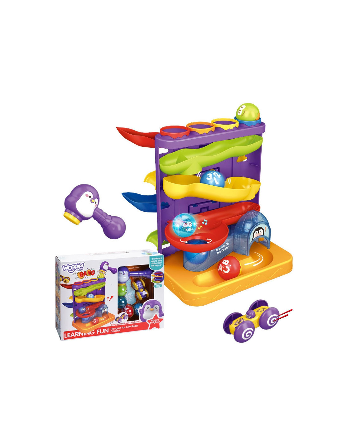 WOOPIE "3-in-1" plaktuko smūgiokamuoliukų trasa su automobilių kalneliu - tai daugiafunkcis žaislas, kuris lavins ir sudomins jūsų vaiką. Jis turi 3 pagrindines funkcijas. Plaktukas - ankstyvosios raidos žaislas: išmuškite 4 kamuoliukus pro skylutes ir pamatykite, kur jie skrenda! Pamatykite, kaip jie riedės lataku. Plaktukas yra lengvas ir mažas, todėl jį lengva laikyti. Maži vaikai gali lengvai įsitraukti dėdami blizgančius kamuoliukus į angas, daužydami juos plaktuku ir stebėdami, kaip jie slysta žemyn rampomis. Rinkinyje taip pat yra žaislinis automobilis. Kitoje žaislo pusėje yra kalneliai, todėl čia galima pastatyti automobilį ir stebėti, kaip jis slysta žemyn. Rinkinyje yra įvairių kamuoliukų, kuriuos galima naudoti mokant, pavyzdžiui, skaičiuoti ir abėcėlės. Tai gerina rankų ir akių koordinaciją ir motorinius įgūdžius žaidžiant ir lavinant vaizduotę.