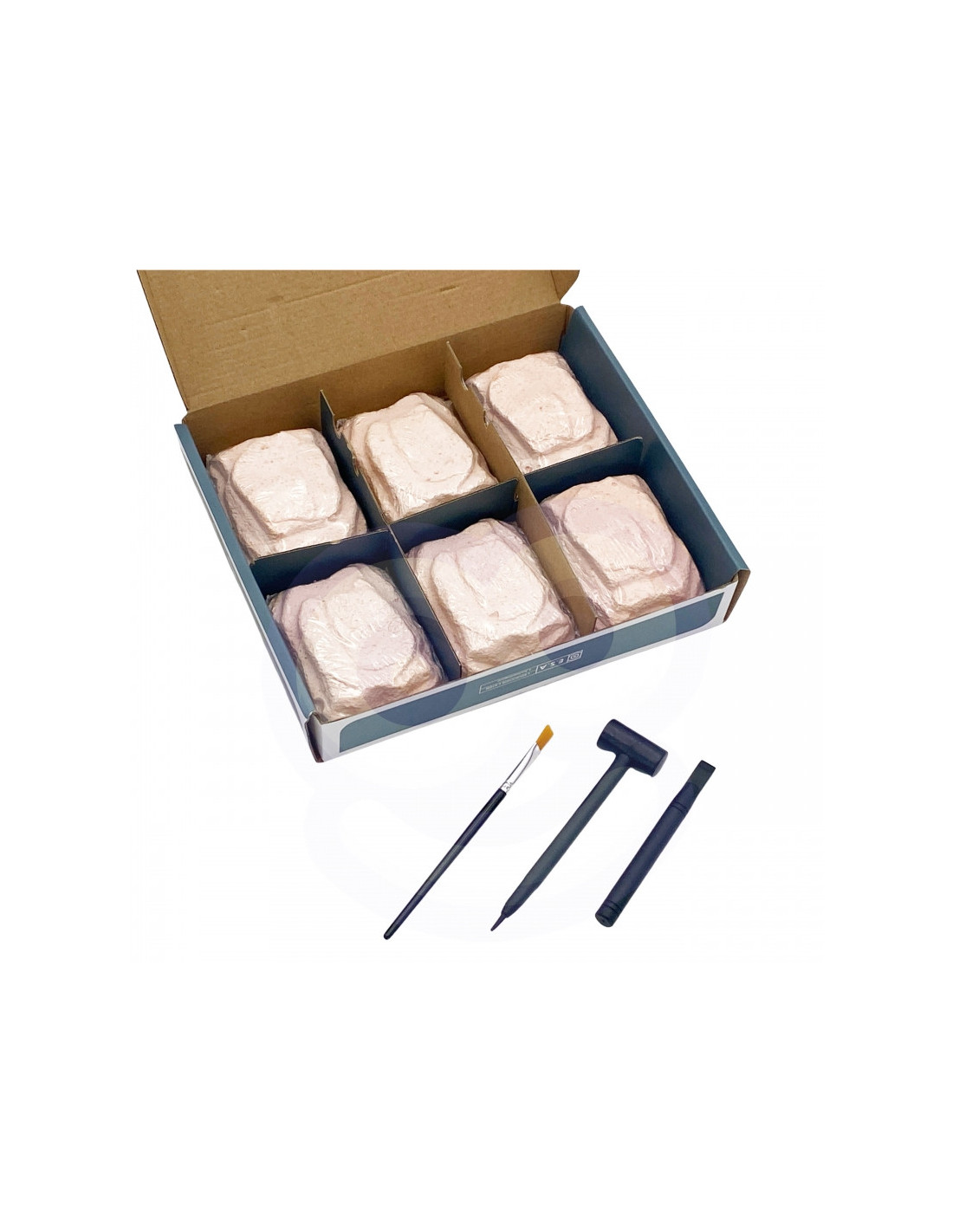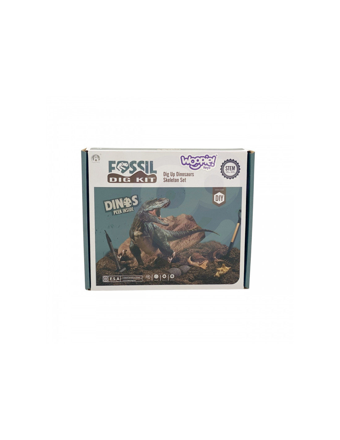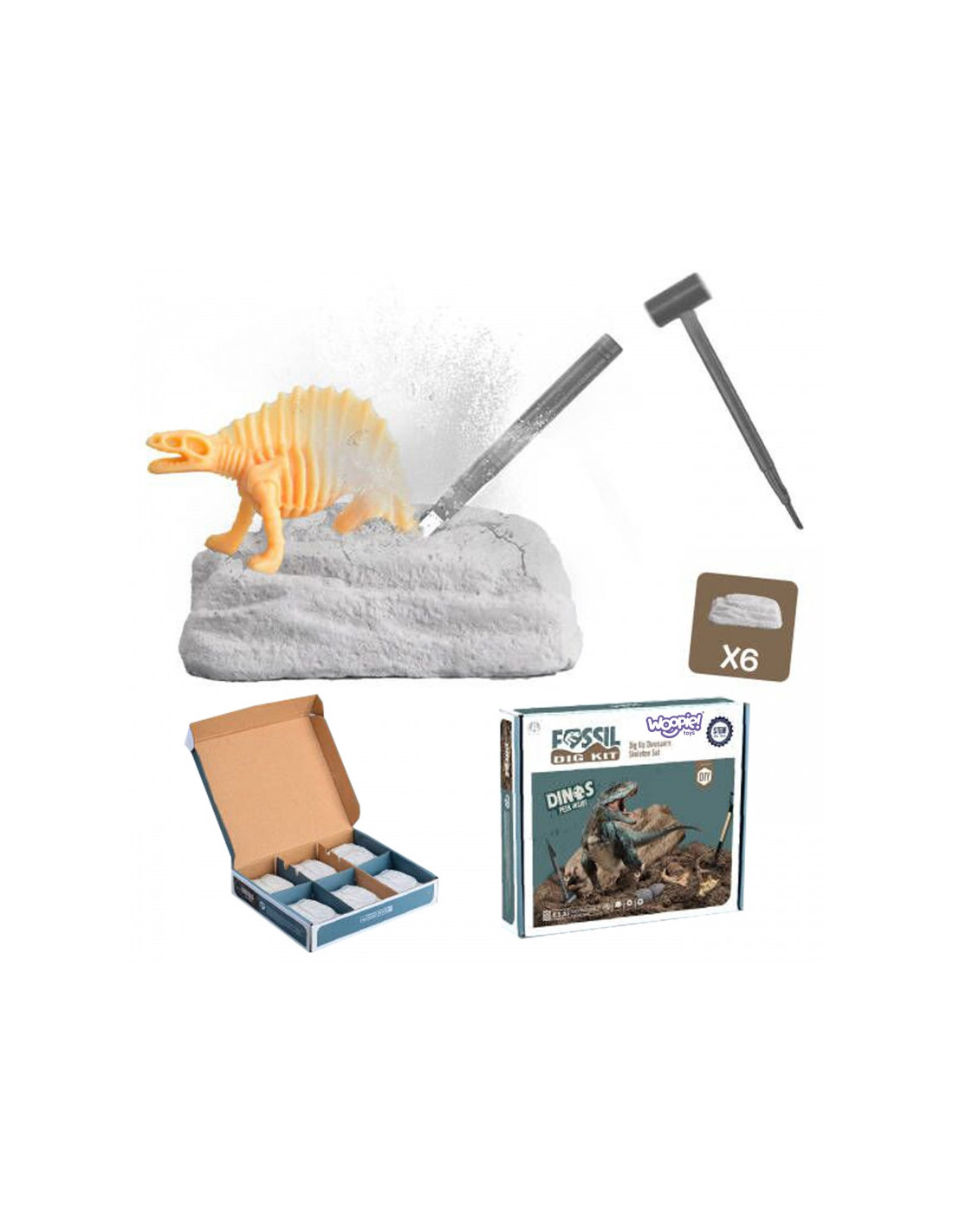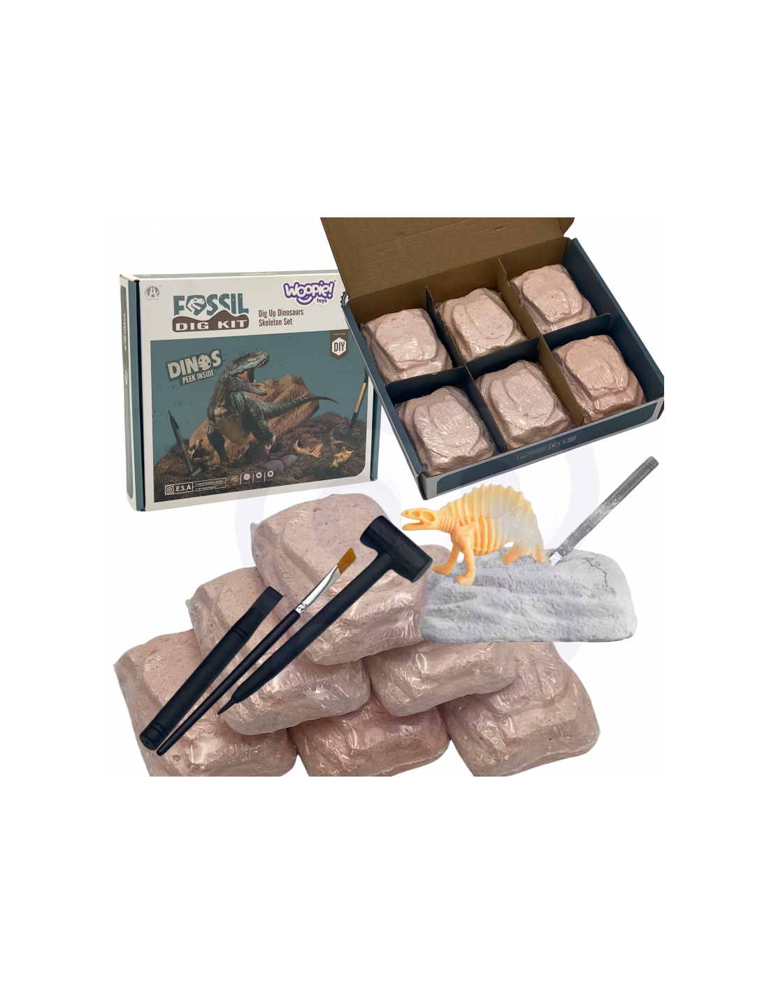 "Fossil" prekės ženklo rinkinys Woopie tai pilna laboratorija mažajam paleontologui. Dėžutėje laukia šešios atskiros uolienos su paslėptais mini dinozaurų skeletais ir įrankių rinkinys: plaktukas, kaltas ir šepetėlis. Kiekvienas blokas yra atskira misija - jūs sutrupinsite, atidengsite gabalėlius ir švelniai juos nuvalysite, kad pabaigoje išdidžiai pristatytumėte savo radinį. Rinkinys sujungia mokymąsi su pramoga, ugdo kantrybę, tikslumą ir koordinaciją, o šešių kaladėlių rinkinys idealiai tinka vienam vaikui arba draugų grupei.
