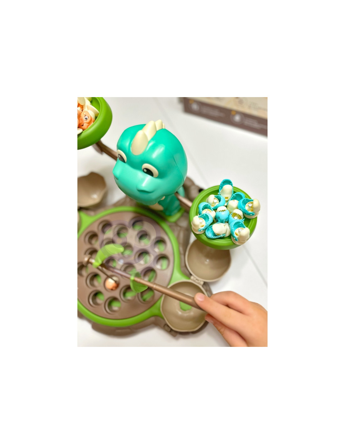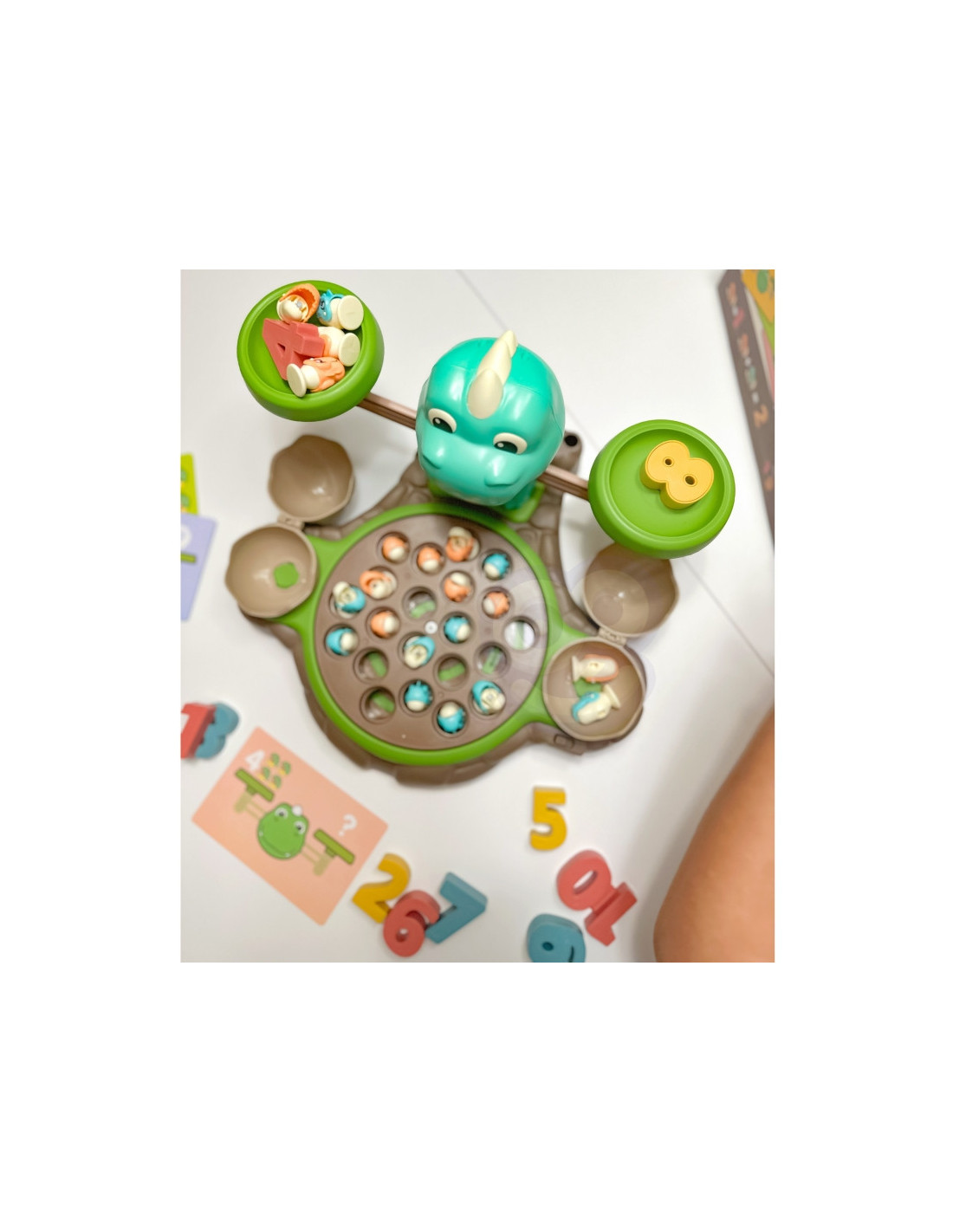 Dinozaur z równoważnią od marki WOOPIE zachęci do poznawania świata, liczb i działań matematycznych, a między nauką przerwa na grę łowienie dinozaurów! Na podstawie znajduje się ruchoma tarcza, z której można łowić małe dinozaury. Włącznik znajduje się na przodzie po prawej stronie. Jak guziczek ustawimy na środku, tarcza zacznie się obracać, gdy przesuniemy go do końca w prawo to usłyszymy przyjemną melodie, która będzie nam towarzyszyć podczas zabawy. Za tarczą umieszczony jest duży dinozaur, na którym możemy bawić się wagą. Za dinozaurem jest miejsce na wędki do łowienia, można dołączyć do nich listki z zestawu. Po bokach tarczy umieszczamy dwa zamykane jaja, gdzie możemy ukryć złowione dinozaury. Ciężarków w zestawie jest 10, jeden ciężar odpowiada jednemu zwierzęciu z zestawu, czyli ciężarek 1 odpowiada jednemu dinozaurowi, ciężarek 2 - odpowiada dwóm dinozaurom, itd. Dodatkowo znajdziemy tu też karty z działaniami i odpowiedziami. Ta zabawka doskonale pobudza wyobraźnię, zachęca do kreatywnego i nieszablonowego myślenia, a także wspaniale rozwija zdolności manualne u najmłodszych, dodatkowo zapewnia wiele frajdy podczas nauki.
