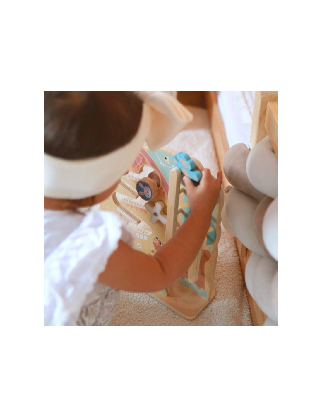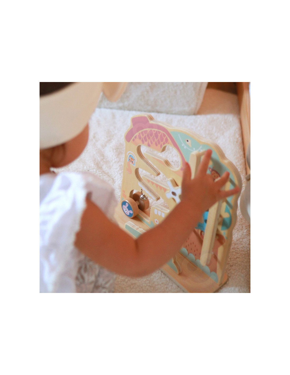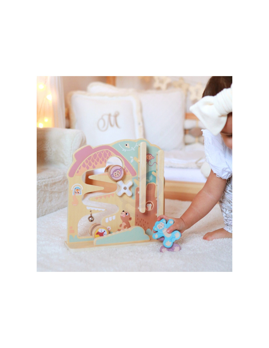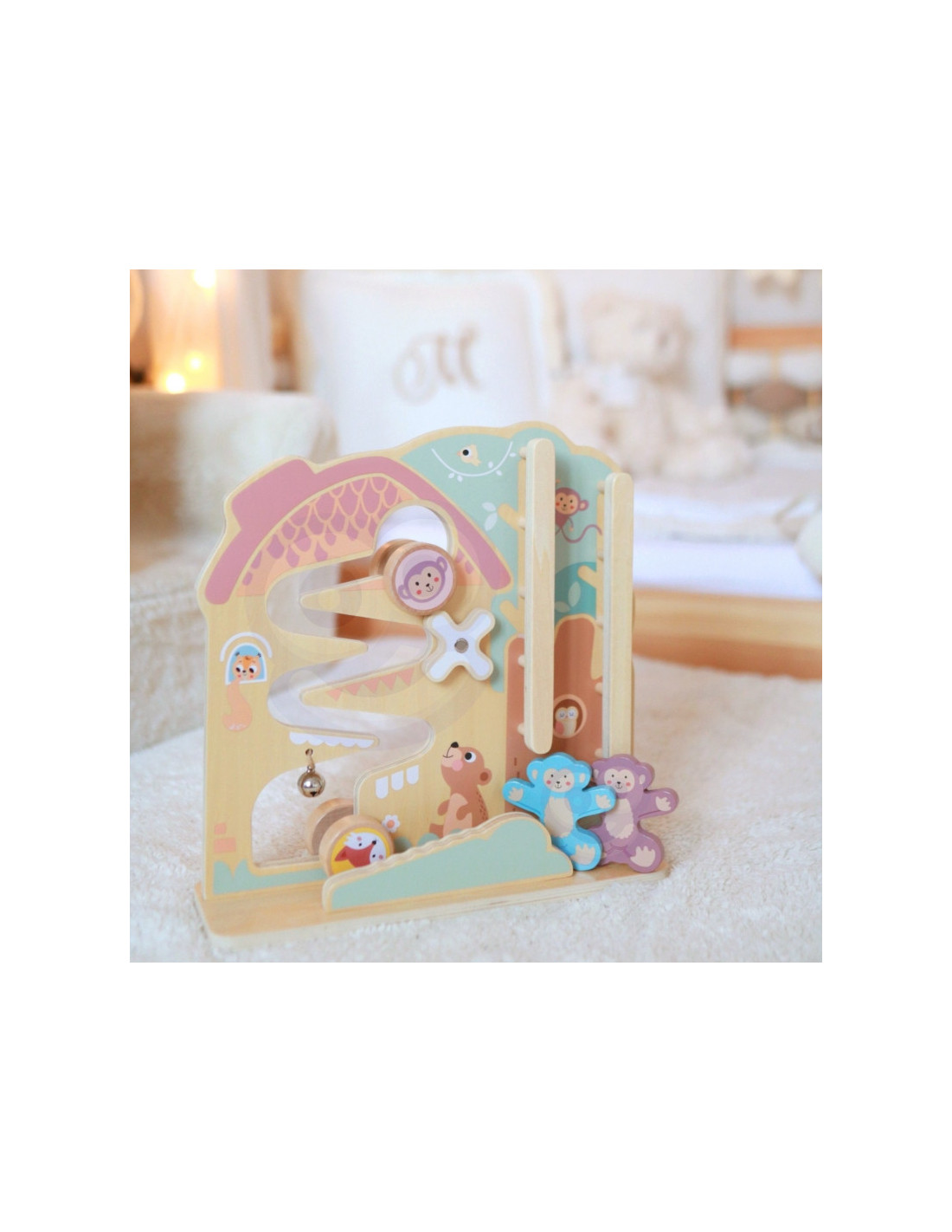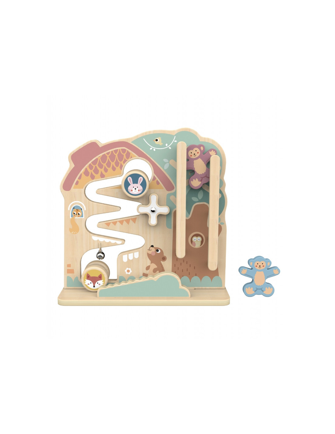 Žaidimo centre - gamtos apsuptas miško namelis, kuriame knibždėte knibžda mažų gyvūnėlių. Dvi linksmos, spalvingos beždžionėlės laukia vaiko pagalbos, kad galėtų nulipti nuo medžio viršūnės. Tuo tarpu triušis ir lapė pasiruošė lenktynėms, o vaiko užduotis - padėti jiems startuoti. Žaidimas baigiasi maloniu varpelio skambesiu, kuris taip pat skatina vaiko klausos suvokimą.