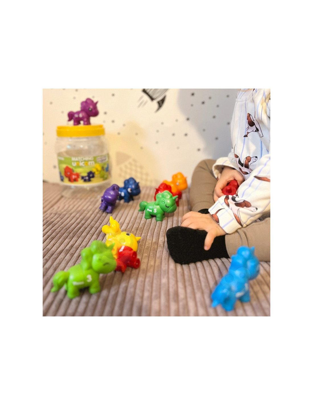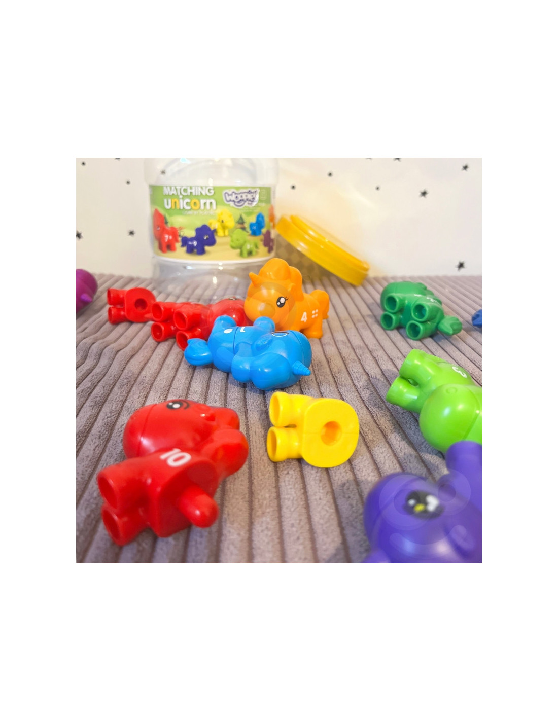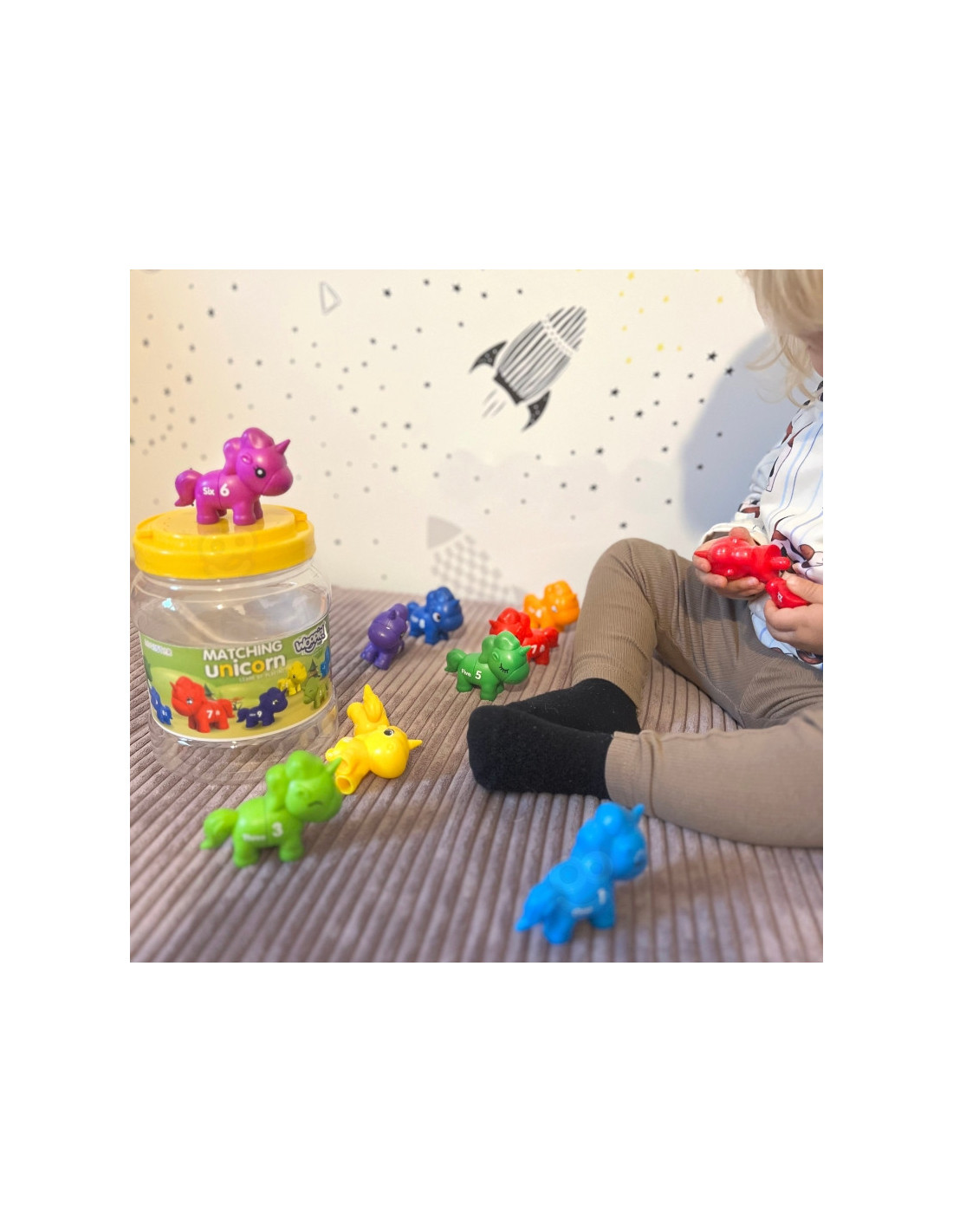 Mokomasis žaislas"Suderink skaičius" yra kūrybiškas žaislas, kuris nukels jūsų vaiką į stebuklingą vienaragių pasaulį. Žaisdami mažyliai gali sujungti įvairias vienaragio dalis, derindami jas pagal spalvas, skaičius ar formas. Tai ne tik puiki pramoga, bet ir lavinantis žaislas, skatinantis vaiko rankų darbo įgūdžius, įžvalgumą ir loginį mąstymą. Iš spalvingų vienaragių sudarytas rinkinys sukurtas taip, kad vaikams suteiktų valandų valandas įtraukiančio ir informatyvaus žaidimo.