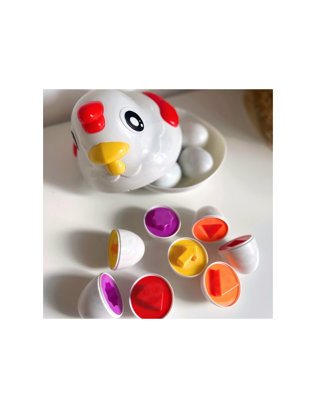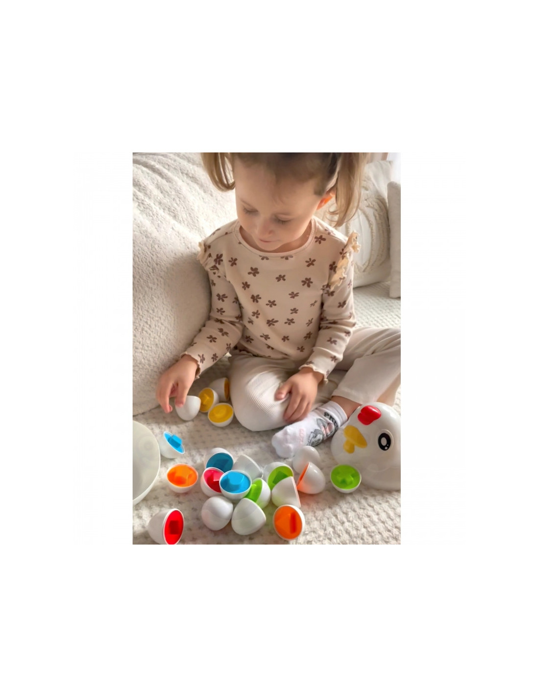 WOOPIEspalvotas rūšiuotuvas višta yra daugiafunkcinis lavinamasis žaislas, kuris žaisdamas lavina pagrindinius vaikų įgūdžius. Vištelė slepia įvairių formų žaislinių kiaušinių rinkinį, kuriuos vaikas turi įstatyti į atitinkamas skylutes, todėl mažylis mokosi atpažinti formas, spalvas ir lavina rankų darbo įgūdžius. Kiekviena iš 12 detalių yra skirtingos formos ir spalvos, todėl žaislas yra ne tik vizualiai patrauklus, bet ir labai lavinantis. Kura atsidaro, kad mažylis galėtų lengvai sudėti visas viduje esančias detales, taip pat mokosi organizuotumo ir tvarkos.