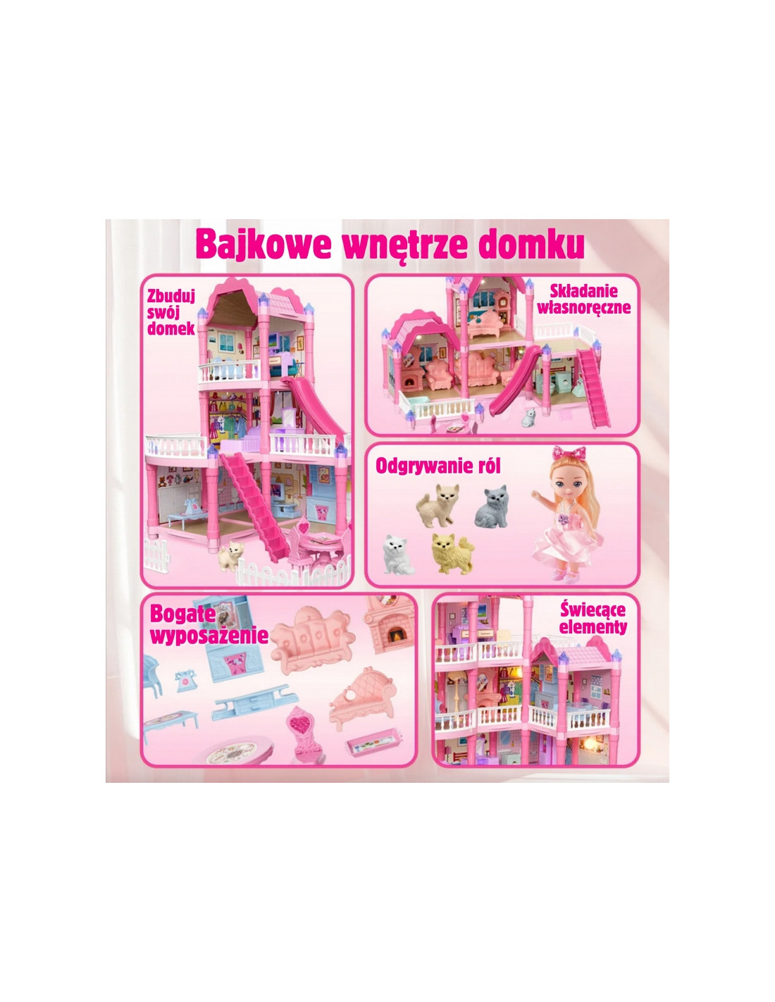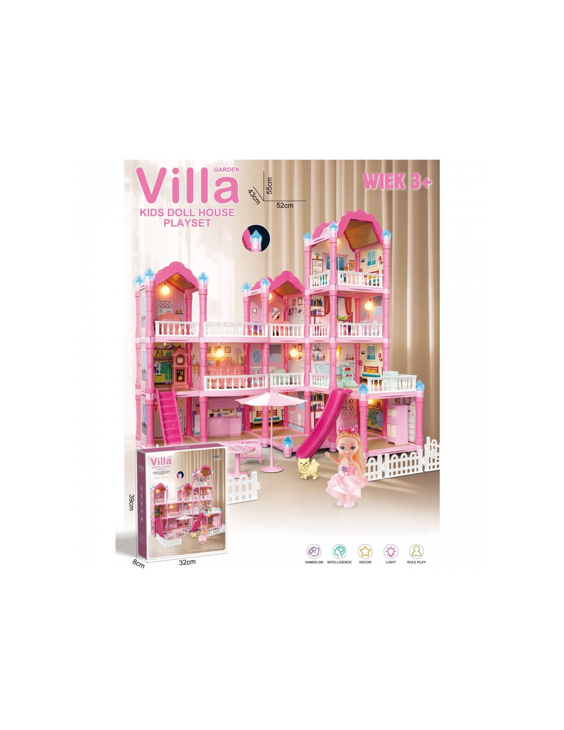 Poznaj wspaniały, trzypiętrowy domek dla lalek z różowym dachem, który stanie się ulubionym miejscem zabawy Twojego dziecka! Ta piękna willa o imponujących wymiarach została zaprojektowana z dbałością o każdy szczegół, co sprawia, że wygląda jak prawdziwy dom. Zestaw zawiera aż 296 elementów do złożenia, w tym bogate wyposażenie wnętrza i urocze mebelki, które pozwolą małej projektantce na samodzielne zaaranżowanie każdego z pomieszczeń. To idealna zabawka, która rozwija kreatywność, wyobraźnię oraz umiejętności manualne. W zestawie znajduje się wszystko, co potrzebne, aby stworzyć wymarzony dom dla lalek: od mebelków, przez akcesoria, aż po uroczą lalkę-mieszkankę. Zabawa w dom nigdy nie była tak realistyczna i wciągająca! Zjeżdżalnia, schody i taras to dodatkowe elementy, które urozmaicą zabawę i pozwolą na odgrywanie wielu scenariuszy. Dzięki solidnej konstrukcji domek zapewnia długie godziny fantastycznej i bezpiecznej zabawy.