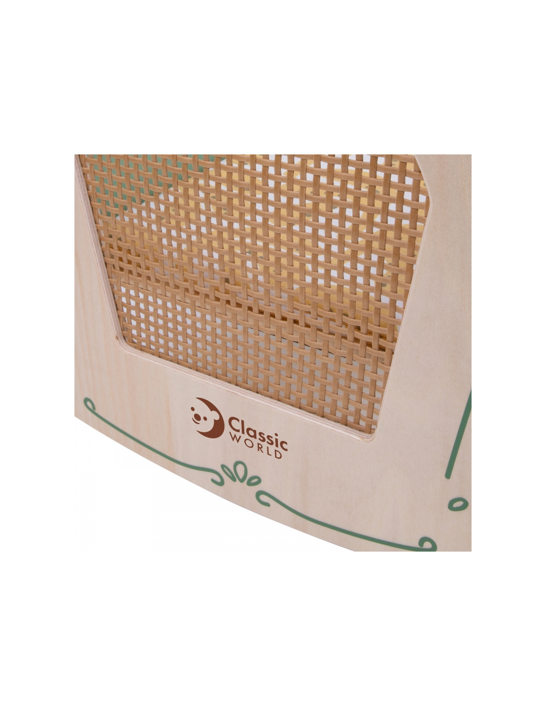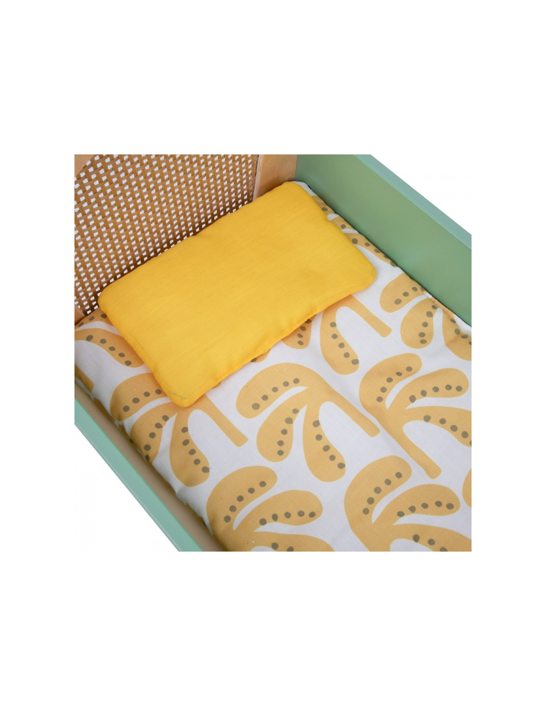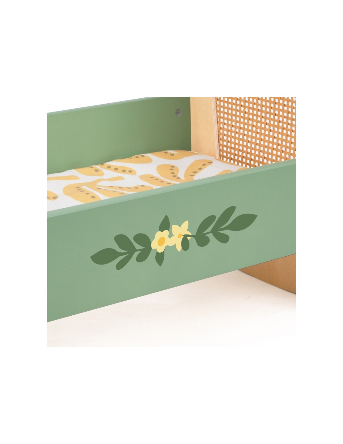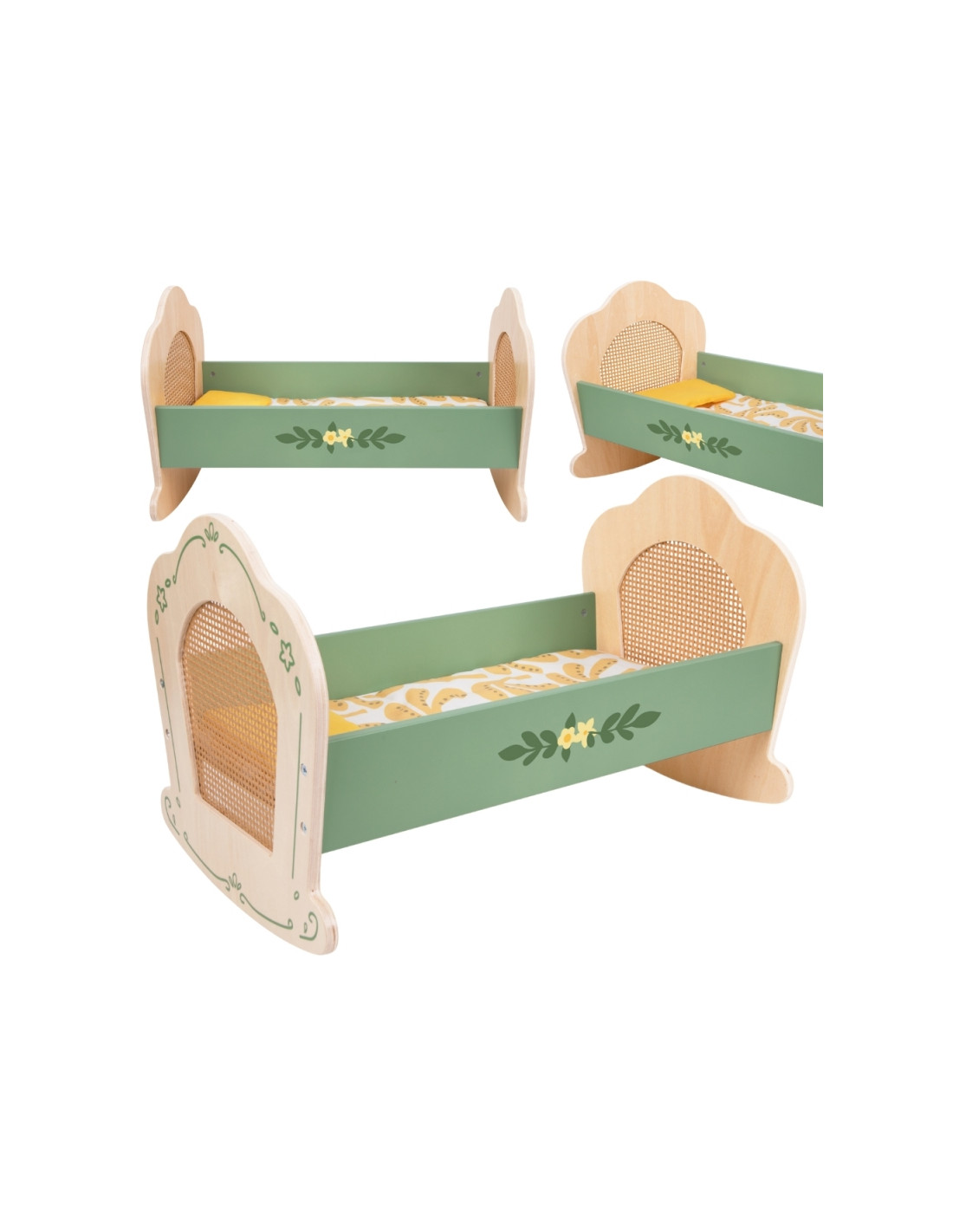 Ši žavinga žalių atspalvių lopšinė sujungia nesenstantį vintažinio stiliaus žavesį su natūraliu rotango pynimo grožiu. Klasikinės detalės ir prislopintos spalvos paverčia ją puikiu bet kurio vaiko žaidimų papildymu, nesvarbu, ar tai būtų žaidimai su nameliu, ar lėlių ar meškiukų priežiūra. Subtilūs papuošimai suteikia unikalumo, o minkštas patalynė užtikrina patogų jūsų lėlės miegą.