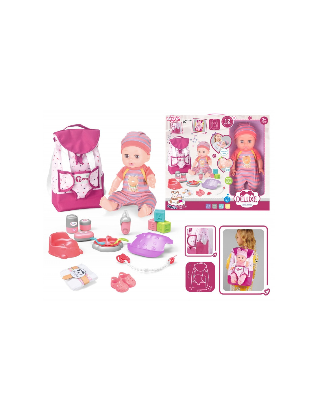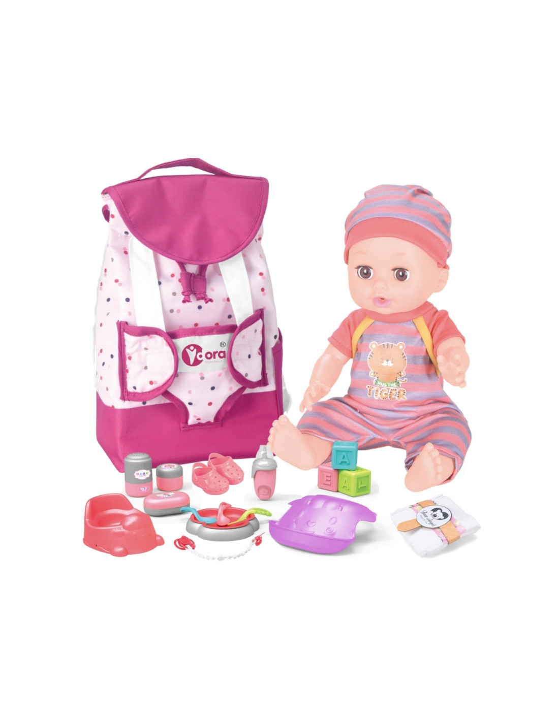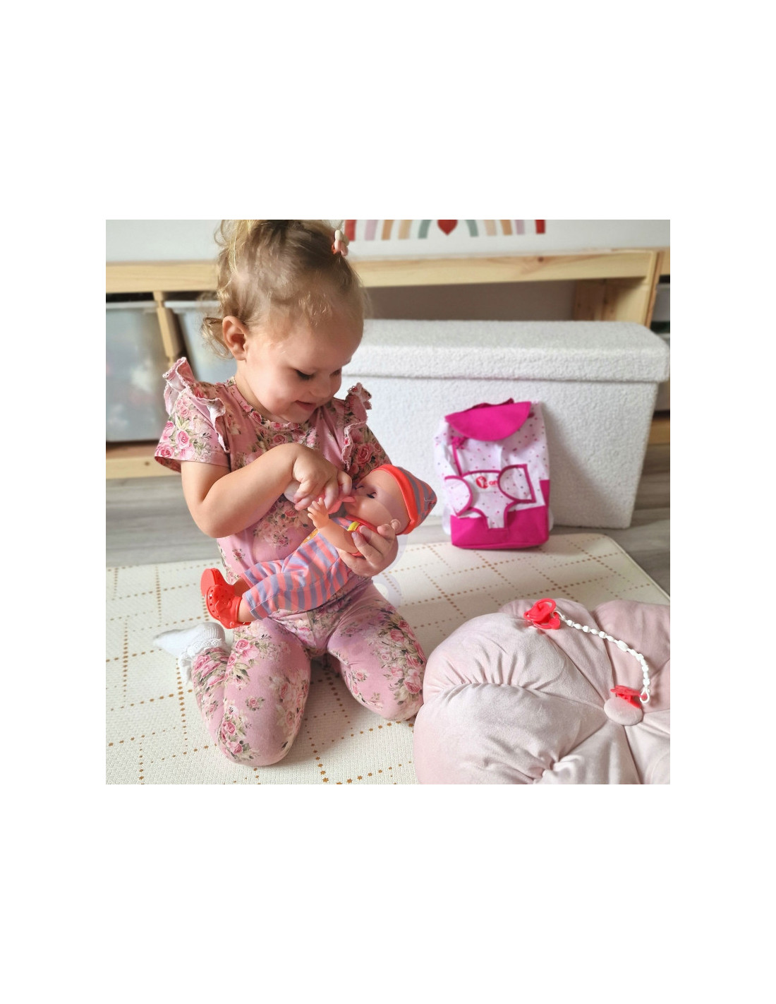 Pridedami visi reikalingi priedai lėlei prižiūrėti. Rasite maitinimo, perrengimo ir žaidimo rinkinį . Lėlė netgi gali šlapintis į puoduką- tai tikroviška funkcija, kuri pradžiugins kiekvieną vaiką. Pasivaikščiojimams pasiimkite lėlę ir kuprinę su dėže, kad vaikai žaisdami galėtų būti dar atviresni ir kūrybiškesni.
