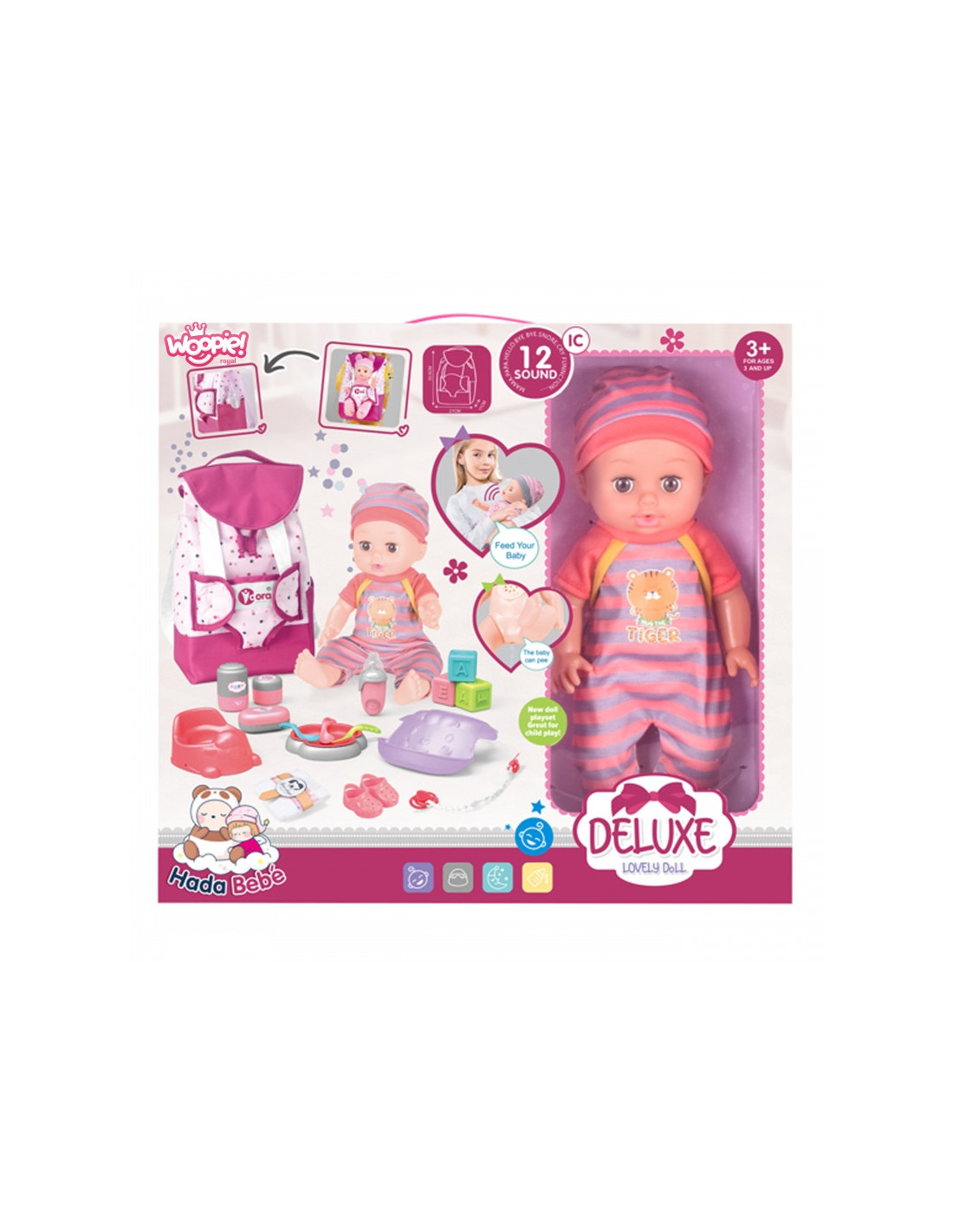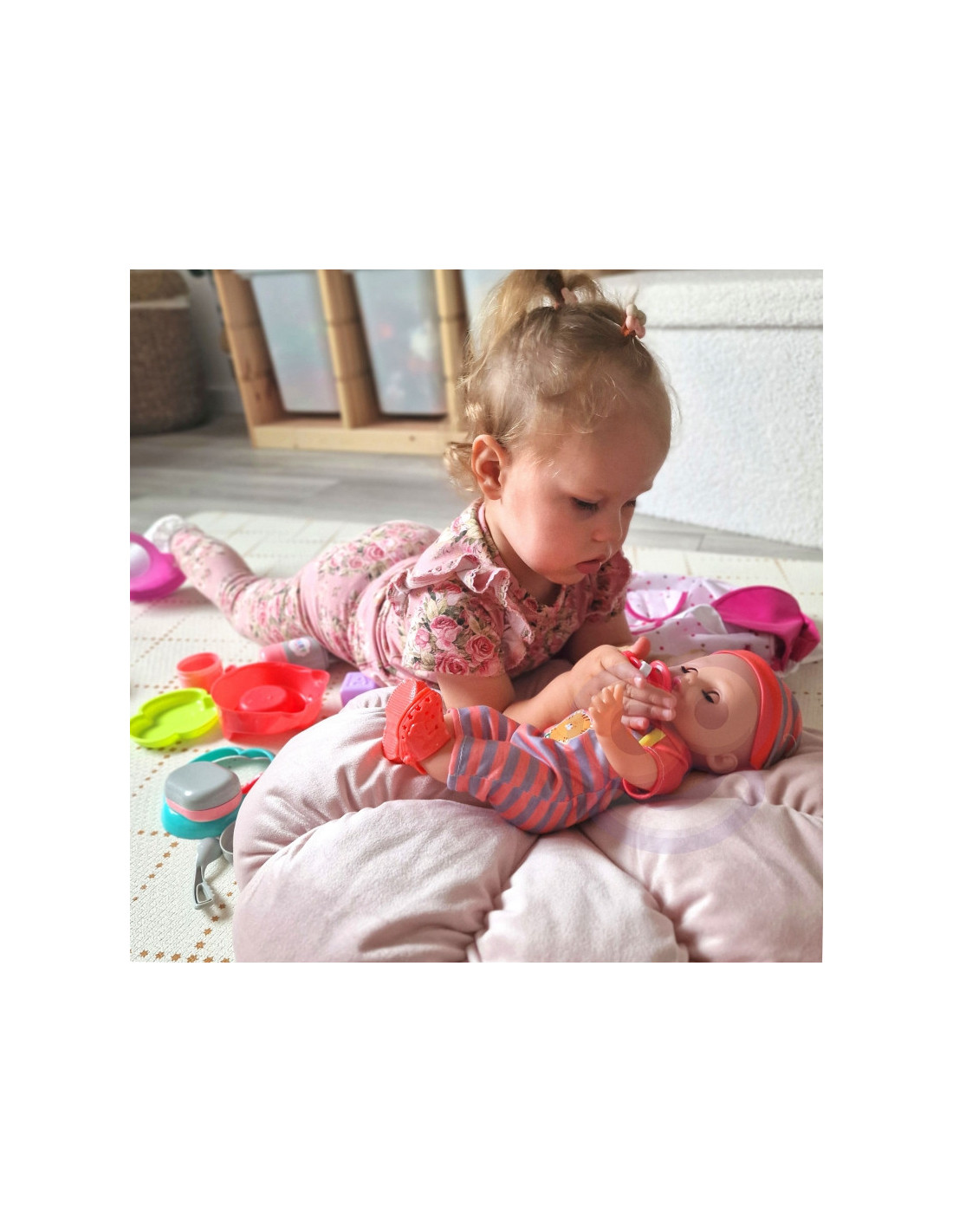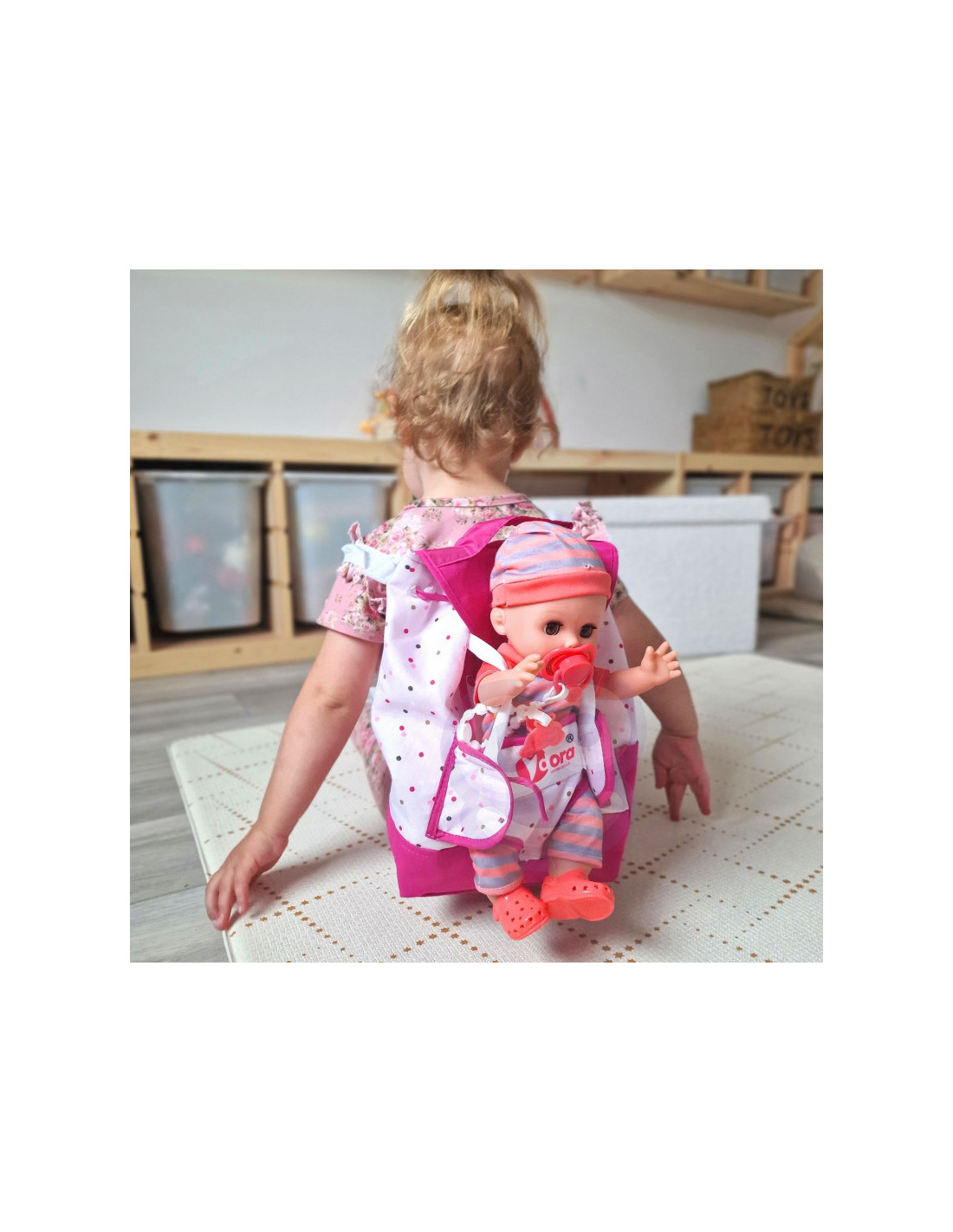Pridedami visi reikalingi priedai lėlei prižiūrėti. Rasite maitinimo, perrengimo ir žaidimo rinkinį . Lėlė netgi gali šlapintis į puoduką- tai tikroviška funkcija, kuri pradžiugins kiekvieną vaiką. Pasivaikščiojimams pasiimkite lėlę ir kuprinę su dėže, kad vaikai žaisdami galėtų būti dar atviresni ir kūrybiškesni.