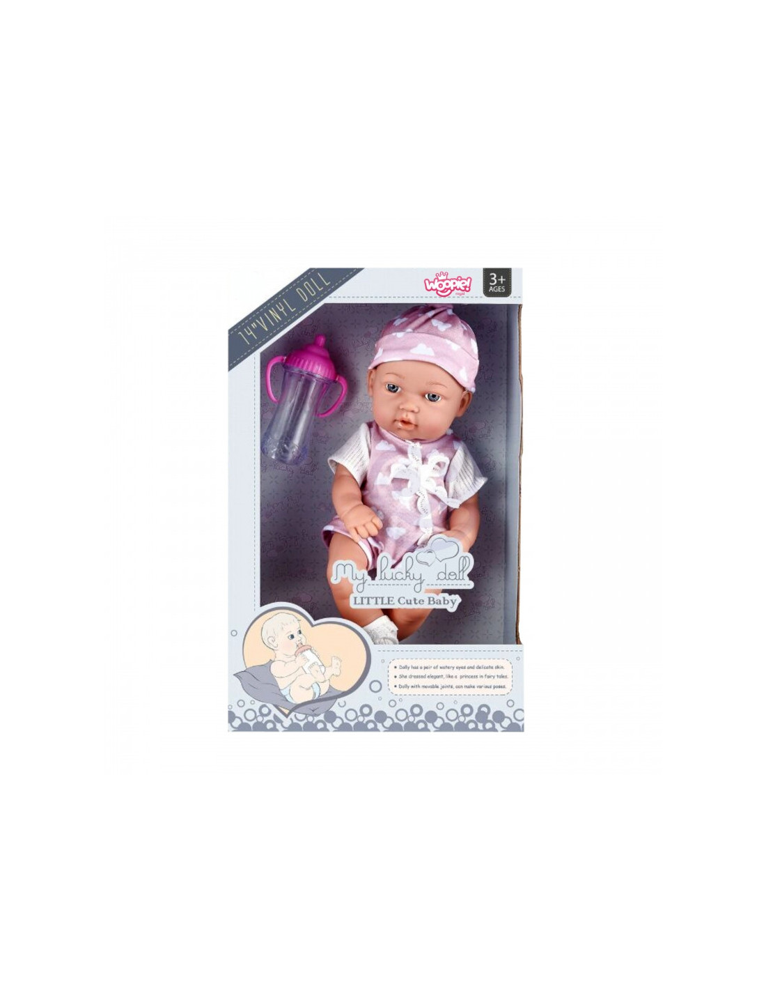 Mano žavusis bebras iš prekės ženklo Woopie Royal yra gaminys, kuris pradžiugins jūsų vaiką. Ji turi judančias galūnes ir gražias akis. Lėlė aprengta rožiniu žavingu kostiumėliu, o ant galvos turi atitinkamą kepuraitę ir kojinaites. Be to, komplekte yra rožinis buteliukas, kurį lėlė gali laikyti rankose.
