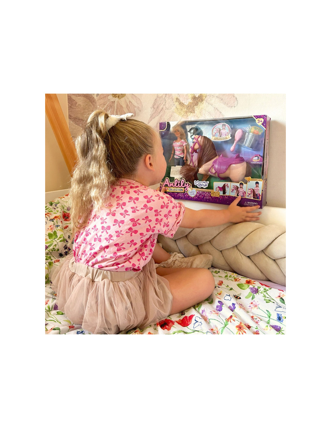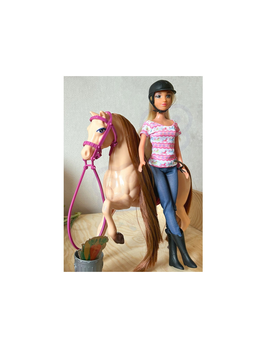 Stilinga lėlės apranga ir tikroviški jojimo aksesuarai.