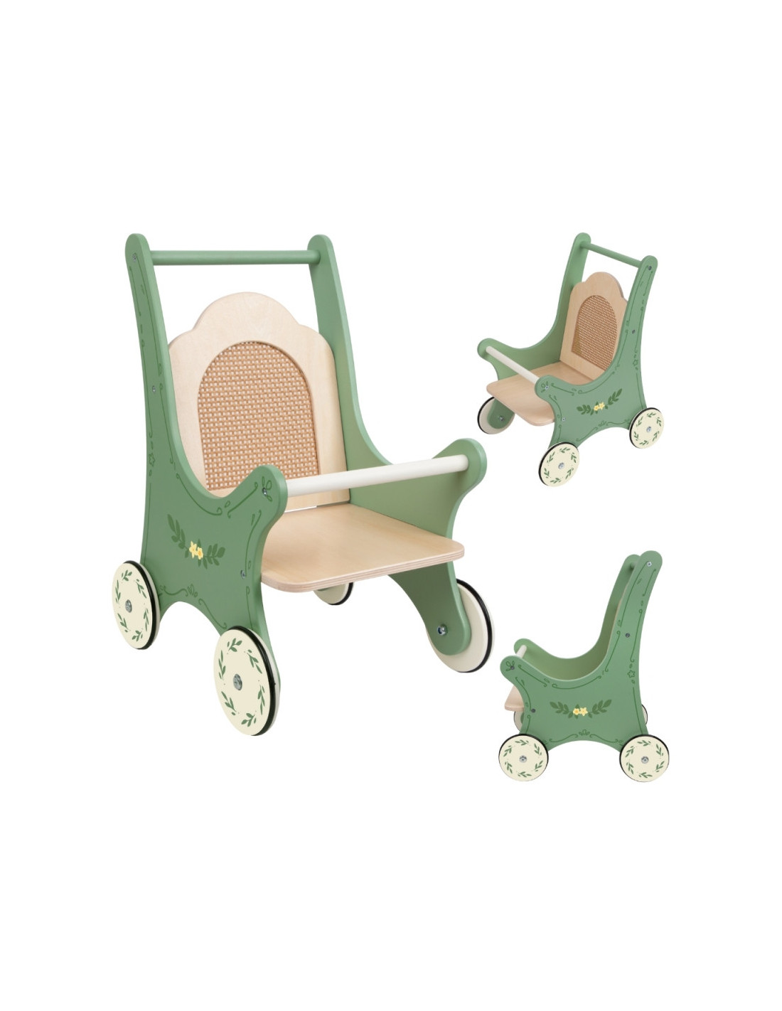 Šiame žavingame lėlių vežimėlyje klasikinis stilius derinamas su natūraliomis medžiagomis. Žalios spalvos dizainas su gėlių ornamentais ir rotango atlošu traukia dėmesį ir sukuria nepakartojamą retro atmosferą. Tai puikus žaislas vaikams, mėgstantiems žaisti vaidmeninius žaidimus ir rūpintis savo lėlėmis bei pliušiniais žaislais.
