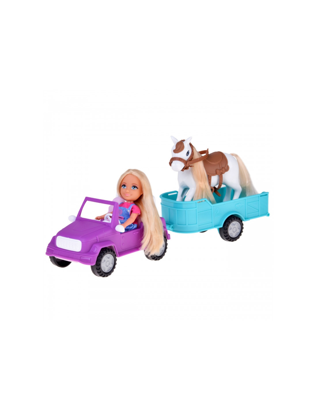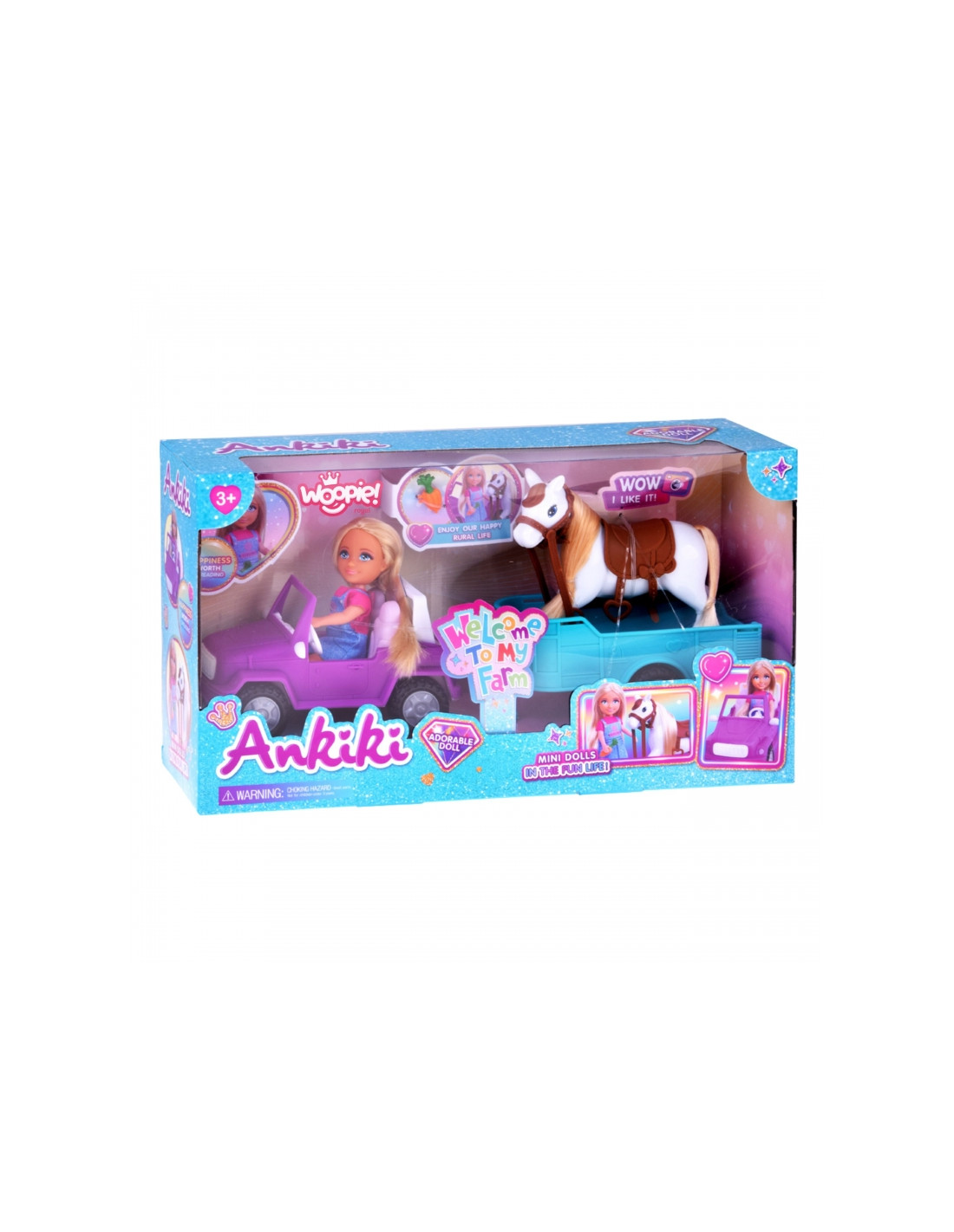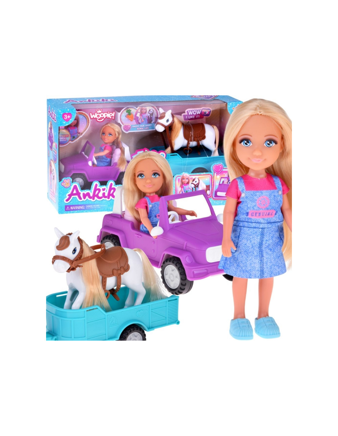 Leiskitės į nuotykius užmiestyje su Woopie lėlės su arkliu, automobiliu ir priekaba rinkiniu „Kiki“ ! Šiame išsamiame rančos/ūkio tematikos vaidmenų žaidimo rinkinyje yra mini lėlė , kuri gali vairuoti violetinį visureigį . Pritvirtinkite turkio spalvos priekabą , kad pervežtumėte savo arklį ! Lėlė turi ilgus, šviesius plaukus , kuriuos galima šukuoti, o arklys turi balną ir kamanas . Tai puikus žaislas vaizduotei ir kūrybiškumui lavinti, leidžiantis kurti begalę ūkio scenarijų. Tinka vaikams nuo 3 metų amžiaus .