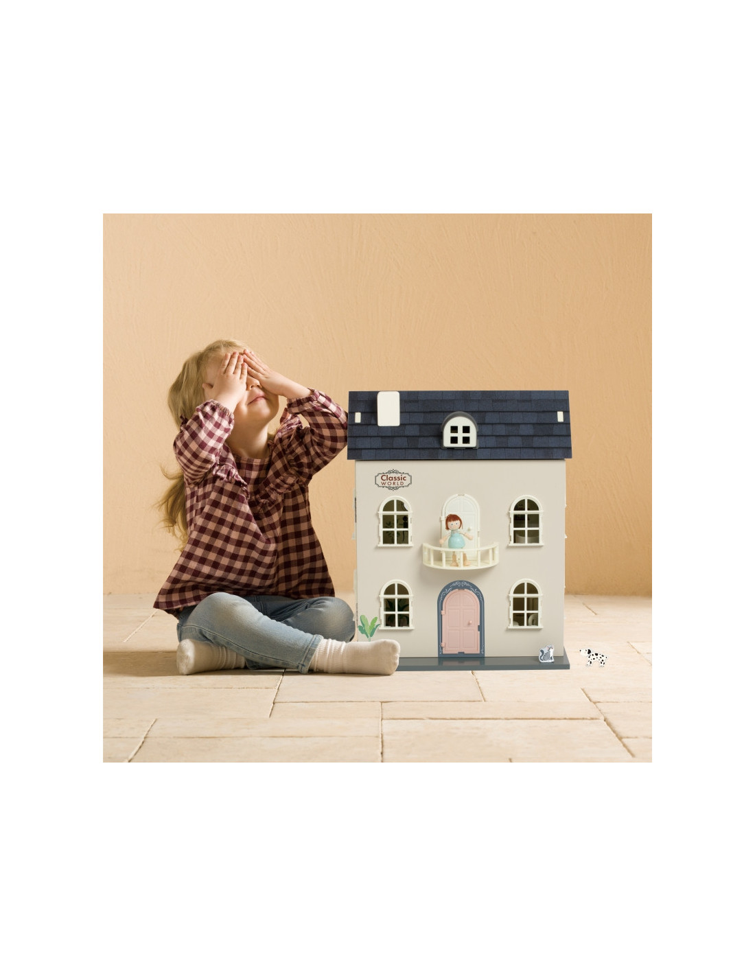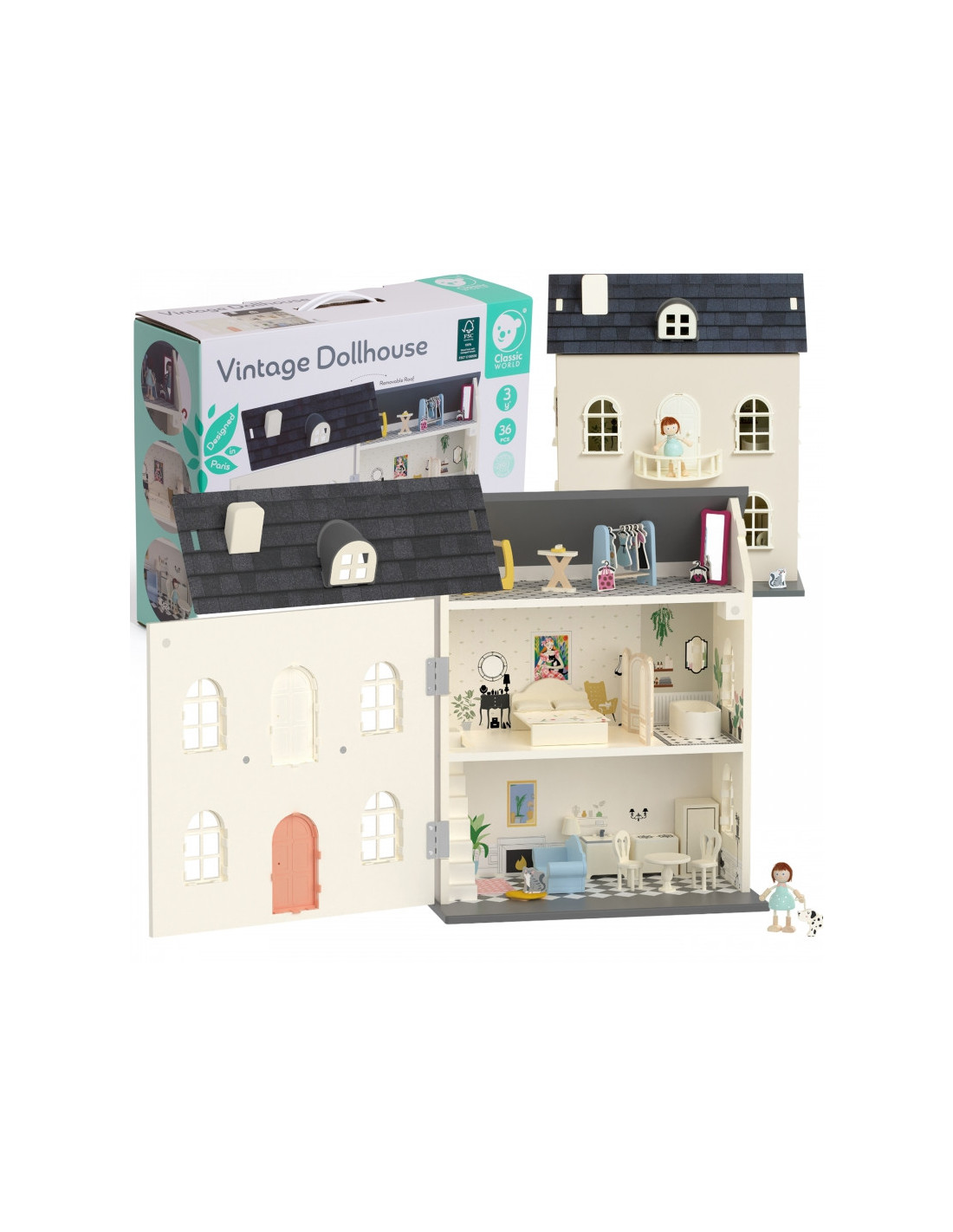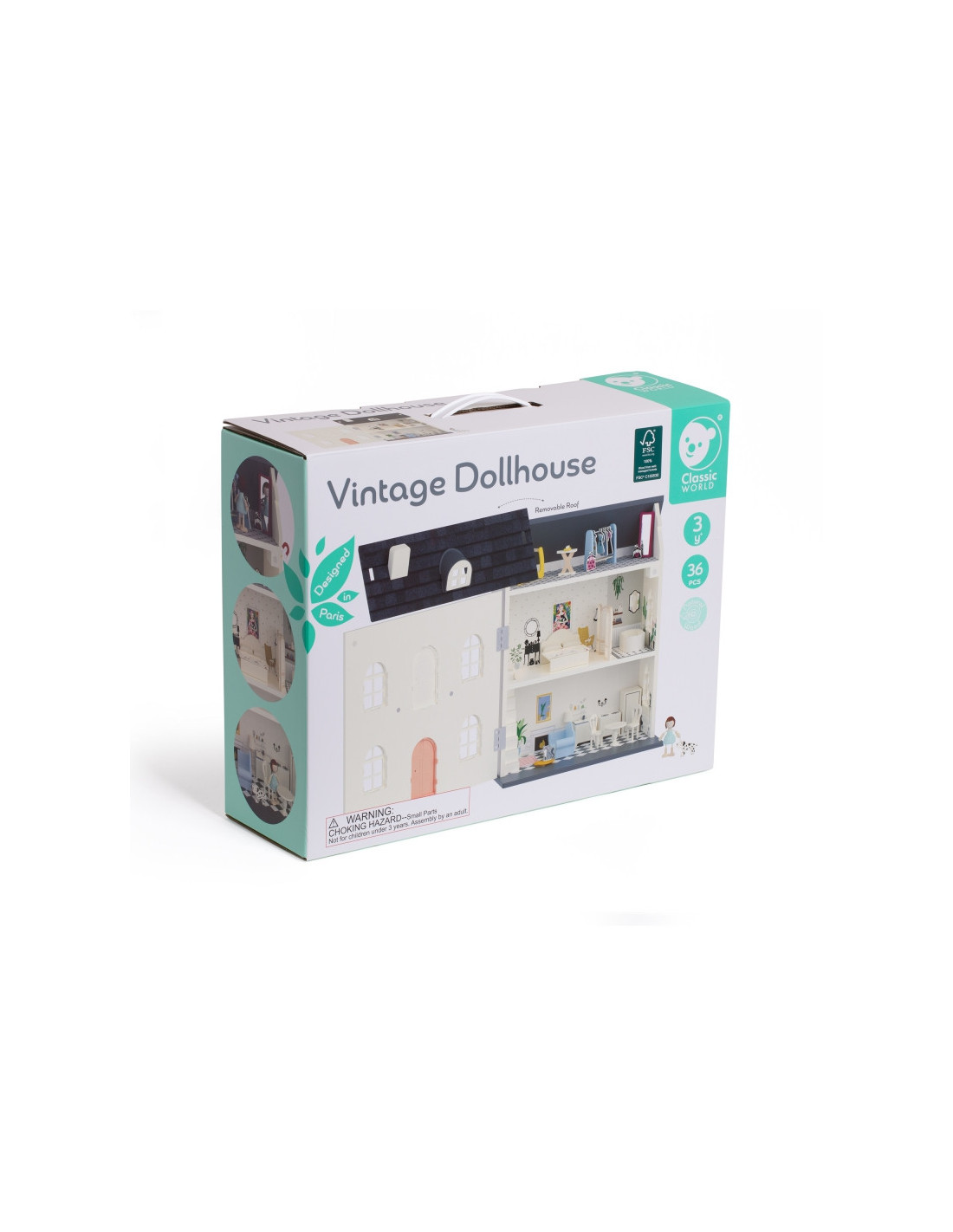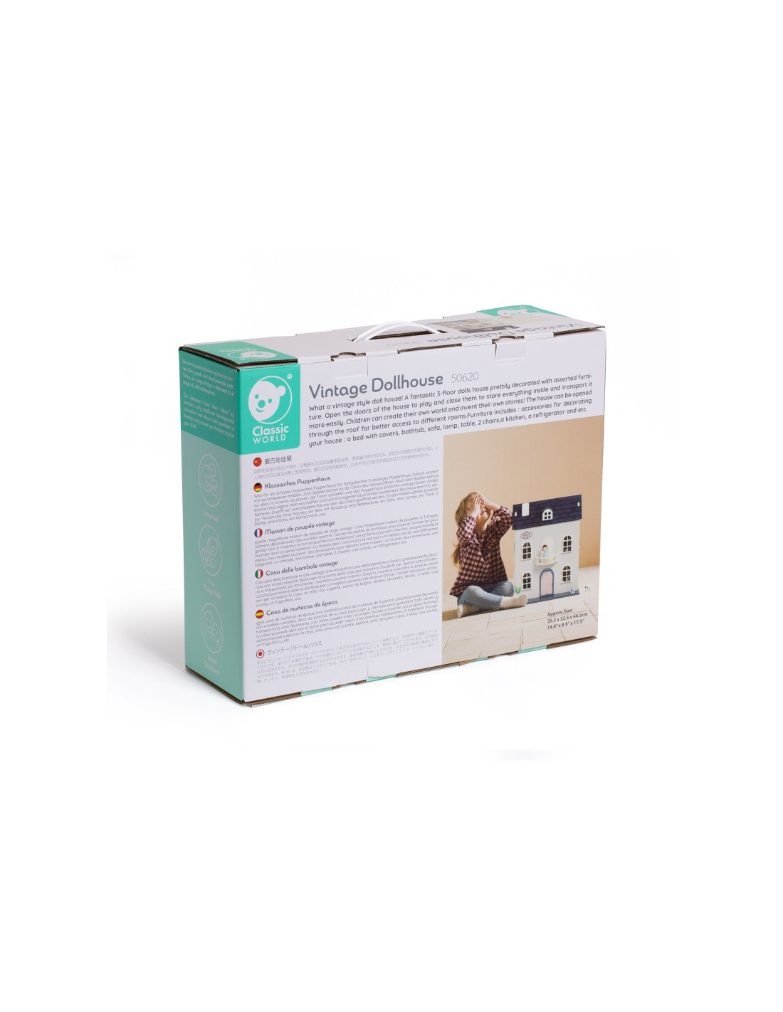Žavus vintažinio stiliaus lėlių namelis iš CLASSIC WORLD, kuris pradžiugins kiekvieną vaiką! Šis fantastiškas, 3 aukštų lėlių namelis yra gražiai dekoruotas įvairiais baldais. Namelis atsidaro per stogą, todėl lengviau patekti į įvairius kambarius. Baldus sudaro dekoratyviniai aksesuarai, tokie kaip lova su užtiesalu, vonia, sofa, lempa, stalas, dvi kėdės, virtuvėlė ir šaldytuvas.