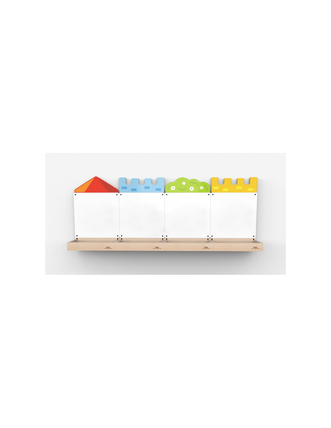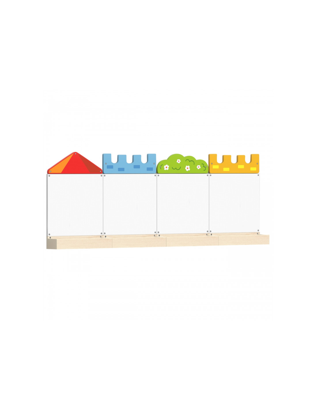 Į komplektą neįeina nuotraukose parodyti papildomi magnetiniai kaladėlės. Rinkinį sudaro 4 magnetinės lentos, 4 dekoratyviniai elementai ir 4 lentų laikikliai.