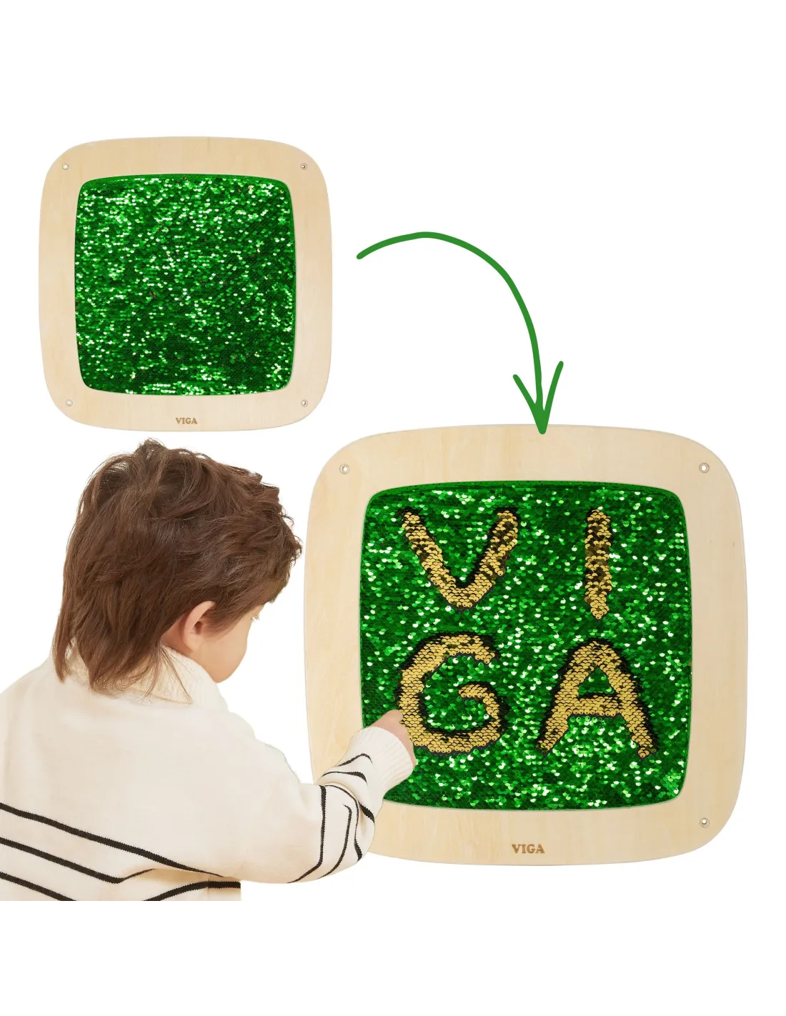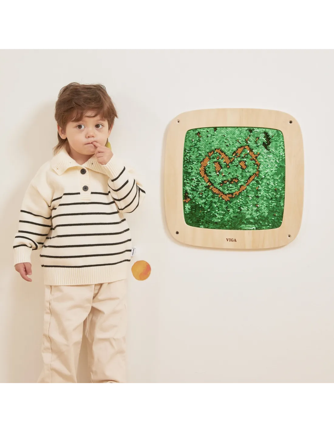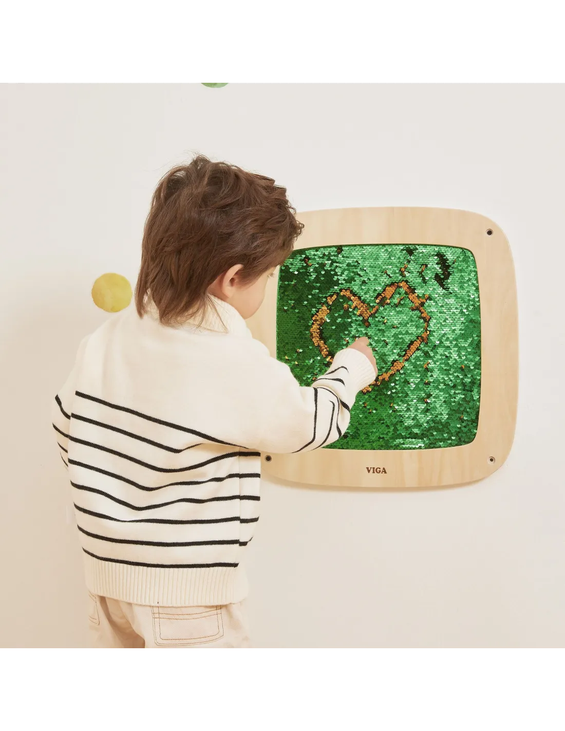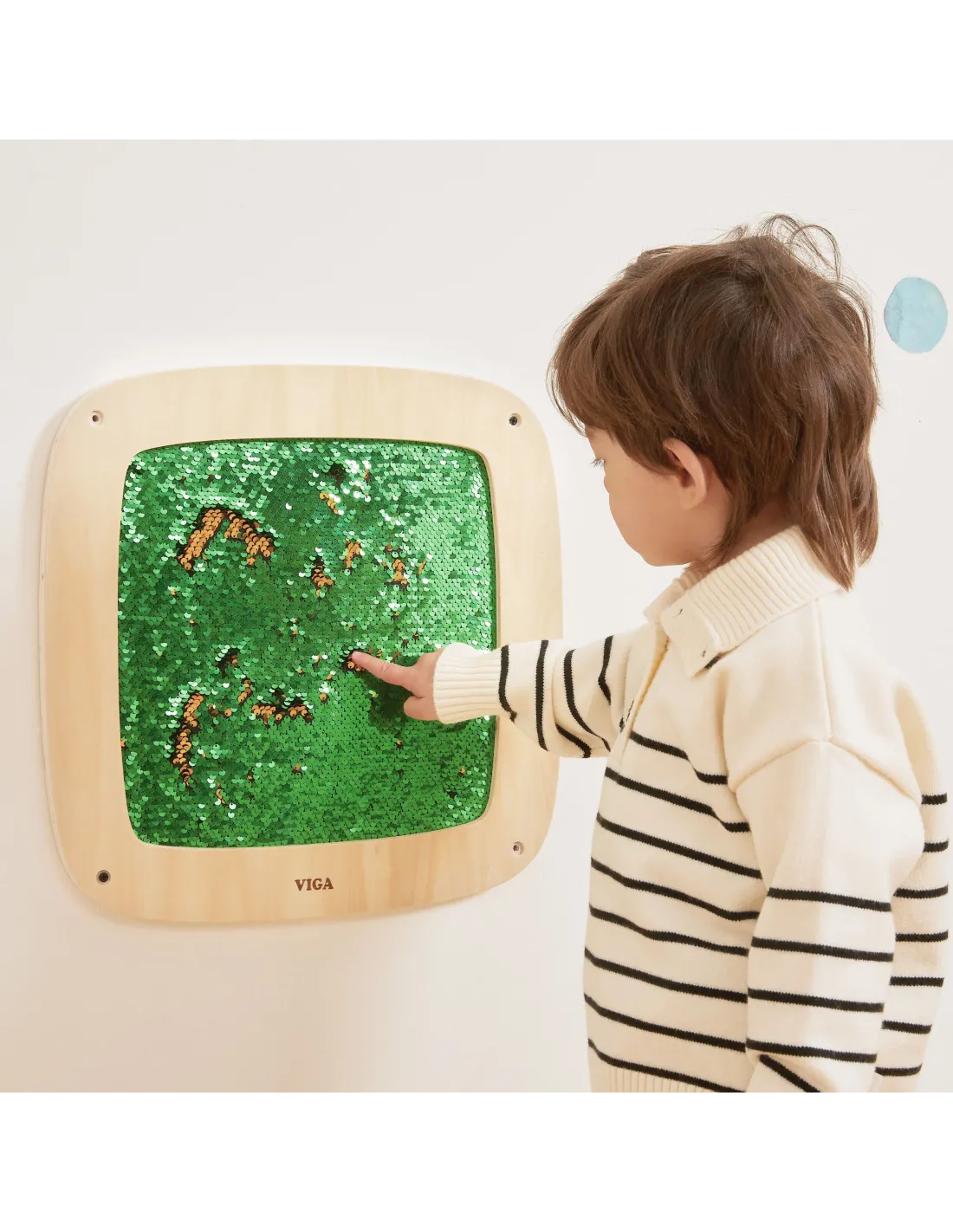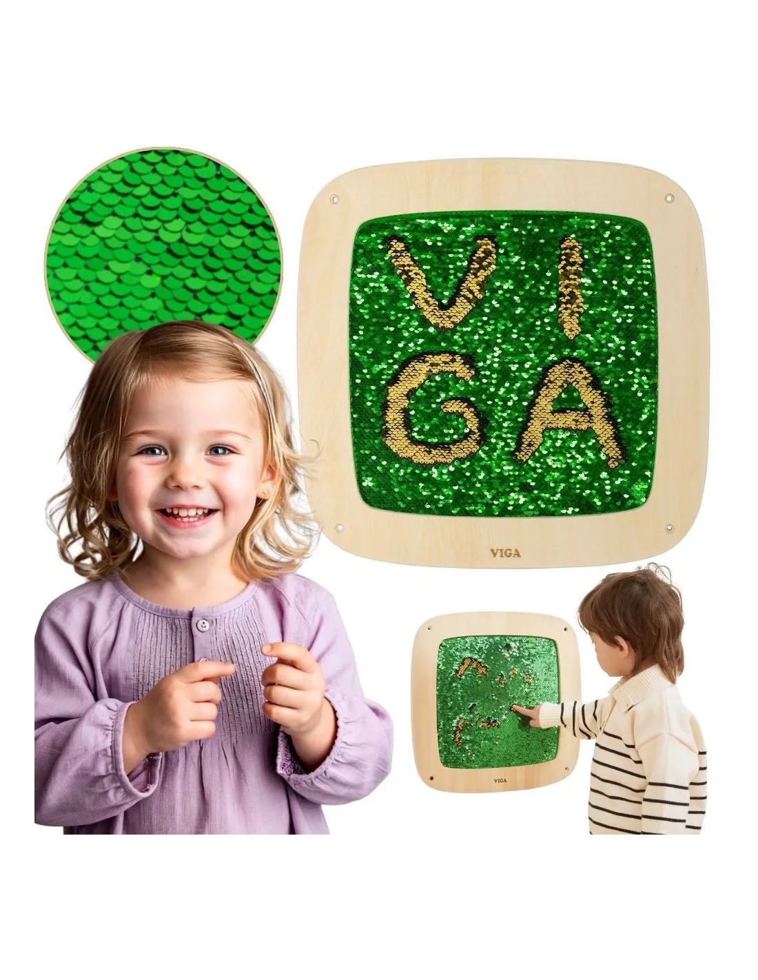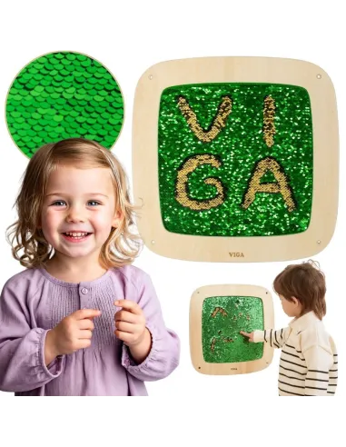 This striking sequin wall panel from Viga is a true blend of play and learning! By sliding their hand across the surface, children discover hidden colors and create their own patterns , letters, or shapes. The double-sided sequins change color with every movement, stimulating curiosity and encouraging experimentation. The soft, safe texture makes play not only creative but also relaxing. It's perfect for home, preschool, or sensory room – it teaches through touch, movement, and free expression.