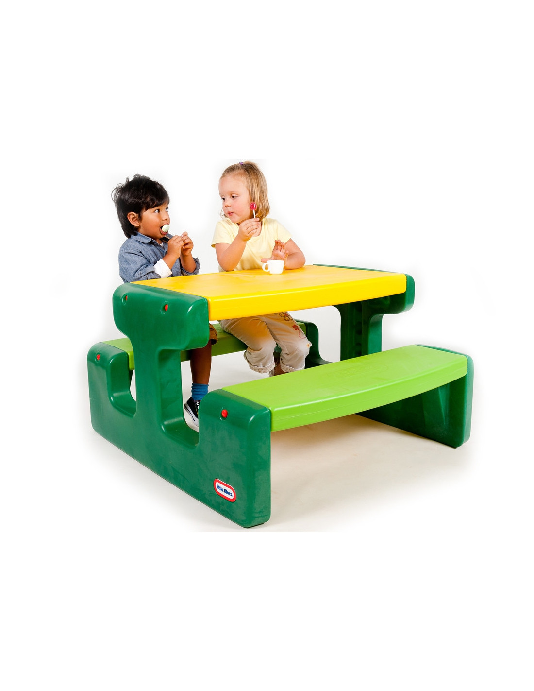 Large Green Picnic Table Designed by the renowned toy manufacturer Little Tikes, this one-piece picnic table is designed for both indoor and outdoor use. It's perfect for all kinds of tasks and play. It's a great place to relax or enjoy a meal outdoors.