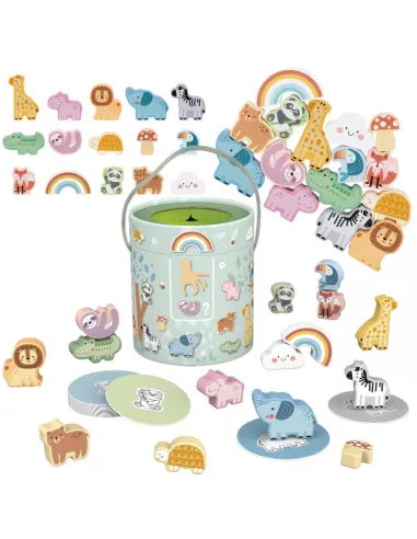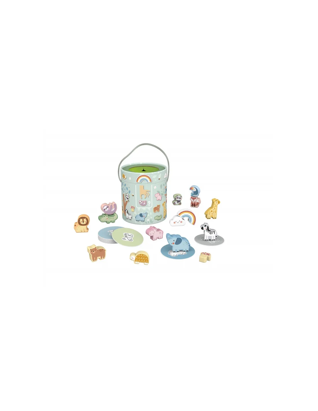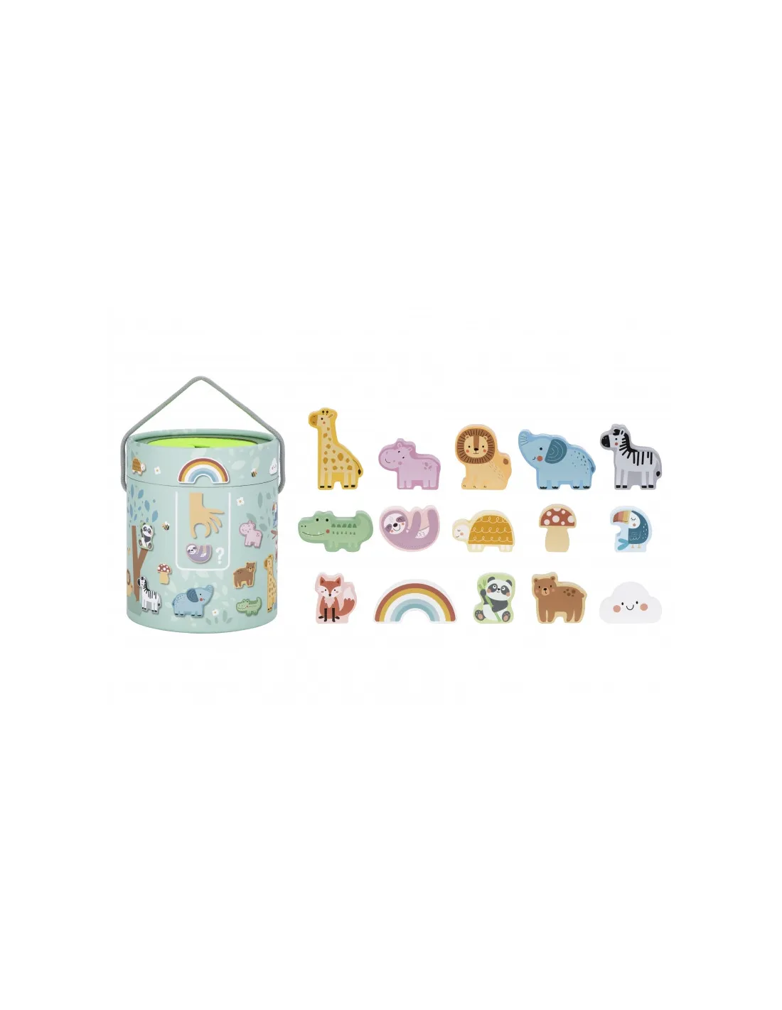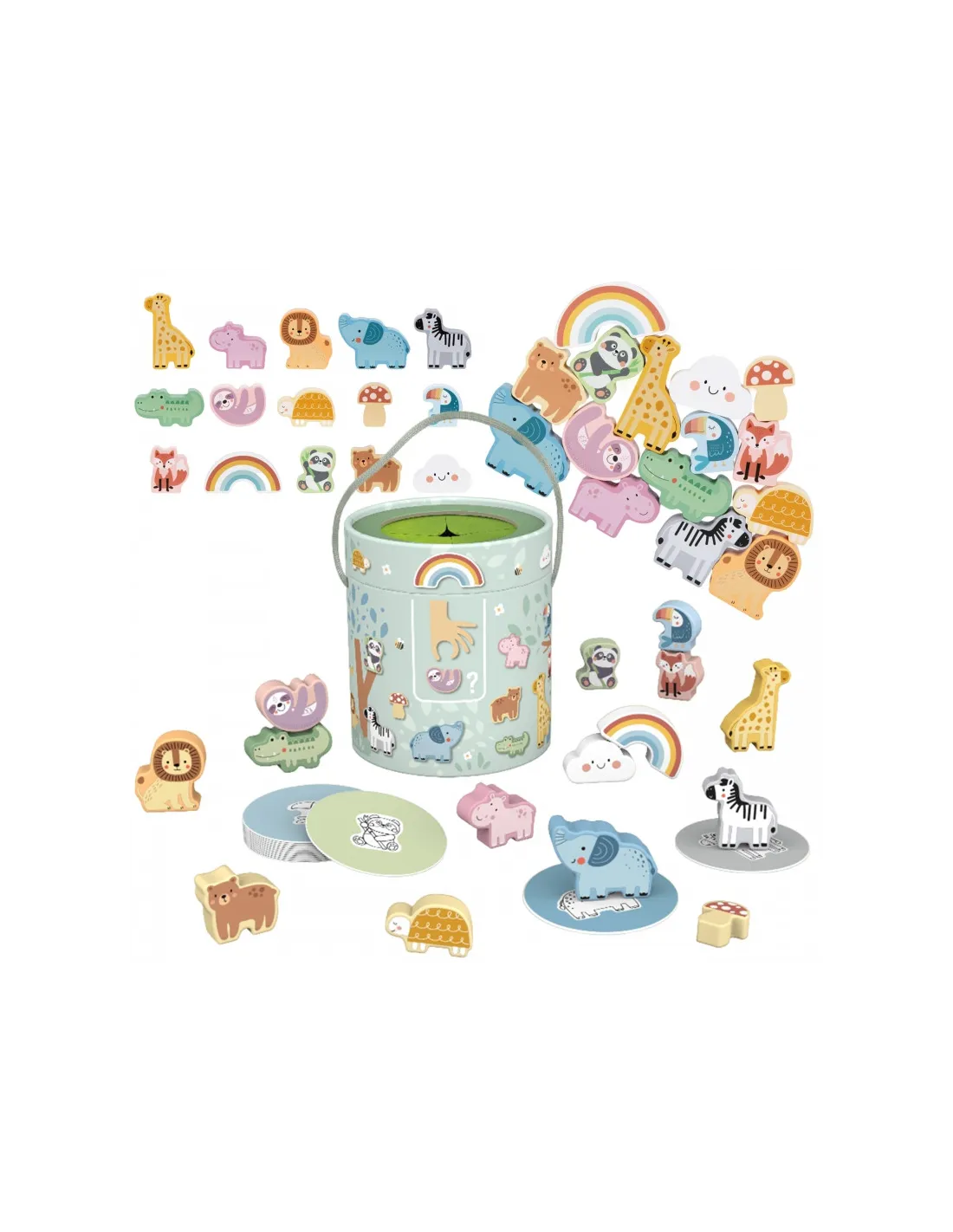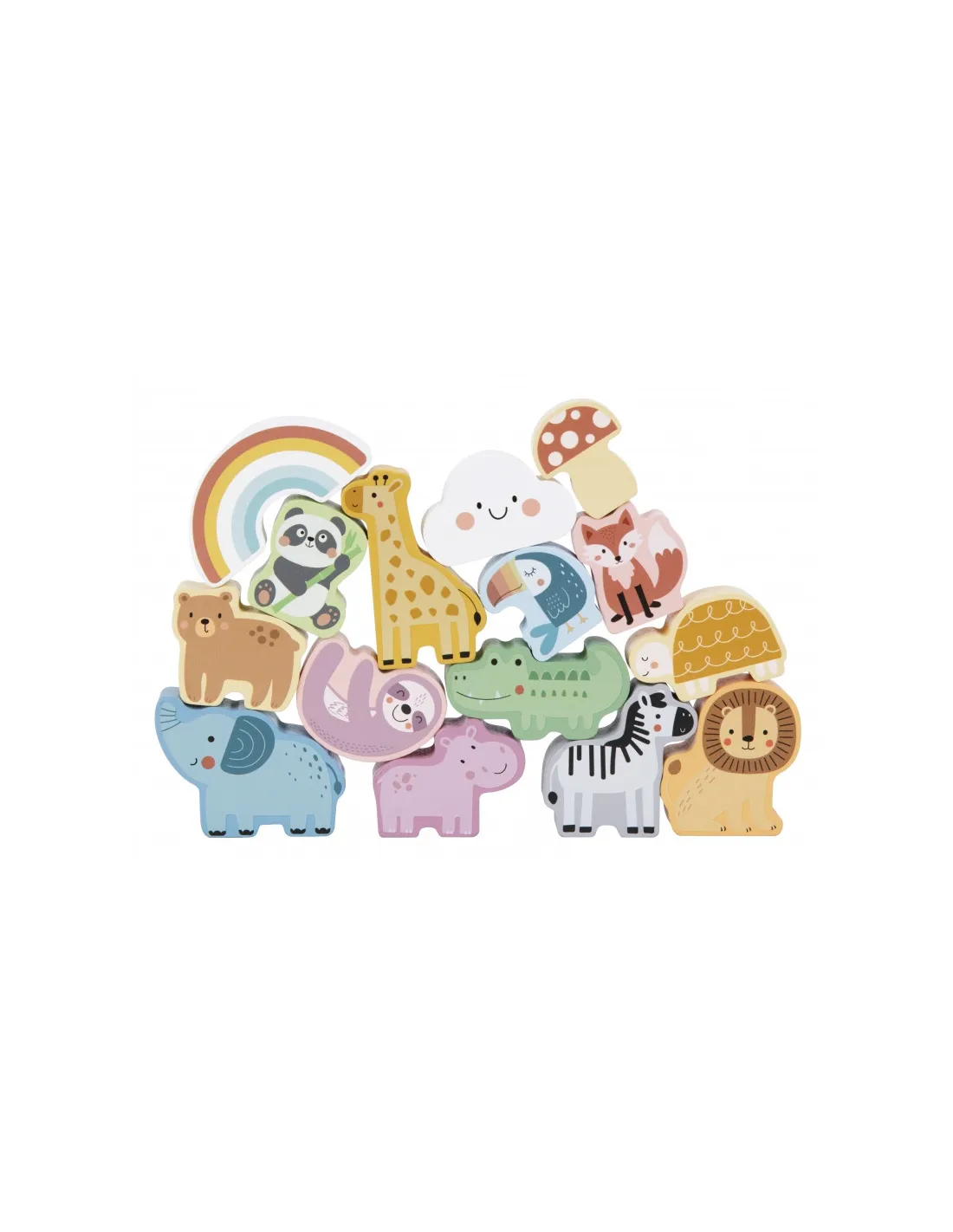 - - 15 medinių figūrėlių (gyvūnų, grybo, vaivorykštės, debesies)
