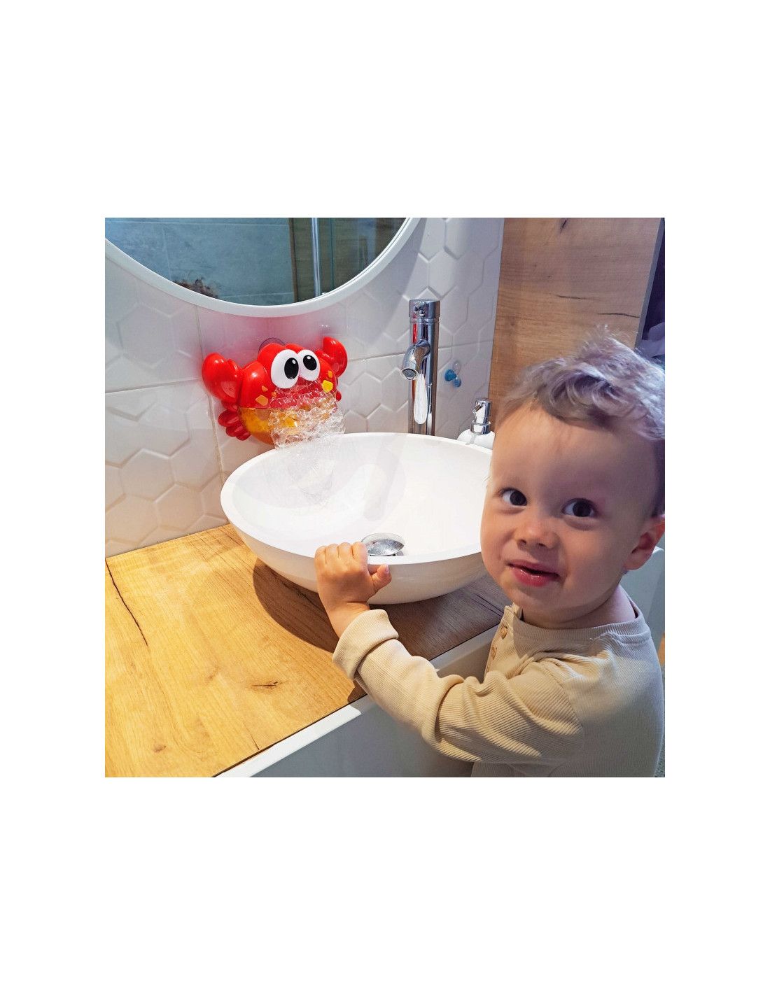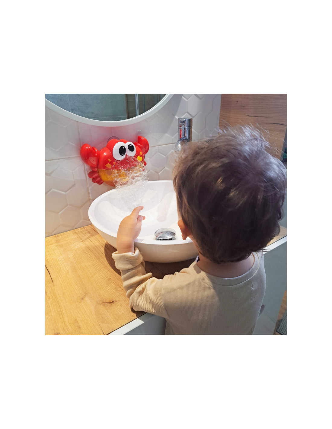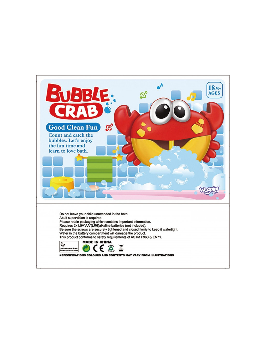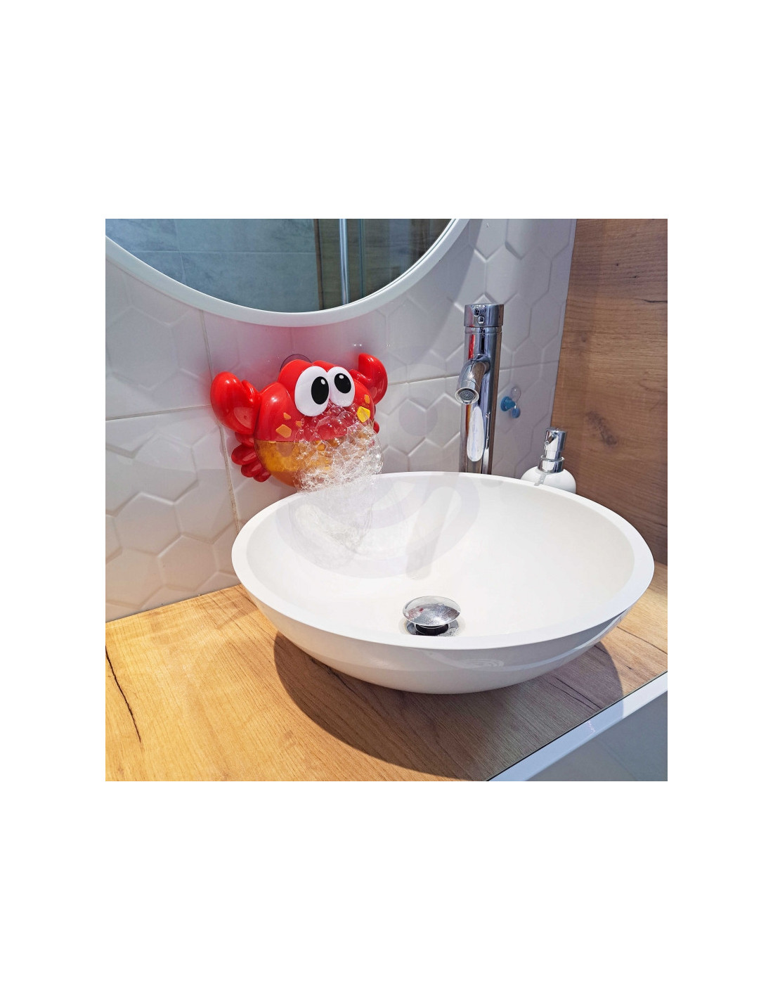 Linksmasis WOOPIE prekės ženklo putųkrabas bus labai smagus jūsų vaikui, nes kiekvienas vaikas maudydamasis vonioje mėgsta putas! Žaislą paprasta naudoti. Pripildykite krabą vandens ir skalbimo skysčio mišiniu ir pritvirtinkite prie siurbtukų saugiu atstumu nuo vandens stalo (žaislas nėra atsparus vandeniui! Būkite atsargūs, kad jo nesušlaptų ir neužlietų) . Tada paprasčiausiai įjunkite įjungimo mygtuku ir štai - žaislas automatiškai išleidžia purias putas. Viską lydi garso efektai - linksma melodija (melodiją galima bet kada išjungti). Žaislas veiksmingai leis laiką ir paskatins kiekvieną vaiką maudytis.