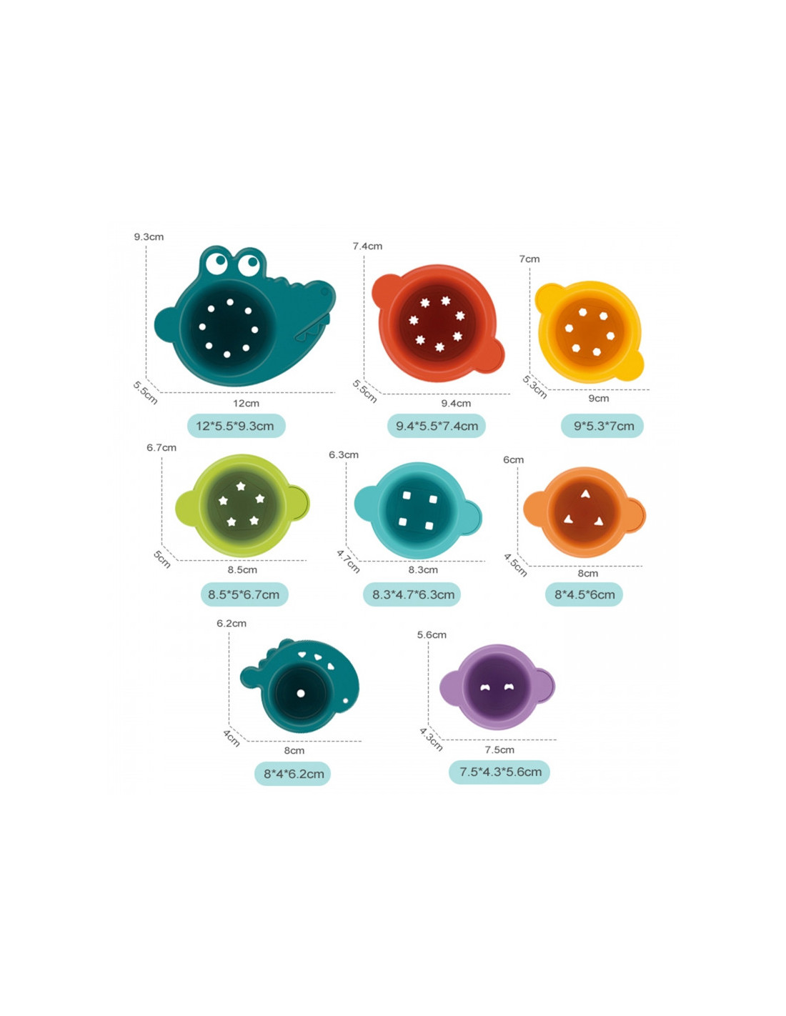 - - rinkinį sudaro 8 perpildymo puodeliai- vienas iš jų yra krokodilo formos,