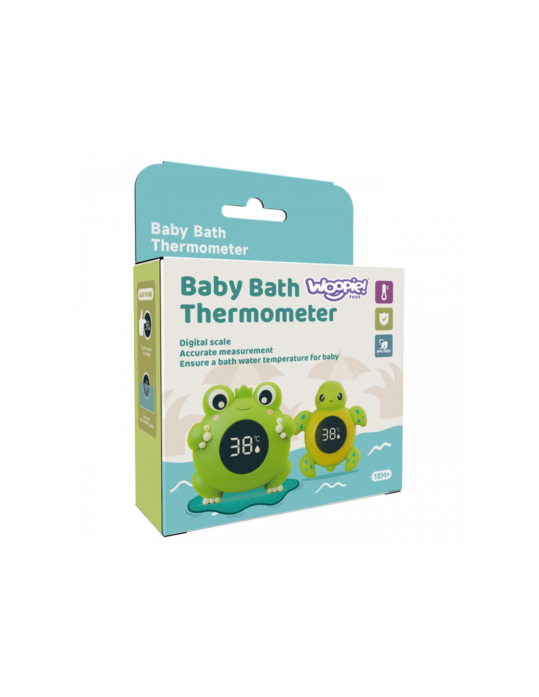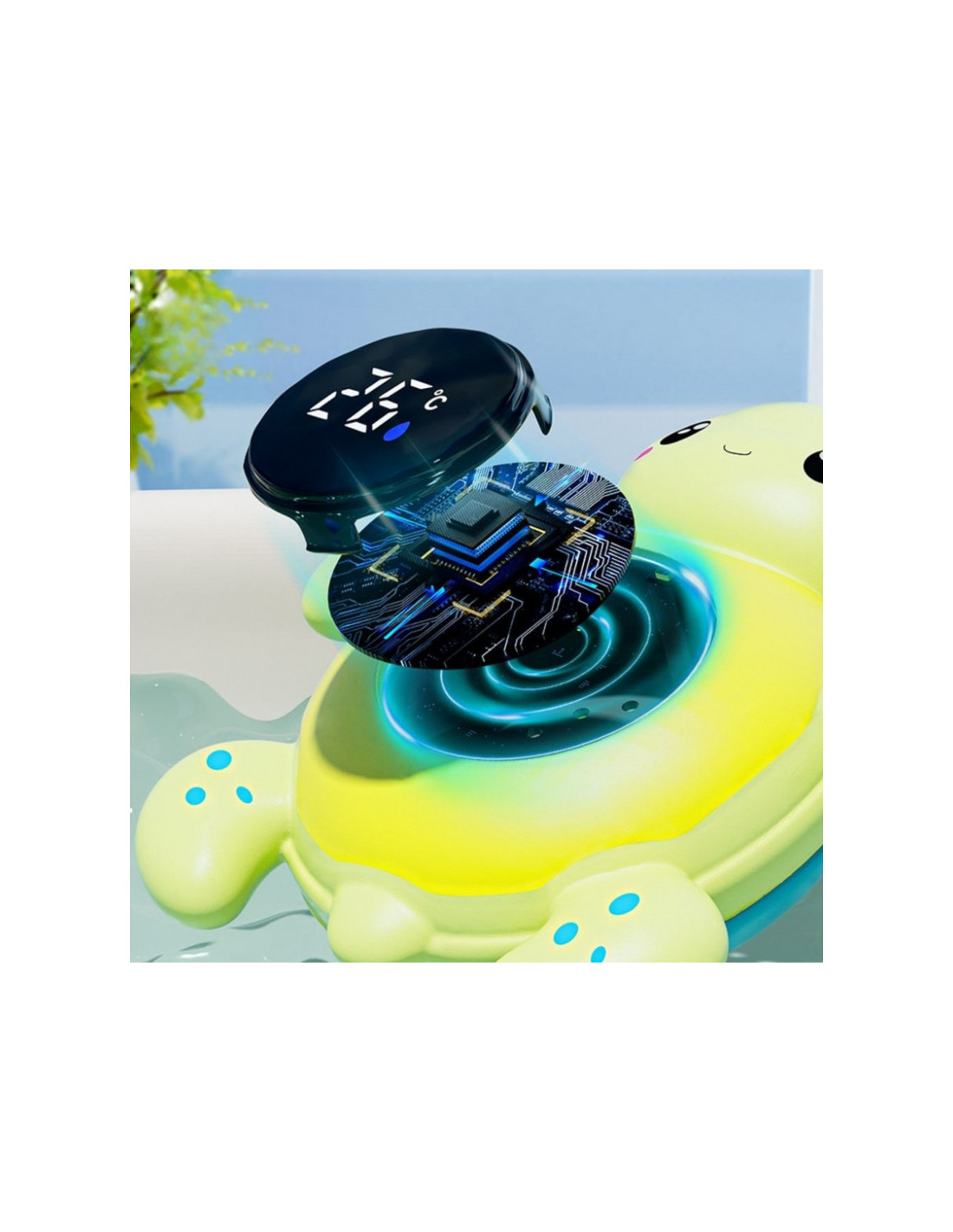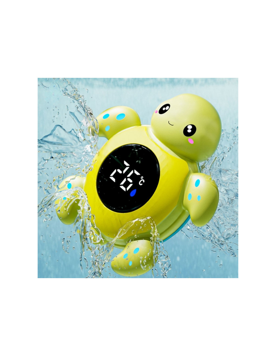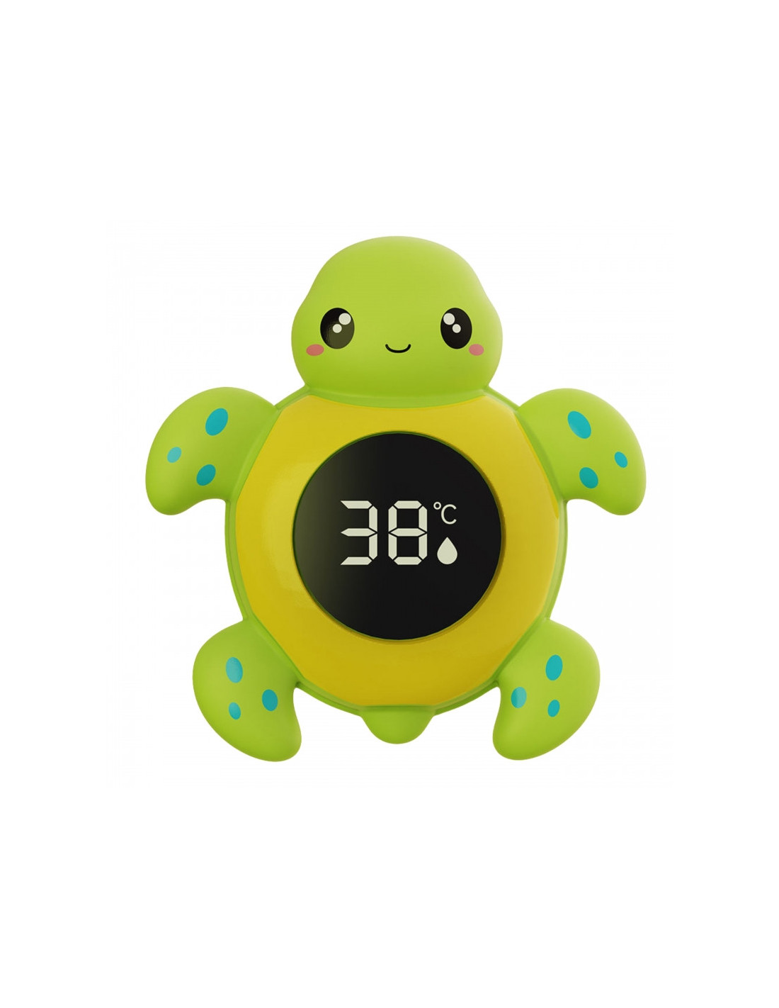 Užtikrinkite savo vaiko saugumą ir komfortą kiekvienos maudynės metu! Dėl mielo vėžliuko formos termometro matuoti temperatūrą bus smagu. Tinka naudoti vonioje, baseine arba kambario temperatūrai matuoti. Turi lengvai įskaitomą skaitmeninį ekraną ir įspėjamąją spalvotą temperatūros signalo funkciją.