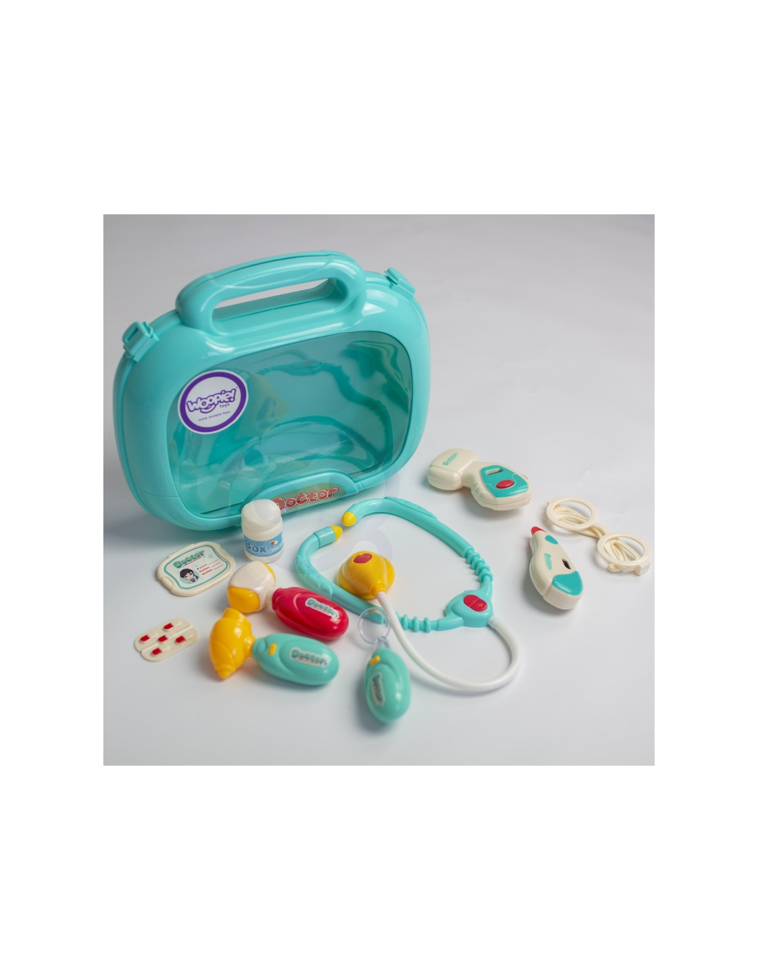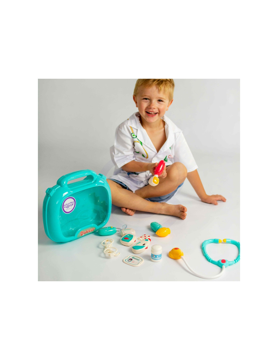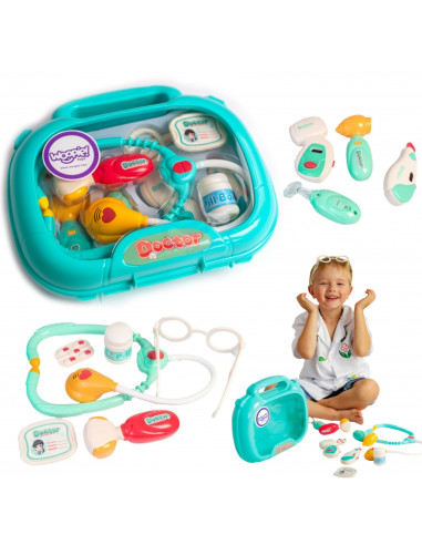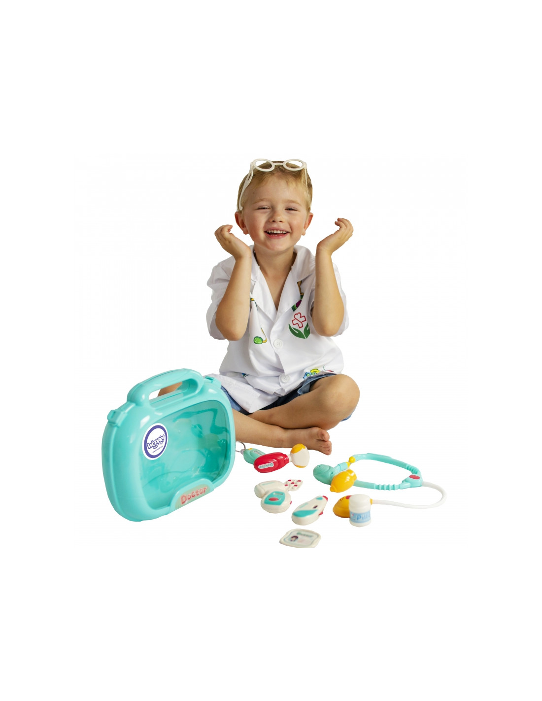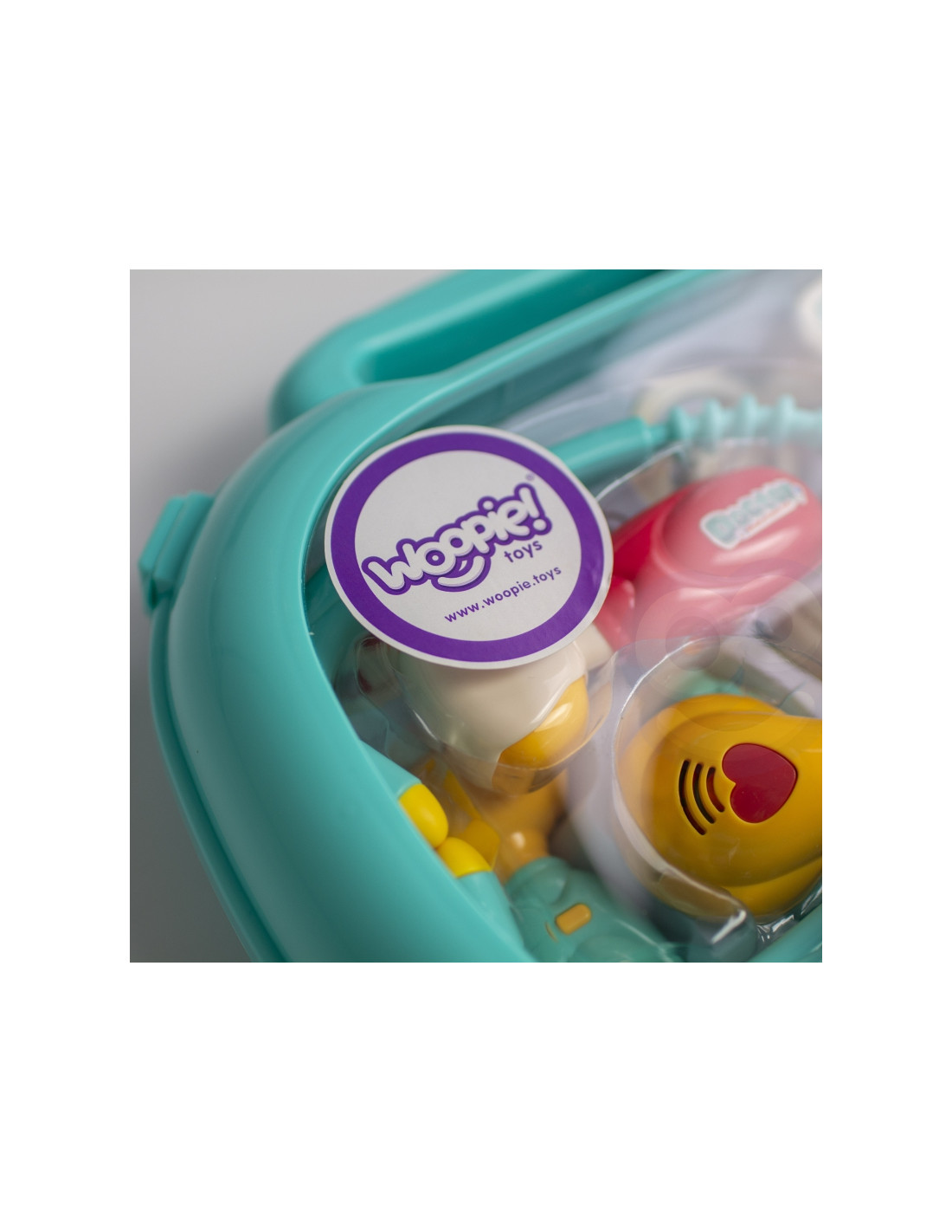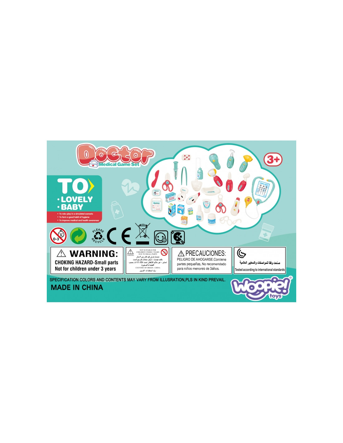 Woopie “ mažojo gydytojo rinkinys – kiekvieno mažo vaiko, norinčio tapti gydytoju, svajonė! Rinkinį sudaro daugybė gydymo priemonių, m.in. stetoskopą , kraujospūdžio matuoklį , termometrą ir daugybę kitų priedų. Kiekvienas rinkinys turi specialią funkciją , kuri leis jūsų vaikui pasijusti tikru gydytoju . Stetoskopas turi plačias, patogias ausines ir švieselę , kuri pulsuoja tyrimo metu ir skleidžia širdies plakimo garsą . Kraujospūdžio matuoklis rodo tris matavimus ir turi ekraną su foniniu apšvietimu . Termometras rodo vieną iš trijų temperatūrų (reguliuojama ratuku) ir paryškina rezultatą , o otoskopas ir rankinis veidrodėlis turi švieseles . Visa tai supakuota patogiame nešiojimo dėkle su rankena. Vaikai gali lavinti savo vaizduotę ir įsijausti į gydytojo ar paciento vaidmenį!