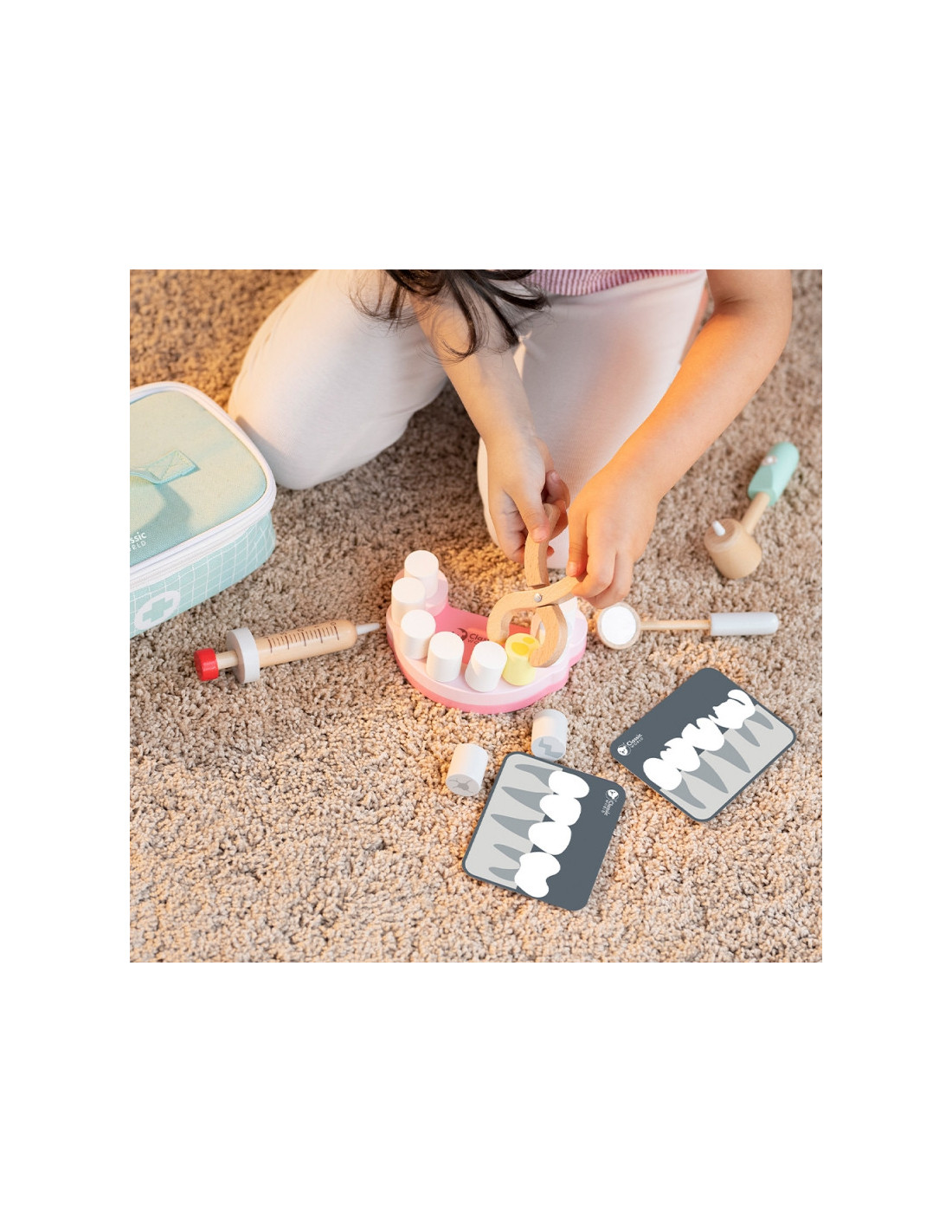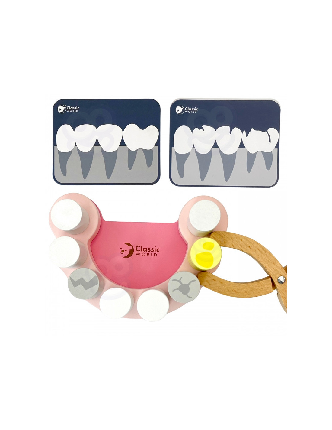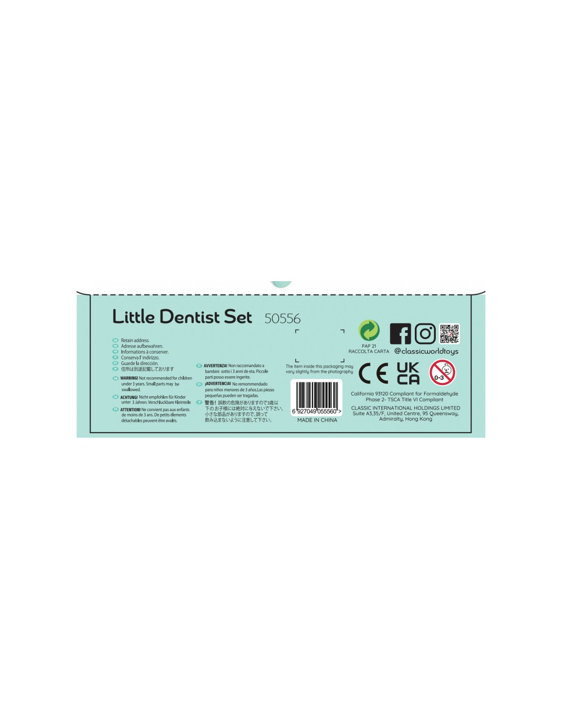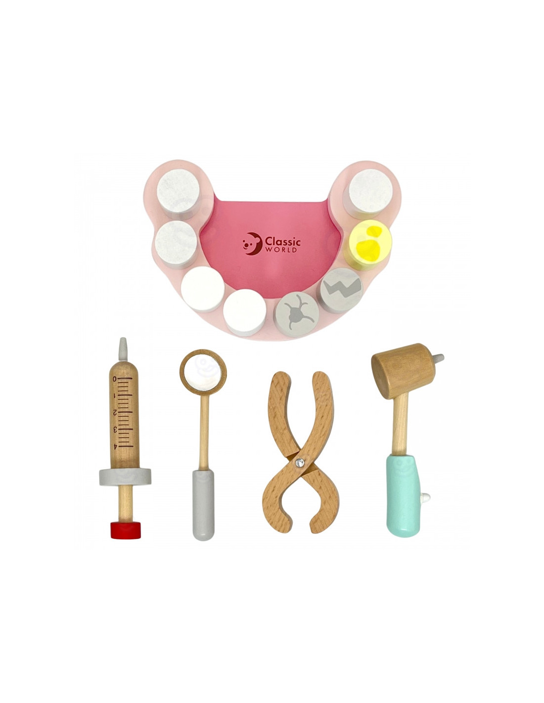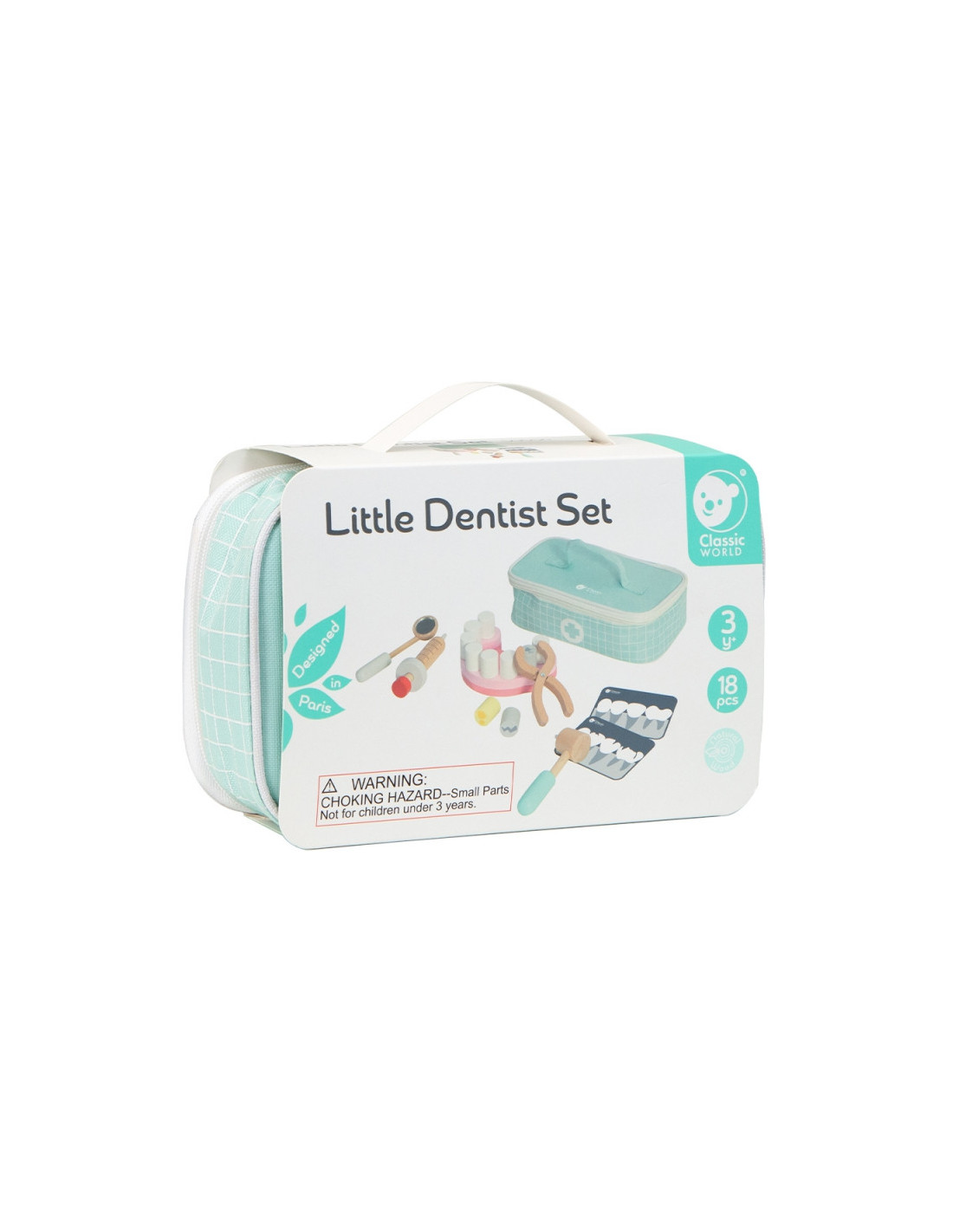 CLASSIC WORLD prekės ženklomediniai įrankiai mažajam odontologuimaišelyje. Šiame rinkinyje yra viskas, ko reikia jūsų mažajam daktarui žaisti odontologą. Būsimieji gydytojai gali atlikti injekcijas, šalinti dantis ir tikrinti savo pacientų dantų būklę. Žaidimas "Dantų gydytojas" yra ne tik vienas iš vaidmeninių žaidimų, bet ir moko apie higieną ir jos stokos pasekmes. Jis taip pat moko empatijos ir įsijautimo, kurie labai svarbūs socialiniuose santykiuose. Jis skatina vaizduotės vystymąsi ir moko spręsti problemas.