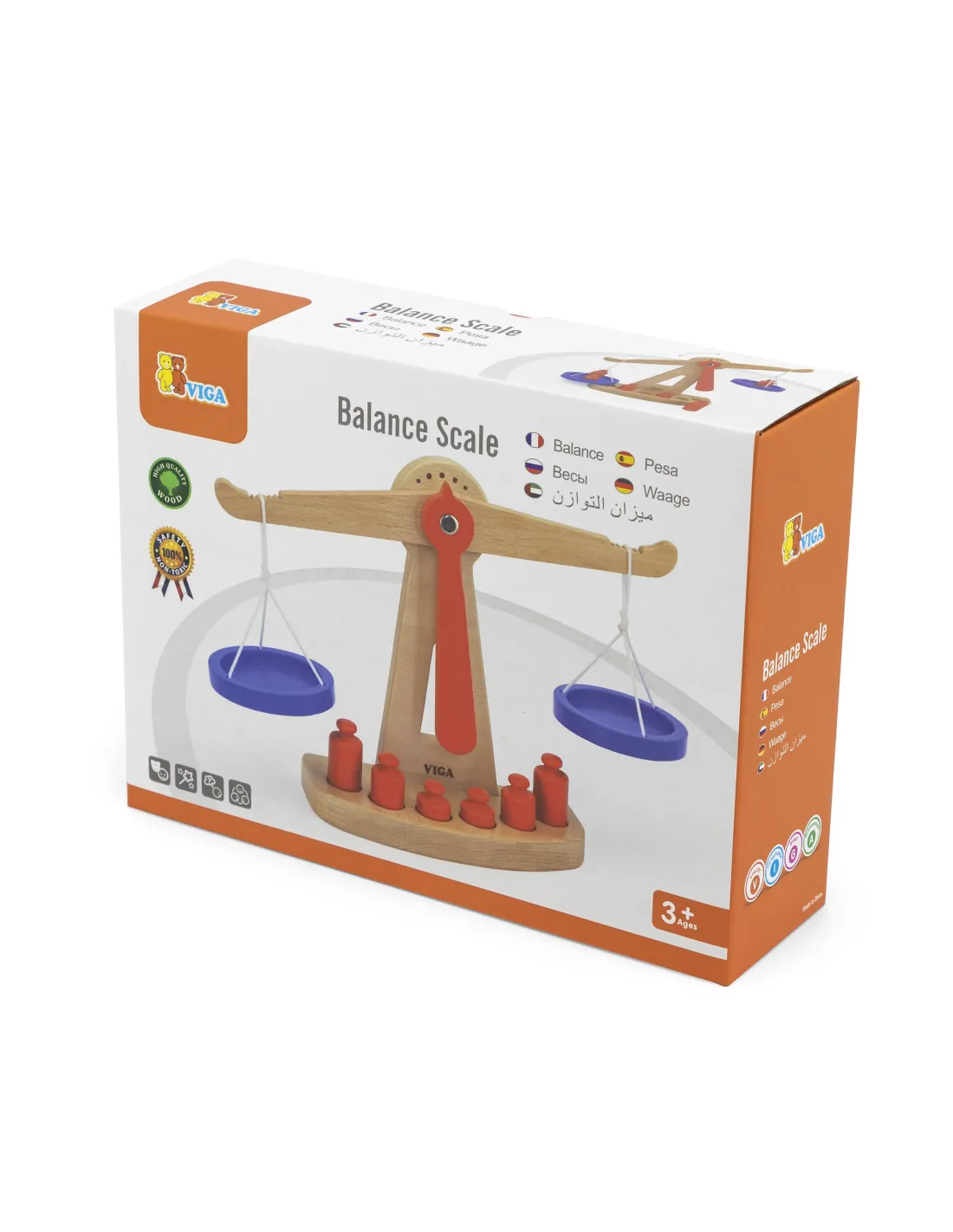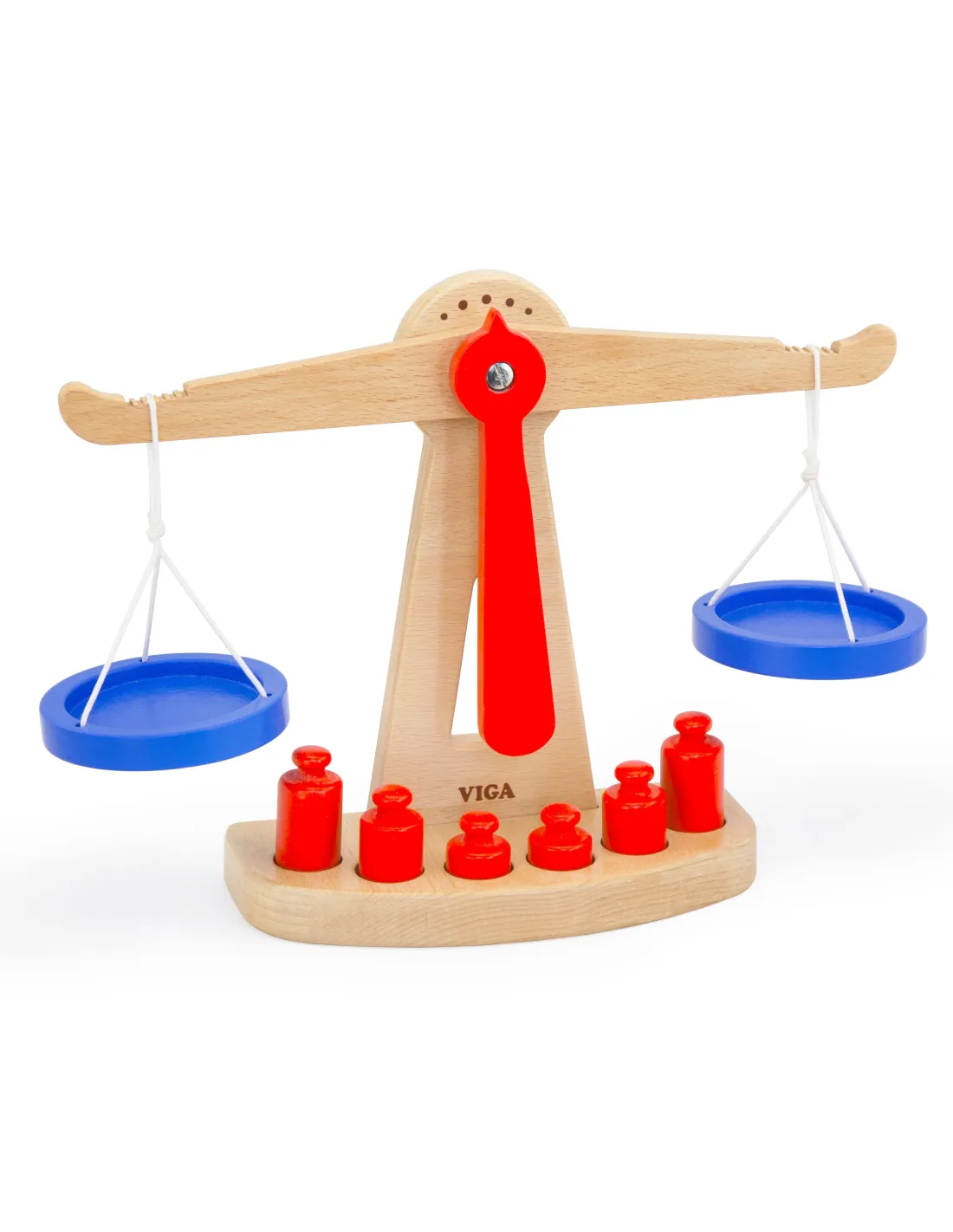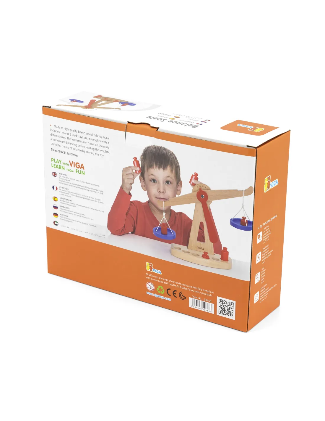 Medinės parduotuvės svarstyklės su svarstyklės mechanizmu, pagamintos žinomo žaislų gamintojo „Viga Toys“ vaikams nuo 3 metų, puikiai tinka naudoti darželyje ir namuose.