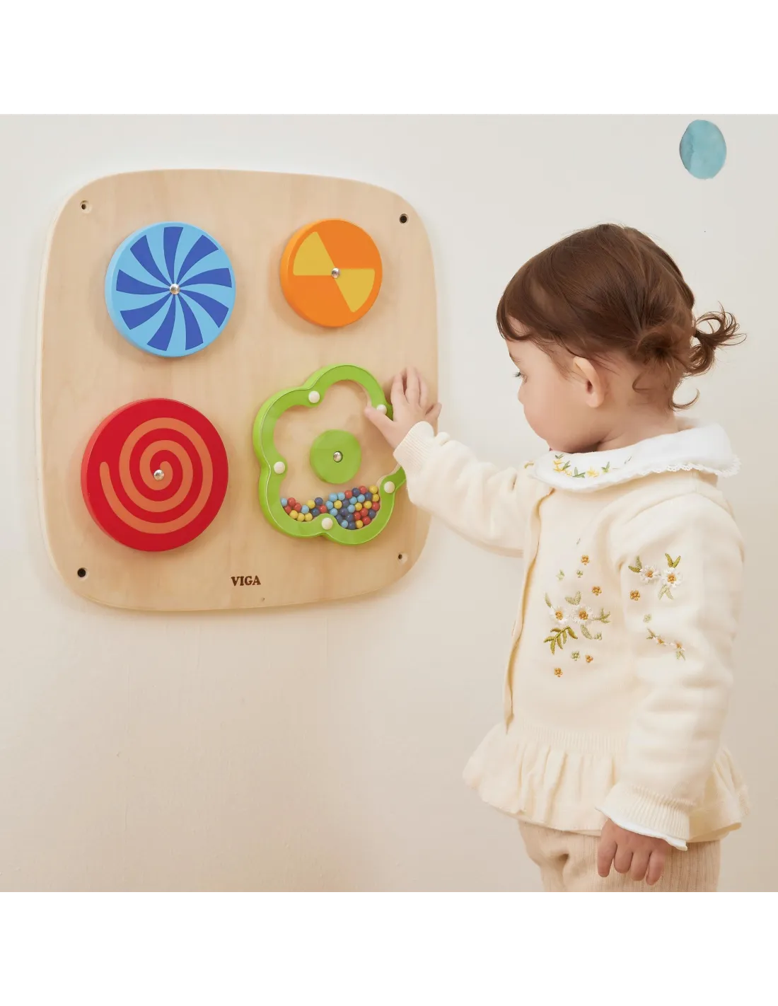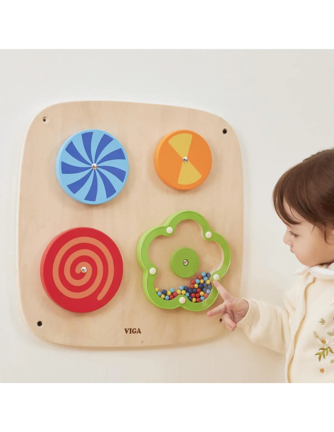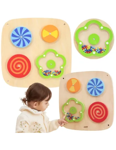 Transport your child to the fascinating world of optical illusions with this unique wall panel from VIGA ! Four rotating discs mesmerize with changing patterns, while a flower filled with wooden beads rewards every hand movement with a pleasant, rustling sound . It's the perfect combination of carefree play and intensive training for your little one's coordination and visual perception. Clever wall mounting helps keep the room organized while creating a professional sensory corner your child can always access. Durable, safe, and eco-friendly construction ensures this educational adventure will last for years to come.