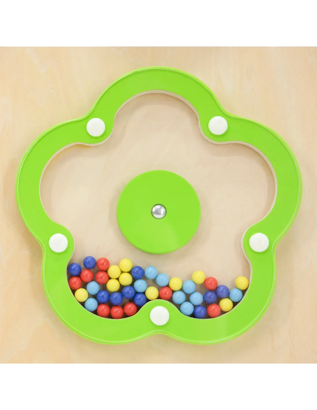 - - "Flower" Disc: A transparent flower-shaped element filled with colorful beads that rattle when turned.