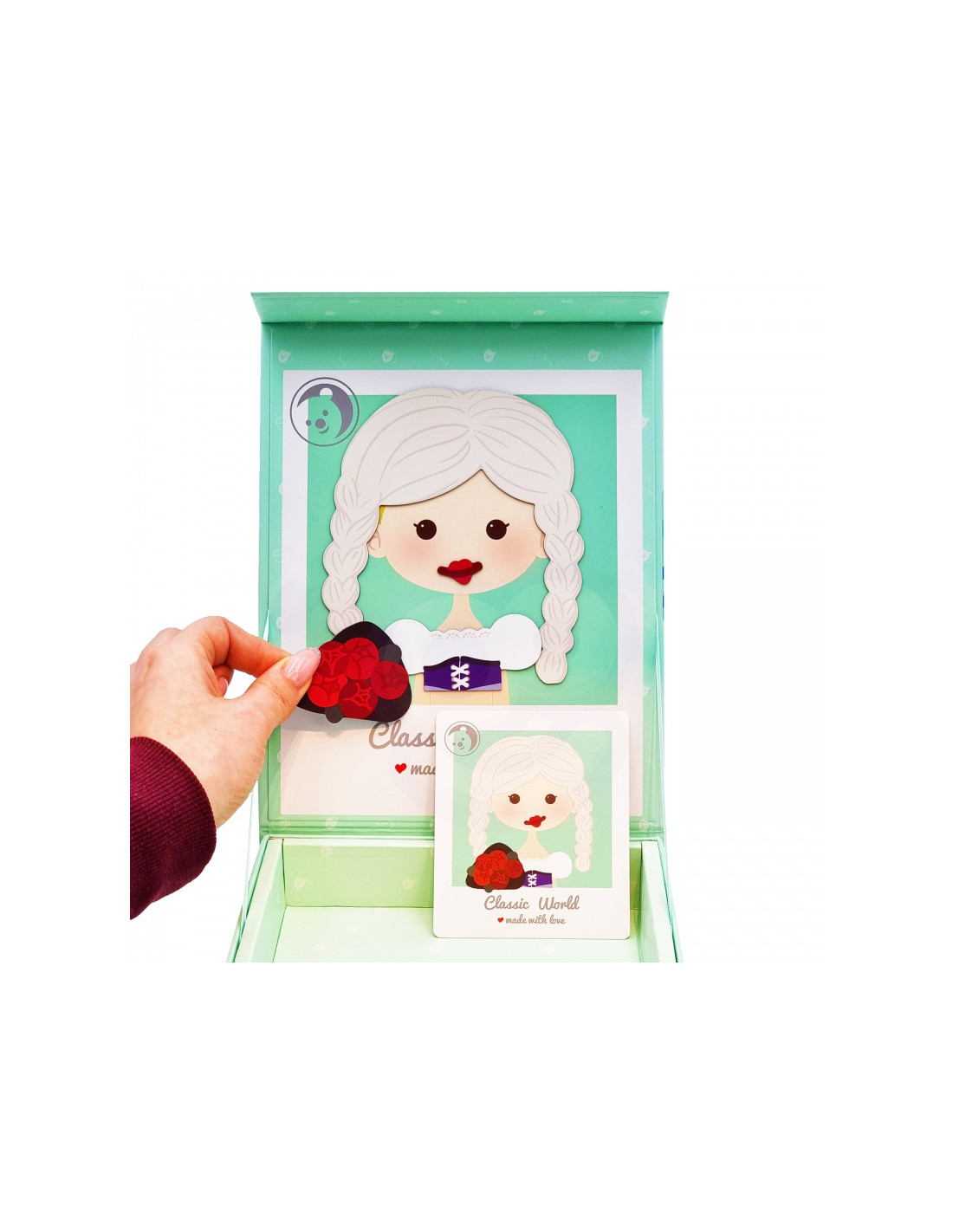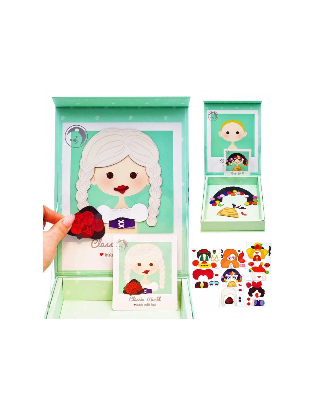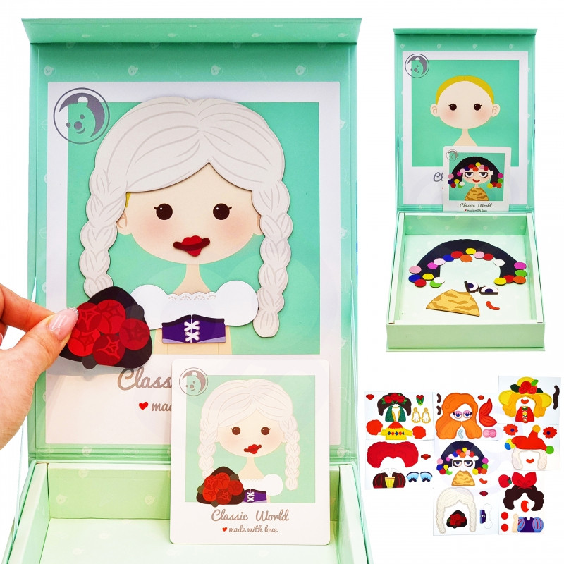 Ši magnetinė CLASSIC WORLD dėlionė užims jūsų vaiką valandų valandas. Rinkinį sudaro 44 detalės, įskaitant 8 korteles su mergaičių piešiniais. Vaikai gali laisvai derinti detales ir sukurti įvairius šaunius, madingus drabužius bei įvaizdžius. Stiprūs magnetai užtikrina, kad nė viena detalė nenukris. Pakuotė patogi, todėl ją lengva pasiimti bet kur. Žaidimas lavins jūsų vaiko vaizduotę ir kūrybiškumą.