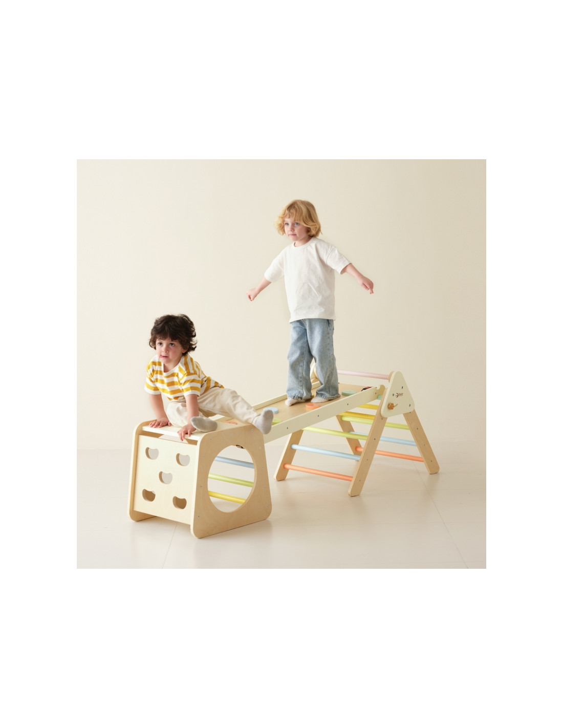 „Classic World“ medinis „Montessori 5 viename“ laipiojimo trikampio rinkinys yra unikalus pasirinkimas vaikams, kurie mėgsta aktyvų žaidimą, judėjimą ir fizinių įgūdžių lavinimą! Šis gražiai suprojektuotas rinkinys yra ne tik žaislas, bet ir priemonė, padedanti lavinti motorinius įgūdžius, pusiausvyrą ir koordinaciją. Pagamintas iš tvirtų, lygiai apdirbtų medinių elementų, jis suteikia saugią erdvę laipioti, čiuožinėti ir lavinti savo motorinius įgūdžius. Rinkinį galima naudoti ir kaip žaidimų aikštelę, ir kaip sporto salę, viename gaminyje atliekant penkias veiklos funkcijas ! Jis gali būti kopėčios, čiuožykla, tiltas, tunelis ir kliūčių ruožas . Dėl sulankstomos konstrukcijos ir lengvos konstrukcijos jį galima lengvai perkelti ir pritaikyti prie turimos erdvės – tiek namuose, tiek darželyje, tiek žaidimų kambaryje. Universali, natūrali išvaizda su pasteliniais akcentais puikiai dera prie bet kokio interjero, skatina mažuosius būti aktyvius ir judėti žaidžiant.