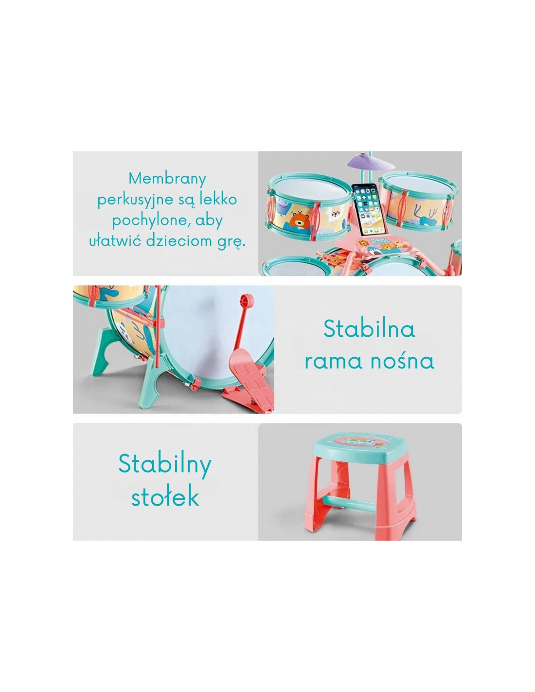 WOOPIE edukaciniai būgnai vaikams 5 būgnai 1 cimbolas + gyvūnų taburetė