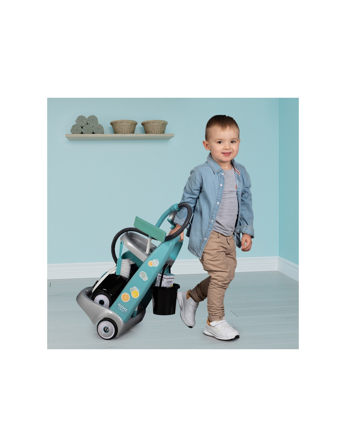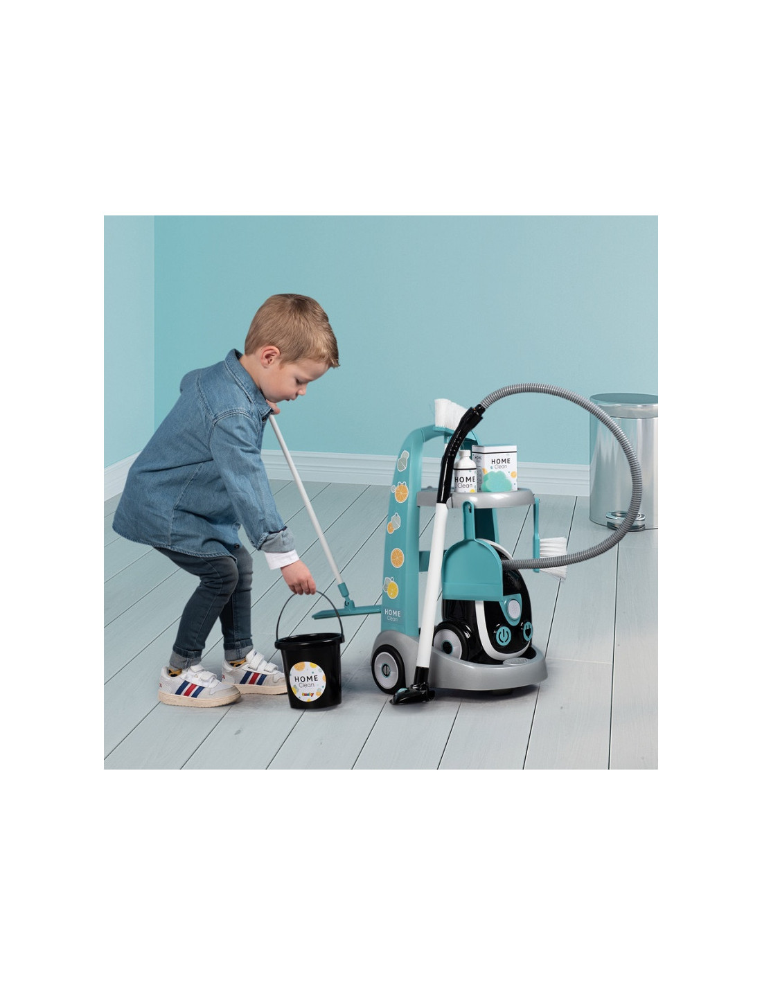 - - Į rinkinį įeina 9 priedai, pavyzdžiui, semtuvėlis, šluostė, šepetys, šluostė, kempinė, kibiras ir valymo priemonių imitacija.