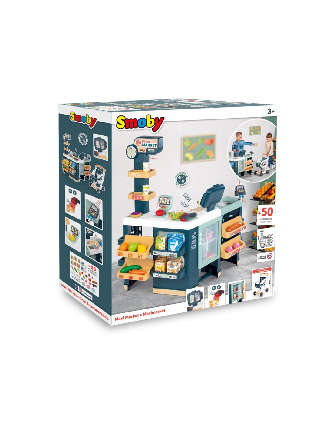 „ Smoby “ „Maximarket“ – fenomenalus žaislas vaikams, kurie mėgsta žaisti apsipirkimą. Prekybos centre vaikai gali pardavinėti, apsipirkti, skaičiuoti, rūšiuoti prekes ir, svarbiausia, smagiai praleisti laiką! Turguje yra kasos aparatas su skaitytuvu su šviesomis ir garsais, mechaninės svarstyklės ir kreditinių kortelių skaitytuvas. Visi šie įrenginiai primena tuos, kuriuos vaikas galėtų matyti tikroje parduotuvėje. Pirkinių vežimėlis pravers apsiperkant, o žaisliniai pinigai reikalingi prekėms apmokėti. Laikrodžio dėka kiekvienas mažas verslininkas gali nuspręsti, kada atidaryti ir uždaryti parduotuvę.